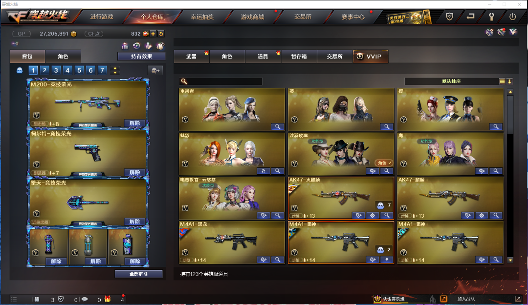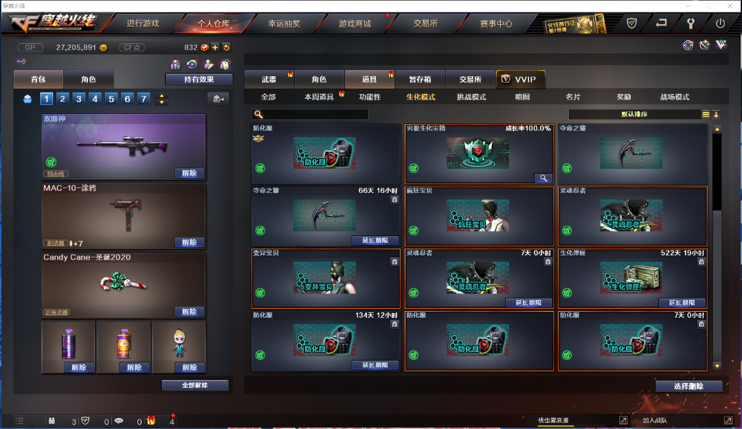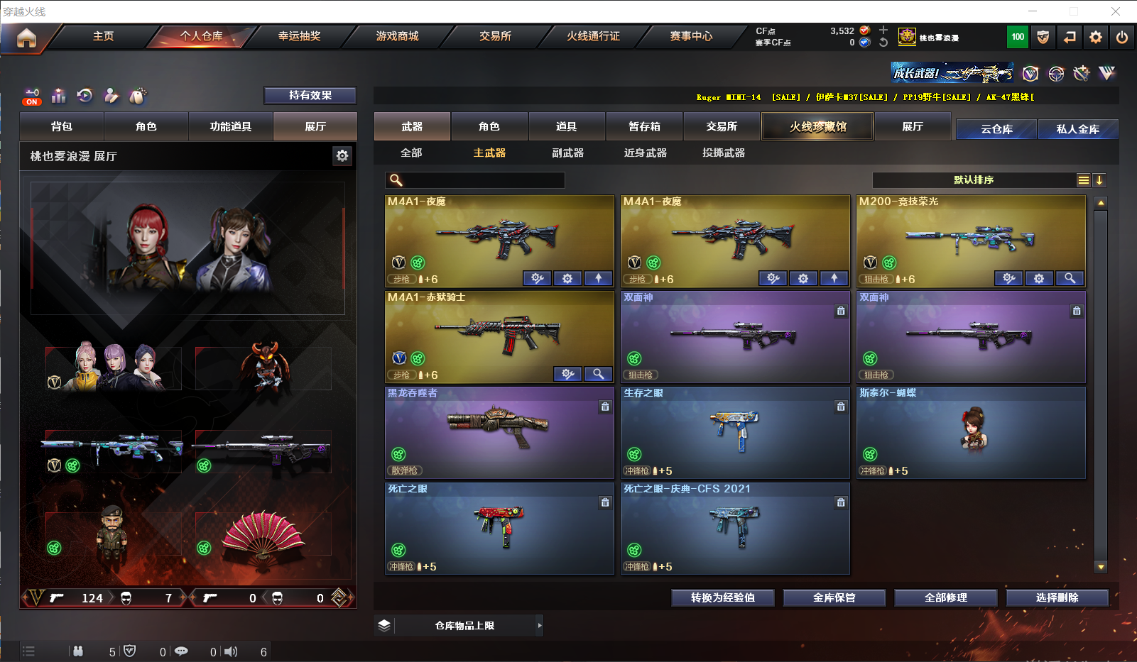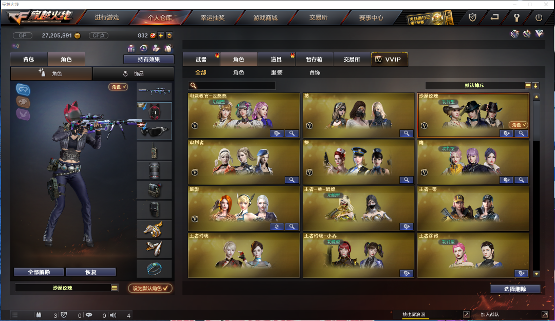 角色:4防沙漠玫瑰 4防云悠悠 四防王者玲珑-小乔 皮肤:时空猎手 武器:王者星神 六盘龙 六烈龙 竞技荣光全套 2夜魔 炼狱-迷你小钢 斯泰尔-蝴蝶 加特林-炼狱 轻型军用手斧-镜 迷你生化手雷 黑桃战神手雷 电竞装甲全套 道具:机枪弹夹 冲锋枪弹夹 生化弹夹 防化服 夺命之镰 变异宝贝;沙漠玫瑰,电竞教官-云悠悠,RPK-盘龙,QBZ03-金色蔷薇,Scar Light-白虎,