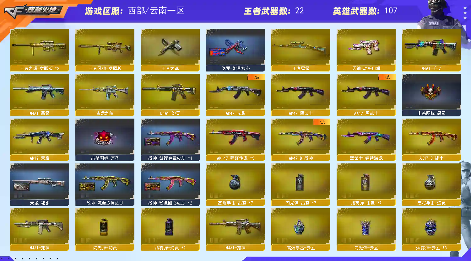 西部号 107V🔥传说灵眸/破晓/影煞/幻影/幻神+电流/王者风神/星霆/蝶刃🔥大唐/流光/高能皮四防 【云南一区登录】【炫金稀有顶1V介意者勿租】【恶意投诉、撤单不想玩了租错号了等非帐号问题1律拉黑】【此号已备案请勿以身试法】【开挂必究账号价值超高】详细武器请看下方 【重要套装】幻灵套装/云龙套装/四防角色 【重要角色】传说影煞/_炫/机械姬/关小雨/隼/_岚兮儿/_葵/_迷迭香/王者凌霄/王者潘多拉/王者涂鸦/王者-葵-貂蝉/乔伊教练/铁骑荣耀/灵狐者-黄金海岸/云海玲珑 【传说武器】传说灵眸/传说破晓(2) 【英雄武器】_M200-幻神/Barrett-毁灭(2)/Barrett-极光/王者之怒-觉醒版(2)/AWM-天龙/AWM-裁决/M4A1-雷神(3)/M4A1-死神/M4A1-黑龙/M4A1-千变/M4A1-黑骑士(2)/M4A1-幻灵/M4A1-雷霆/M4A1-猎神/王者之魄-觉醒版/王者之势-觉醒版/王者之幻-觉醒版/_Scar Light-白虎(2)/M14EBR-玄武/AK12-天启/AK47-火麒麟(2)/AK47-无影/AK47-黑武士/AK-47-猩红传说(5)/AK47-B-战士/AK47-B-战神/QBZ03-云龙/QBZ03-金色蔷薇(2)/超新星-悦享-觉醒版/烈火-动感闪耀/RPK-盘龙/汤姆逊-烈龙(6)/加特林-炼狱/炼狱-悦蓝-觉醒版/COP 357-云龙/COP 357-幻灵/雷霆之契/天神-动感闪耀/沙鹰-天神/沙鹰-修罗(3)/云龙扇/麒麟刺/龙啸/擎天/王者之击-觉醒版/屠龙-动感闪耀/屠龙/雷霆之锋(2)/幻灵之锋(2)/王者之锋-觉醒版(2)/炽芒蝶刃(2)/手雷-动感闪耀/高爆手雷-云龙/高爆手雷-幻灵/高爆手雷-雷霆(7)/烟雾弹-云龙(3)/烟雾弹-幻灵(2)/烟雾弹-雷霆(7)/闪光弹-云龙/闪光弹-幻灵/闪光弹-雷霆(7)/超新星-热带奇洋/黑武士-锦绣游龙/G36C-幻影/王者芳薇-觉醒版/王者风神-觉醒版/烈龙-云海游龙/龙啸-热带奇洋/龙啸-烈火龙威/擎天-云海游龙/手雷-热带奇洋/手雷-云海游龙 【王者武器】青龙之魄/王者星霆/王者之魂/烟雾弹-雷霆王者/高爆手雷-雷霆王者/闪光弹-雷霆王者 【小人枪】白虎-迷你小艾/毁灭-孙三炮/COP-旗袍/魔能飞环-曼陀罗(2)/冰火魔兽(2)/迷你牛牛/闪光弹-小乔/烟雾弹-Orange-虎牙娘/生化手雷-小钢/迷你生化手雷 【其他重要武器】炫金黑龙/炫金毁灭/炫金天龙/M4A1-英雄-能量核心/冰龙粉碎者-白马银枪/激光毁灭者III-白马银枪/激光毁灭者III/火麒麟-桃园结义/QBZ03-吕布/Barrett-翔龙/巨龙咆哮Ⅲ(4)/斯泰尔-CFS2017纪念版/神圣爆裂者-末日/Spas-12-黑金/COP 357--绚樱(3)/丛林匕首-枪王排位(2)/幻影双斧-枪王排位/丛林匕首-卧龙(4)/军用铁锹-飞龙在天/尼泊尔军刀-9周年/尼泊尔军刀-战龙/鹰爪-枪王排位/虹光丛林匕首-枪王排位/猫猫手套/无畏之矛/闪光弹-枪王排位(7)/胜利奖杯烟雾弹-枪王排位(3)/红色诅咒娃娃手雷/手雷-能量核心/胜利奖杯手雷-枪王排位/胜利奖杯闪光弹-枪王排位(2) 【重要武器皮肤】幻神-电流骇客 皮肤/毁灭耀金皮肤/毁灭-黑大圣皮肤/毁灭-航天科技皮肤/极光-能量核心/天龙-CFSTAR/天龙-秘银/裁决-流光秘银/火麒麟-CFSTAR/火麒麟-大唐荣光/无影-能量核心/无影耀金皮肤/AK47-黑武士-361/AK-47-雷神/M4A1-千变-孔明皮肤/雷神-宇航兔皮肤/雷神-暗月/雷神-能量核心/雷神-维纳斯皮肤/M4A1-雷神-新春神龙皮肤/雷神-高能霹雳 皮肤/黑骑士-暗月/黑龙-暗月/黑龙-能量核心/战神-流金岁月皮肤/战神-紫绶金章皮肤/战神-粉色甜心皮肤/炼狱-电子连击皮肤/修罗-CFSTAR/修罗-能量核心/屠龙-星火燎原 【重要光效】加特林-炼狱金色光效/炼狱-悦蓝金色光效/王者之幻金色光效/王者之影金色光效/王者之怒金色光效/王者之锋金色光效/王者之魂金色光效/王者之魄金色光效/AK47-火麒麟蓝色光效/AN94-超新星蓝色光效/AWM-天龙蓝色光效/M4A1-死神蓝色光效/RPK-盘龙蓝色光效/加特林-炼狱蓝色光效/屠龙蓝色光效/巴雷特-毁灭蓝色光效/擎天蓝色光效/沙鹰-修罗蓝色光效/麒麟刺蓝色光效/龙啸蓝色光效/AK47-黑武士蓝粉色光效/M4A1-雷神蓝粉色光效/M4A1-黑龙蓝粉色光效/加特林-炼狱蓝粉色光效/M4A1-黑龙红绿色光效/加特林-炼狱红绿色光效/屠龙红绿色光效/麒麟刺-红绿光效/M200-幻神紫橙光效/M4A1-雷神紫橙光效/加特林-炼狱紫橙光效/降龙紫橙光效/王者之势紫色光效/Barrett-毁灭绿色光效/加特林-炼狱绿色光效 【重要音效卡】Barrett-极光音效卡/M4A1-黑骑士音效卡/QBZ03-金色蔷薇音效卡/Scar Light-白虎音效卡/M4A1-雷神音效卡/Barrett-毁灭音效卡/屠龙-云海游龙音效卡/修罗-云海游龙音效卡 【重要戒指】8周年戒2/龙眼(死神)/龙眼(鹰)/真龙戒/16赛季纪念戒指-枪王耀金/17赛季纪念戒指-耀金/18赛季纪念戒指-耀金/20赛季纪念戒指-耀银/25赛季纪念戒指-耀铜(食指)/25赛季纪念戒指-耀铜(拇指)/26赛季纪念戒指-耀金(拇指)/26赛季纪念戒指-耀金(食指) 【拥有重要玩偶】;炽芒蝶刃,传说影煞,隼,RPK-盘龙,QBZ03-金色蔷薇,G36C-幻影,M200-幻神,