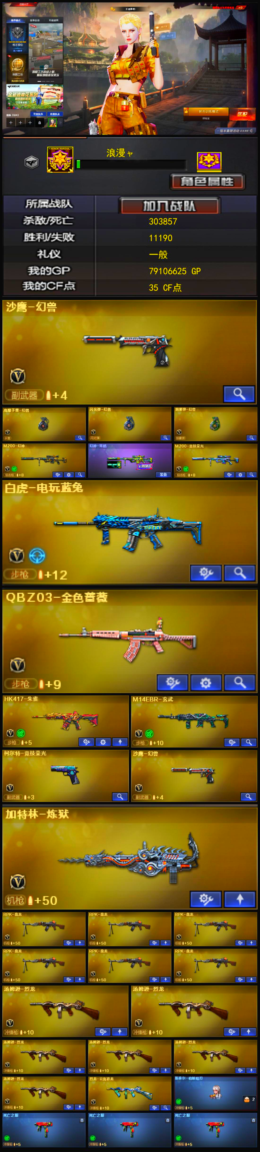 可排位104V/M200-幻神+青鹤+光效/6盘6烈+QBZ蔷薇/竞技荣光套+生化爆破全装;RPK-盘龙,QBZ03-金色蔷薇,M200-幻神,