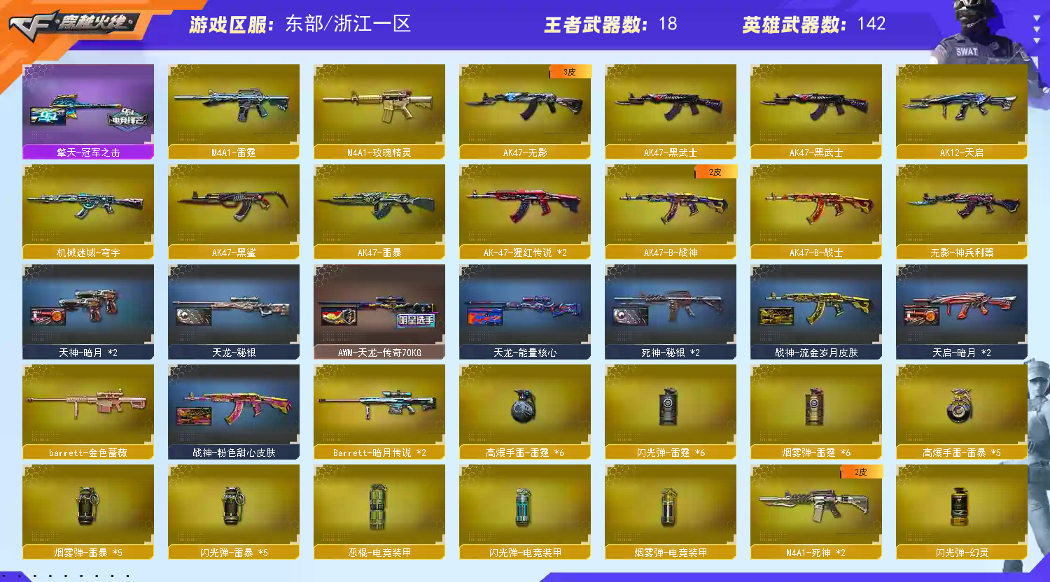 传说影煞辉光圣灵|M200幻神荣耀世冠白鲨王者星霆|147v6烈蝴蝶毒蜂|雷霆雷暴朱雀|9音效生化爆破全装 东部战区合区大区(安徽一区、福建一区、上海一区、上海二区、浙江一区、浙江二区、江苏一区、江苏二区、教育大区、移动专区)登录的时候选择浙江一区 【编号】:ZJ285 【角 色】:传说影煞、王者鹰、关小雨、蝴蝶、葵、零、迷迭香、晴雅、审判者、王者葵貂蝉、王者零国色天香、王者迷迭香、王者瞳闭月羞花、王者葵惊若翩鸿、王者零华冠礼服、樱、炫、隼、魅影、空、灵魂在职业经理、幽、职业选手(绝迹语音包)、风暴女、救世主-X、蜀雪、铁骑荣耀、影舞者-X、8周年戒指、双蛇戒指、双龙戒指 【主 武】:传说圣灵、传说辉光、幻神(冠军白鲨、音效卡)、王者星霆、6烈蝴蝶毒蜂、Barrett朱雀、白虎电玩蓝兔、QB幻兽、雷暴、雷霆、火麒麟(传奇EV、冠军之心、AG、STAR)、黑龙、雷神(冠军之魄、宇航兔)、黑骑士X2(白马银枪)、无影、死神(秘银)、黑骑士、龙血、黑武士锦绣游龙、超新星热带海洋、QB金色蔷薇(白鲨)、猎神、烈火、天龙(秘银)、毁灭(星空)、裁决、极光、Barrett金色蔷薇、炼狱X2、炼狱风暴、炼狱悦蓝、毁灭征服者、冰龙粉碎者、机甲撕裂者、激光毁灭者、圣炎切割者、深渊巨龙咆哮、神圣爆裂者、试炼破坏者、苍雷、金魔等各种活动武器 【副 武】:USP雷暴、天神(暗月)、COP雷霆、沙鹰幻兽X5、破空枪刃、柯尔特电竞装甲、阐释者、COP小青龙、胜利之火、大黄蜂 【近 身】:王者之锋X2、王者之击、王者之刺、炽芒蝶刃、屠龙、龙啸、擎天(冠军之击)、麒麟刺、尼泊尔雷霆、斩神刀雷暴、擎天竞技荣光、女皇利刃幻兽、黄金猫猫手套白鲨、丛林匕首-枪王排位、猫猫手套、激光短刃、冰火魔拳 【投 掷】:雷霆套装X7、幻兽套装X5、雷暴套装X5、电竞装甲套装、迷你生化手雷、深渊终结者手雷、胜利之光、高爆手雷-雷蛇、高爆手雷-SS 【道 具】:幻神音效卡、火麒麟音效卡、雷神音效卡、qb金色蔷薇音效卡、黑龙音效卡、黑骑士音效卡、极光音效卡、毁灭音效卡、、小红玩偶、暴躁猪猪玩偶、枪娘雷安娜玩偶、14个背包、AC(防弹衣+防弹头盔)、C4工具钳、手雷包、挑战弹夹、夺命之镰、变异宝贝、灵魂忍者、生化弹夹、防化服、机枪弹夹、冲锋枪弹夹、散弹枪弹夹、手枪弹夹、狙击枪弹夹、步枪弹夹、减少停顿包;USP-雷暴,炽芒蝶刃,传说影煞,隼,电竞教官-云悠悠,晴雅,QBZ03-金色蔷薇,