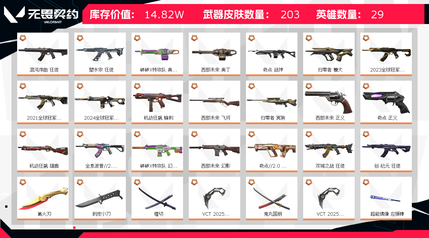 出现冻结,等几分钟重新登陆,会自助解冻郑重声明: !!!!!因无畏契约检测严格,为防止后台插件导致封号,请务必重启电脑!!!!本人商户多年,所属账号已在派出所备案,若出现账号封禁/毁号等情况,会马上与平台联系,平台会报警处理!请租客文明游戏,不要开挂或挂机!1.登陆界面稍等2分钟会上去(自动登录)老板不要着急,一次不行多来几次wegame界面要耐心等2分钟2.密令会自动输入如果一次不成功多来几次3..进入wegame后到弹短信验证处,关闭掉,重新下载无畏契约这个游戏即可成功上号,记住。这个方法百分百上号成功!就是进入wegame重新下载无畏契约游戏!!!百分百成功!!4.请及时续租不要挂机,到时不下 线,但是下一个会挤号导致挂机,所以请及时续租,导致禁赛的一律拉黑5.祝老板玩的愉快,喜欢可以收藏关注 14万库存极品多限定/vct2025爪刀/创纪元全套/21/23/24年限全套/1600r点;砰砰X特攻队 奥丁,西部未来 奥丁,奇点 战神,离火刃,剥皮小刀,镭切,VCT 2025 爪刀,