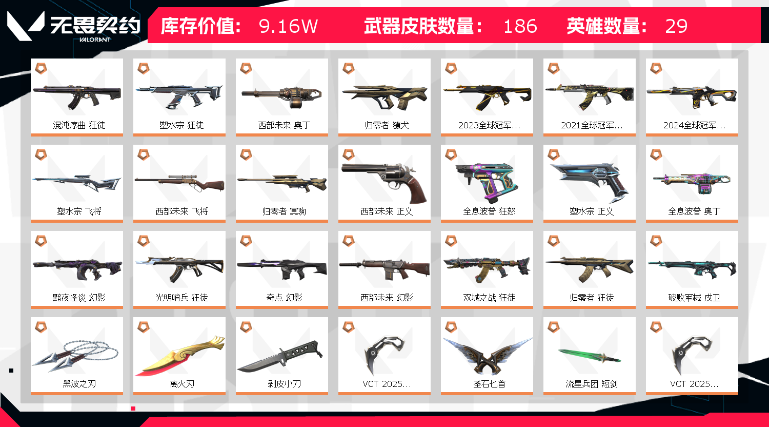 【卡面信息】先驱者卡面,分崩离析卡面,我眼中的世界卡面,双城之战拥抱卡面,情人节不死鸟卡面,超能偶像卡面,势不可挡芮娜卡面,万圣夜卡面,虹吸式咖啡壶卡面,情人节猎枭卡面,命运之手女皇卡面,逆向独行卡面,Luie卡面,许愿星砂卡面,双城之战谜团卡面,离火刃凰卡面,离火刃凤卡面;西部未来 奥丁,黑波之刃,离火刃,剥皮小刀,VCT 2025 爪刀,归零者 獠犬,盖亚的复仇 狂徒,