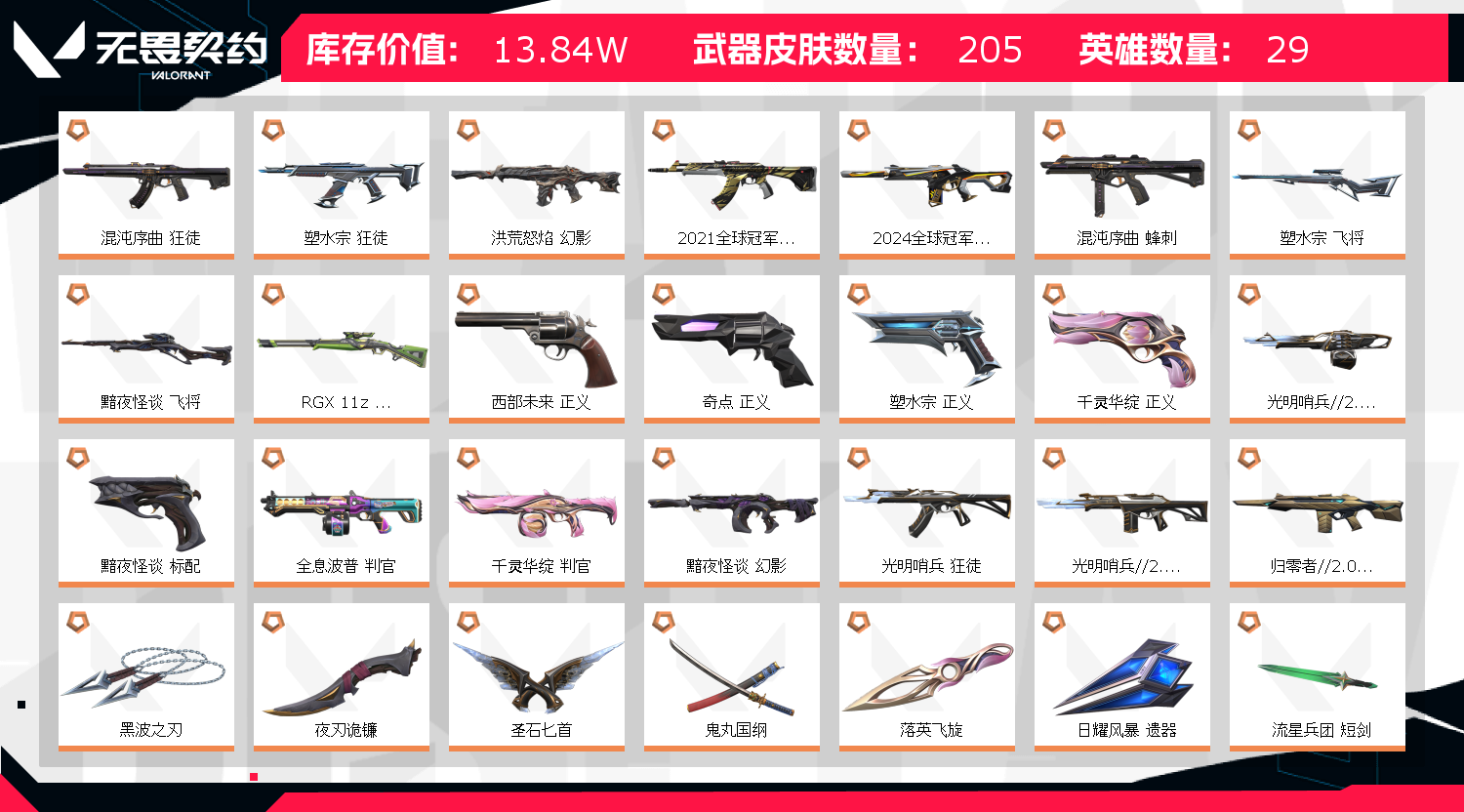 【拥有套装】混沌序曲套装(混沌序曲-狂徒,混沌序曲-冥驹,混沌序曲-蜂刺,混沌序曲-短炮,混沌大剑)千灵华绽套装(千灵华绽-幻影,千灵华绽-冥驹,千灵华绽-判官,千灵华绽--正义,落英飞旋)黯夜怪谈套装(黯夜怪谈-幻影,黯夜怪谈-獠犬,黯夜怪谈-飞将,黯夜怪谈-标配,夜刃诡镰)塑水宗套装(塑水宗-骇灵,塑水宗-狂徒,塑水宗-飞将,塑水宗-正义,黑波之刃)奇点2.0套装(奇点//2.0-狂徒,奇点//2.0-鬼魅,奇点//2.0-蝴蝶刀)般若假面2.0套装(般若假面//2.0-狂徒,般若假面//2.0-獠犬,般若假面//2.0-战神,般若假面//2.0-狂怒,鬼丸国纲)光明哨兵2.0套装(光明哨兵//2.0-幻影,光明哨兵//2.0-奥丁,光明哨兵//2.0-骇灵,光明哨兵//2.0-短炮,圣石匕首)2024全球冠军赛套装(2024全球冠军赛-幻影,2024全球冠军赛-战刀)2021全球冠军赛套装(2021全球冠军赛-狂徒,2021全球冠军赛-爪刀)RGX-11z-Pro//3.0套装(RGX-11z-Pro//3.0-莽侠,RGX-11z-Pro//3.0-正义,RGX-11z-Pro//3.0-爪刀)盖世英雄套装(盖世英雄-狂徒,盖世英雄-冥驹,盖世英雄-战神,盖世英雄-鬼魅,定海神珍)艾沃莉的梦之翼套装(艾沃莉的梦之翼-狂徒,艾沃莉的梦之翼-奥丁,艾沃莉的梦之翼-骇灵,艾沃莉的梦之翼-鬼魅,艾沃莉的魔法棒)