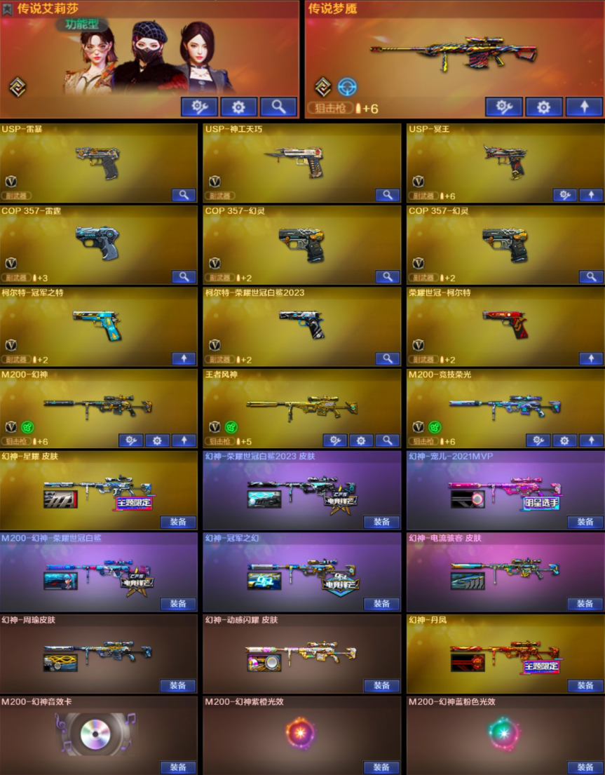 传说艾莉莎/冥王带9把副手/幻神三件套9皮/星神三件套3皮/裁决三件套3皮/G36幻影6烈蝴蝶双炽芒