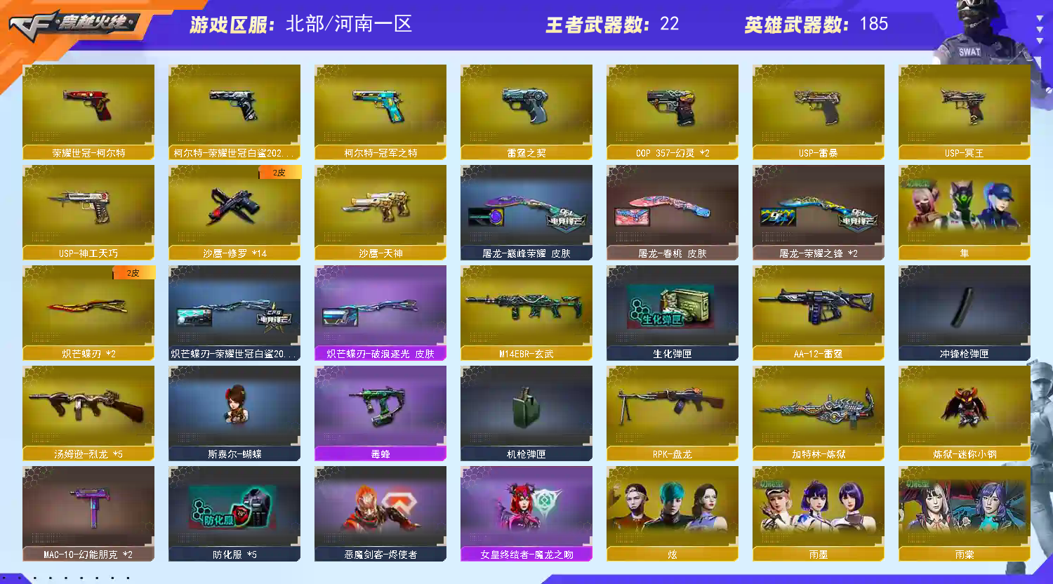 【商品标题】:北部河南一区-193V-可二次实名-【Lv.102-荣耀元帅】-【段位:荣耀枪王】 【稀有武器】:传说梦魇/M200-幻神/Kar98K-星神/G36C-幻影/ScarLight-白虎/M14EBR-玄武/M4A1-青龙/HK417-朱雀/QBZ03-天罚/M4A1-幻灵/雷霆之契/USP-雷暴/COP357-幻灵(2)/USP-神工天巧/天神-动感闪耀/柯尔特-荣耀世冠白鲨2023/修罗-古蛇迷踪/荣耀世冠-柯尔特/柯尔特-冠军之特/金色蔷薇-古蛇迷踪/QBZ03-云龙/QBZ03-金色蔷薇/AK47-火麒麟/AK47-麒麟/M4A1-黑龙/M4A1-雷神(3)/M4A1-黑骑士(2)/AK47-无影/AK47-黑武士/白虎-电玩蓝兔/Barrett-毁灭(2)/Barrett-极光/AWM-裁决/M200-竞技荣光/RPK-盘龙/加特林-炼狱/汤姆逊-烈龙(5)/AA-12-雷霆/炽芒蝶刃(2)/冠军之刃/斩神刀-雷暴/幻灵之锋/擎天-竞技荣光/唐刀-神工天巧(2)/云龙扇 【王者武器】:QBZ-03-王者蔷薇-觉醒版/白虎之魄-觉醒版/王者之怒-觉醒版/王者风神-觉醒版 【热门角色】:传说艾莉莎/荒漠琉璃/兰-巾帼英雄/晴雅/雨墨/雨棠/岚兮儿/炫/隼/奇洋探员/乔伊教练/蛇隐宗/王者春/王者-魅影/王者玲珑/炽天使/女主播/潘多拉-X/兔囡囡/幽 【热门音效卡】:M200-幻神音效卡/Kar98K-星神音效卡/AWM-裁决音效卡/Scar Light-白虎音效卡/QBZ03-金色蔷薇音效卡/G36C-幻影音效卡/HK417-朱雀音效卡/QBZ03-天罚音效卡/M4A1-雷神音效卡/Barrett-毁灭音效卡/M4A1-黑骑士音效卡/M4A1-黑龙音效卡/Barrett-极光音效卡 【热门皮肤】:幻神-星耀皮肤/幻神-荣耀世冠白鲨2023皮肤/幻神-宠儿-2021MVP/M200-幻神-荣耀世冠白鲨/幻神-冠军之幻/幻神-电流骇客皮肤/幻神-周瑜皮肤/幻神-动感闪耀皮肤/幻神-丹凤/幻影-破浪逐光皮肤/HK417-朱雀-甜蜜火力皮肤/天罚-孙权皮肤/Kar98K-星神-冠军之星皮肤/QBZ03-冠军之薇/星神-枪娘默 皮肤/白虎-霓虹机甲 皮肤/死神-机甲核心皮肤/裁决-流光秘银/炽芒蝶刃-破浪逐光皮肤/毁灭-直播专属/屠龙-巅峰荣耀皮肤/QBZ03-荣耀世冠白鲨/M4A1-战神赵云/雷神-传奇N9/ScarLight-白虎-暗星/炽芒蝶刃-荣耀世冠白鲨2023皮肤/ScarLight-白虎-冠军之虎皮肤/屠龙-荣耀之锋(2)/毁灭-荣耀之怒/屠龙-春桃皮肤/雷神-荣耀之魄 【其他亮点】:斯泰尔-蝴蝶/炼狱-迷你小钢/白虎-迷你小艾/MK5-炽火炎龙/毒蜂/黄金猫猫手套-白鲨/金刚伞-电玩红兔/烟雾弹-荣耀世冠白鲨2023/哔哩哔哩名片/超核名片/超核名片;USP-雷暴,荣耀世冠-柯尔特,柯尔特-荣耀世冠白鲨2023,柯尔特-冠军之特,炽芒蝶刃,Knife-冠军之刃,隼,