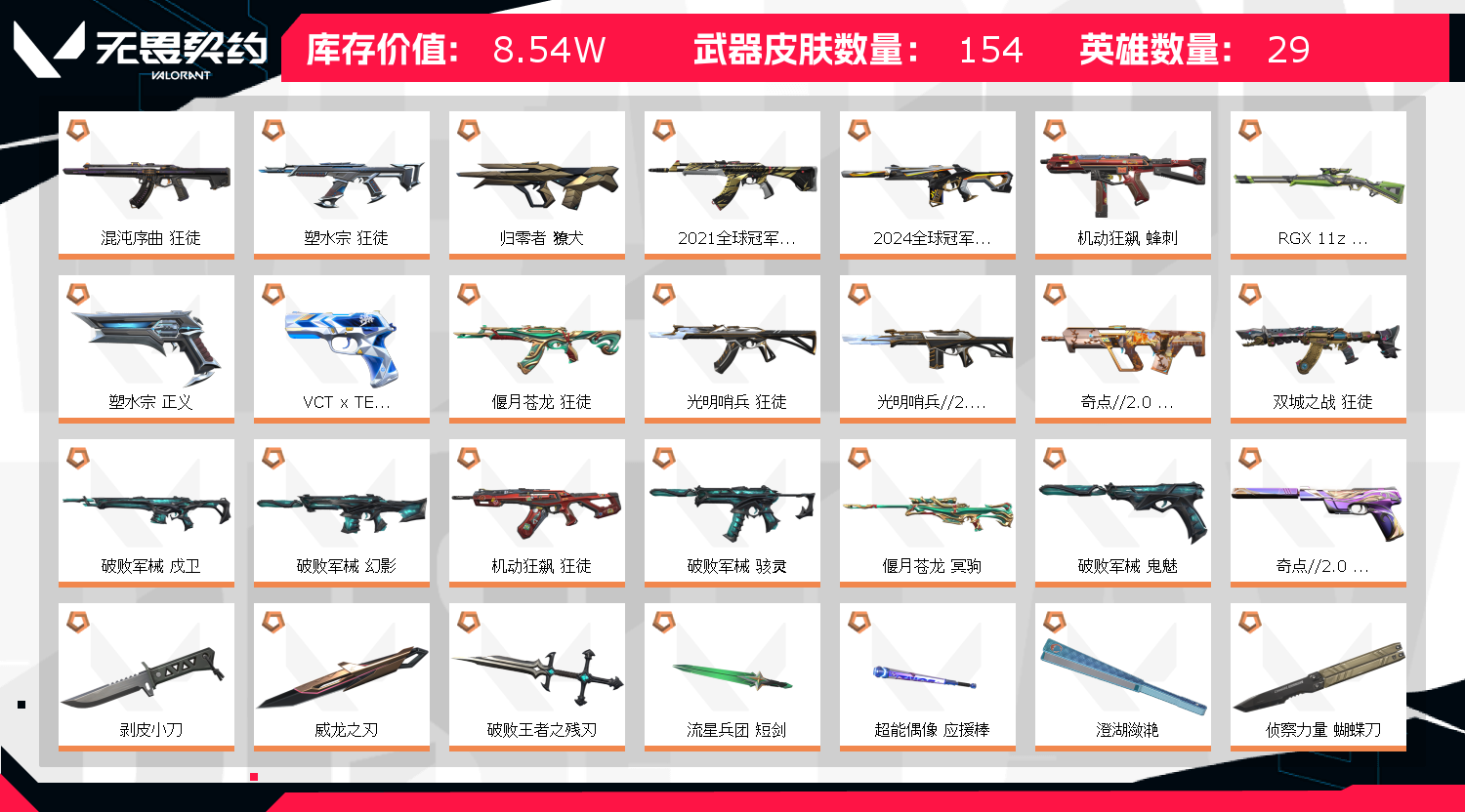 喜欢的老板,麻烦点点收藏,下次租玩更便利,持续更新皮肤中~~~ 【拥有套装】破败军械套装(破败军械-幻影,破败军械-戍卫,破败军械-骇灵,破败军械-鬼魅,破败王者之残刃)奇点2.0套装(奇点//2.0-狂徒,奇点//2.0-鬼魅,奇点//2.0-蝴蝶刀)2021全球冠军赛套装(2021全球冠军赛-狂徒,2021全球冠军赛-爪刀)耀鳞威龙套装(耀鳞威龙-狂徒,耀鳞威龙-鬼魅,威龙之刃) 【拥有近战武器】澄湖滟,神罚-军刀,超限闪存-匕首,超能偶像-应援棒,流星兵团-短剑,珍珠棘贝-短剑,钢轨卫士-战锤,沙尘幻旅-匕首,剥皮小刀,侦察力量-蝴蝶刀, 【拥有步枪】光明哨兵-狂徒,混沌序曲-狂徒,双城之战-狂徒,塑水宗-狂徒,机动狂飙-狂徒,光明哨兵//2.0-幻影,2024全球冠军赛-幻影,归零者-獠犬,偃月苍龙-狂徒,781-A协议-幻影,源能者娱乐系统-幻影,天界神兵-戍卫,天界神兵//2.0-幻影,盖世英雄-狂徒,紫阙金琅-狂徒,盖亚的复仇-狂徒,侦察力量-幻影,起源-狂徒,源能者危机001-幻影,般若假面-幻影,海洋之星-狂徒,掠影-狂徒,超限闪存-幻影,超能偶像-戍卫,超能偶像-狂徒,流星兵团-狂徒,珍珠棘贝-幻影,珍珠棘贝-戍卫,钢轨卫士-狂徒,钢轨卫士-戍卫,沙尘幻旅-狂徒,沙场老兵-戍卫,逆冲蛮牛-獠犬,模拟赫兹-獠犬,浮光跃金-戍卫,聚合之力-幻影,采蜜小蜂队-獠犬,战术熊与伙伴们-戍卫,复古浪潮-獠犬,战术小伙伴-獠犬,战术小伙伴-幻影,萌彩剪影-戍卫,胡桃狂想-獠犬, 【拥有狙击枪】RGX-11z-Pro//3.0-莽侠,偃月苍龙-冥驹,天界神兵-飞将,盖世英雄-冥驹,起源-冥驹,荒土机兵-冥驹,超限闪存-莽侠,沙尘幻旅-飞将,沙场老兵-冥驹,模拟赫兹-冥驹,聚合之力-飞将,战术熊与伙伴们-飞将,纤云弄巧-莽侠,深海水族-莽侠,复古浪潮-冥驹,光导纤维-飞将,胡桃狂想-冥驹, 【拥有机枪】流星兵团-奥丁,沙场老兵-战神,浮光跃金-战神,采蜜小蜂队-战神,深海水族-战神,战术小伙伴-奥丁,萌彩剪影-战神, 【拥有冲锋枪】机动狂飙-蜂刺,荒土机兵-骇灵,超限闪存-蜂刺,流星兵团-骇灵,珍珠棘贝-骇灵,沙尘幻旅-骇灵,沙场老兵-骇灵,浮光跃金-骇灵,聚合之力-蜂刺,纤云弄巧-蜂刺,深海水族-蜂刺,光导纤维-骇灵,战术小伙伴-蜂刺,胡桃狂想-蜂刺, 【拥有霰弹枪】盖亚的复仇//2.0-雄鹿,超能偶像-判官,逆冲蛮牛-雄鹿,纳米-判官,模拟赫兹-雄鹿,采蜜小蜂队-判官,复古浪潮-雄鹿,萌彩剪影-判官, 【拥有手枪】VCT-x-TE-标配,塑水宗-正义,源能者危机001-标配,海洋之星-短炮,荒土机兵-标配,超限闪存-正义,超能偶像-标配,流星兵团-鬼魅,珍珠棘贝-狂怒,钢轨卫士-狂怒,钢轨卫士-短炮,沙尘幻旅-正义,沙场老兵-鬼魅,逆冲蛮牛-狂怒,蛇吻-短炮,模拟赫兹-鬼魅,浮光跃金-标配,聚合之力-狂怒,采蜜小蜂队-鬼魅,纤云弄巧-正义,战术熊与伙伴们-狂怒,纤云弄巧-短炮,战术熊与伙伴们-标配,复古浪潮-正义,深海水族-短炮,光导纤维-鬼魅,光导纤维-标配,萌彩剪影-狂怒,胡桃狂想-鬼魅,24冠军混沌黯夜怪谈艾沃莉源能者电玩显卡套塑水宗归零者盖世套光明哨兵机动狂飙全息波普破败军械掠夺掠影无畏奇点2.0白银青铜黄金黑铁砖石铂金神话盖亚洪荒离火刃毁灭骑士VCT爪刀创纪元镭切虚空遗器离子2.0西部未来蝴蝶刀黑波显卡AK无畏光荣异象RGX 11Z PRO奇点正义23盖亚铂金22冠军苍龙之刃21冠军超时空卫士掠影2.0影钩赋能掠夺爪显卡AK滋滋X特工队25冠军混沌2.0末日泡泡多弥尔的复仇;剥皮小刀,威龙之刃,天界神兵//2.0 幻影,归零者 獠犬,盖亚的复仇 狂徒,掠影 狂徒,源能者娱乐系统 幻影,