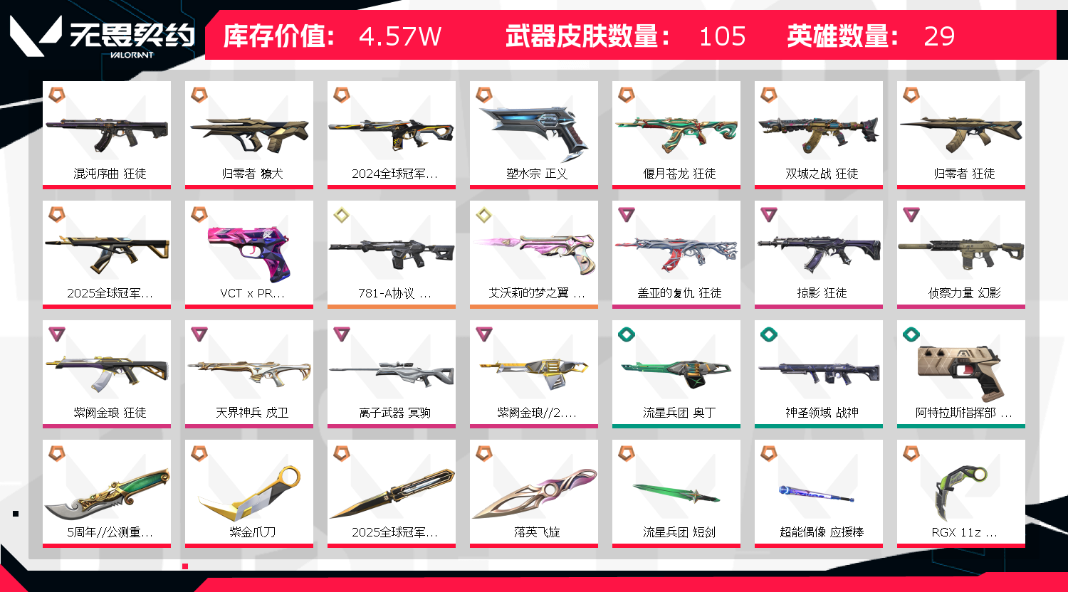 ﹥﹥﹥﹥﹥﹥望大家以实际情况认真填写撤单原因❗❗❗ 无理由乱填写撤单可能会被当做恶意下单被永久拉黑❗❗❗ 【如遇WeGame被挤】是号主在玩其他游戏 你租赁的游戏是不会掉线的 🌟请勿撤单 谢谢老板🌟 【无畏契约如遇冻结】(在租号订单处点解除冻结后)请耐心等待三五分钟后重新上号 有时候会连续冻结两次 并非沒解 感谢老板耐心配合!!! 【请勿挂机】请老板耐心打完每一把不要中途退出挂机毁号 发现挂机对应订单将永久拉黑!!! 一:登录时,如遇见上号器卡死请多尝试登录几次。 二:不要消极游戏,送人头挂机,导致封号拉黑名单,提交客服处理 三:请素质游戏不要乱动游戏点券道具及好友 发现乱搞永久拉黑再也不见!!! 四:好用请收藏,收藏不迷路,不赚钱交个朋友,请不要挂机,喷队友。 五:希望不要挂机,导致号主锁单也会影响游戏体验。 六:队友打的不好,恳请谅解,请不要直接谩骂导致封禁/禁言等。 七:游戏中与您自称号主的人一律是骗子!!! 谨防诈骗!!!谨防诈骗!!!谨防诈骗!!!;5周年//公测重制版 苍龙之刃,紫金爪刀,归零者 獠犬,盖亚的复仇 狂徒,掠影 狂徒,侦察力量 幻影,紫阙金琅 狂徒,