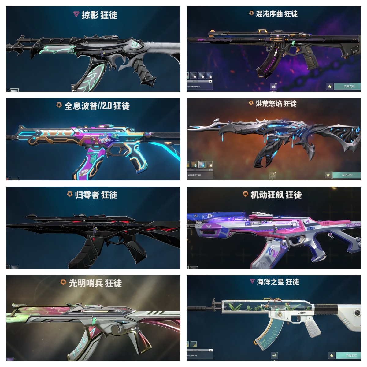 【拥有步枪】光明哨兵-狂徒,双城之战-狂徒,洪荒怒焰-狂徒,破败军械-幻影,全息波普//2.0-狂徒,机动狂飙-狂徒,2021全球冠军赛-狂徒,归零者-狂徒,781-A协议-獠犬,781-A协议-幻影,艾沃莉的梦之翼-狂徒,堕天遗武-狂徒,天界神兵-戍卫,天界神兵//2.0-幻影,盖世英雄-狂徒,紫阙金琅-狂徒,无垠星环-幻影,盖亚的复仇-狂徒,侦察力量-幻影,冰点凝冻-狂徒,般若假面-幻影,海洋之星-狂徒,掠影-狂徒,荒土机兵-狂徒,超限闪存-幻影,超能偶像-戍卫,超能偶像-狂徒,流星兵团-狂徒,珍珠棘贝-幻影,珍珠棘贝-戍卫,钢轨卫士-狂徒,钢轨卫士-戍卫,纳米-幻影,逆冲蛮牛-戍卫,逆冲蛮牛-獠犬,模拟赫兹-獠犬,浮光跃金-戍卫,聚合之力-幻影,采蜜小蜂队-獠犬,战术熊与伙伴们-戍卫,复古浪潮-獠犬,战术小伙伴-獠犬,战术小伙伴-幻影,
