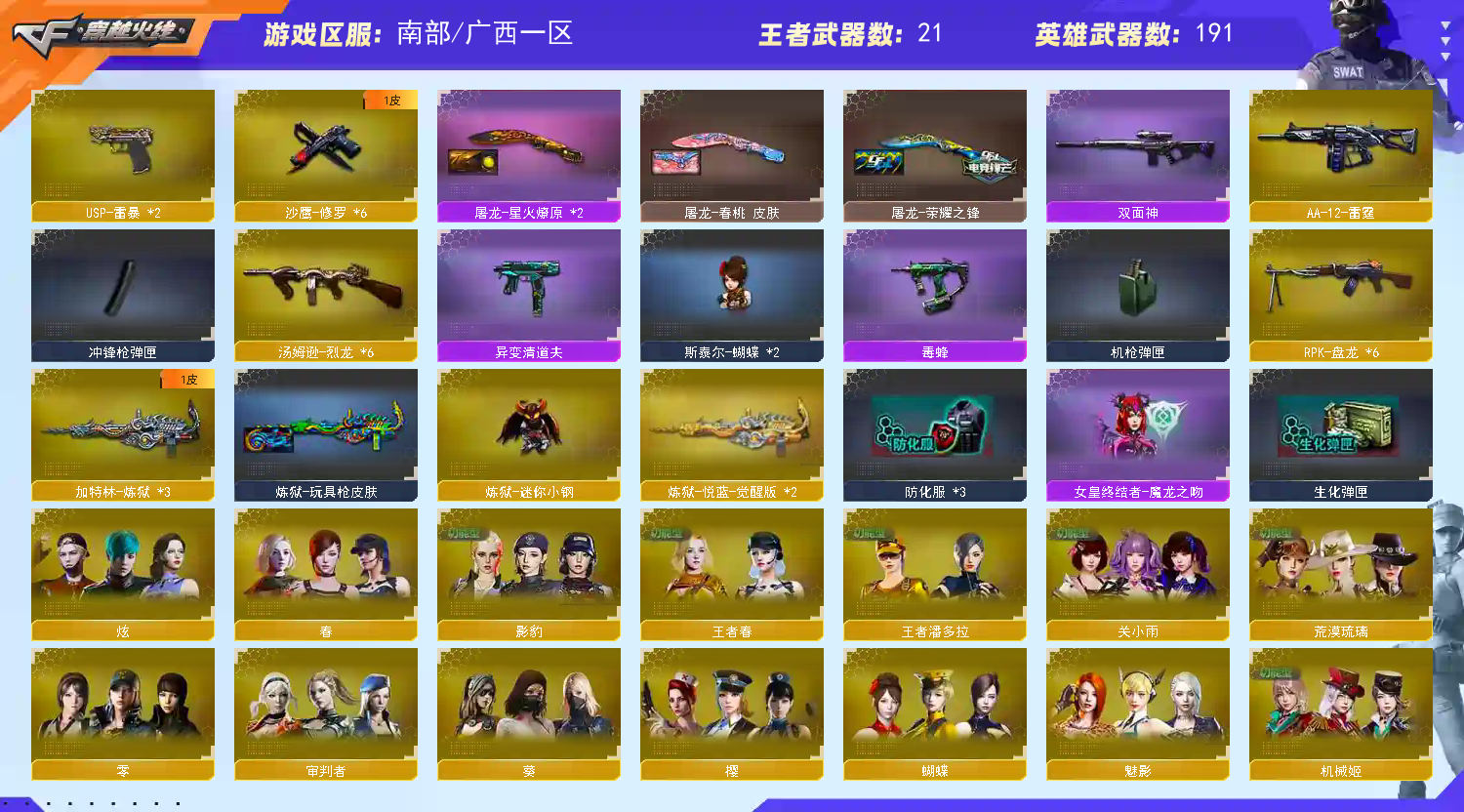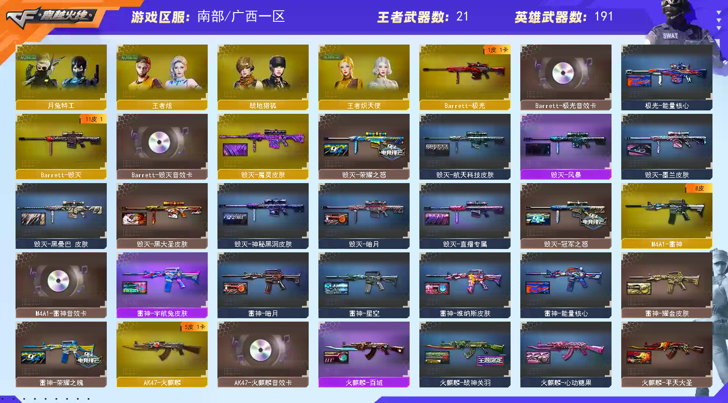 【此号价值数十万,如有开G开辅助封号的,想想自己是否能够承担的起,后果自负,由平台提供,身份信息,证据和地址进行报警处理】 步枪:火麒麟 黑龙 雷神 黑骑士 无影 死神 超新星 武圣 雷霆 雷暴 青龙 白虎 天罚 G36C幻影 幻兽 金色蔷薇 烈火 王者之心 王者之翼 王者之魄 王者之势 王者之幻 王者冰魄 白虎电玩蓝兔 炫金超新星 炫金雷神 炫金骑士 炫金无影 炫金武士 狙击:天龙 毁灭 极光 裁决 雷霆 幻神 星神 王者之力 王者之决 王者星神 王者凰鸣 王者星霆 蔷薇青龙 炫金毁灭 炫金天龙 机枪:6盘龙 加特林炼狱 炼狱迷你小钢 冲锋:6烈龙 斯太尔蝴蝶 毒蜂 异变清道夫 副武:传说破晓 6修罗 2COP雷霆 2USP雷暴 3COP雲龙 破空枪刃 5沙鹰幻兽 3柯尔特冠军之特 近身:2炽芒蝶刃 屠龙 龙啸 擎天 麒麟刺 尼泊尔雷霆 斩神刀雷暴 屠龙动感闪耀 女皇利刃幻兽 王者之锋 王者之刺 迷你宝贝 冠军之刃 投掷:5幻兽 7雷霆 7雷暴 幻灵 神工天巧 雲龙 角色:传说影煞 传说艾莉莎 春 关小雨 蝴蝶 荒漠琉璃 机械姬 王者春 王者炽天使 王者潘多拉 王者炫 新海豹突击队 影豹 月兔特工 炫 暗夜审判 樱青春偶像 音效:幻神音效卡 星神音效卡 白虎音效卡 毁灭音效卡 极光音效卡 火麒麟音效卡 裁决音效卡 雷神音效卡 黑骑士音效卡 皮肤:幻神宠儿 幻神N9 幻神冠军之幻 幻神电流骇客 幻神2022 幻神动感闪耀 幻神巅峰荣耀 幻神青鹤 幻神黄忠 QBZ冠军之薇 QBZ纸灯龙 星神枪娘默 星神破竹 星神璀璨 白虎冠军之虎 白虎电玩粉兔 裁决百城联赛 裁决凤灵 烈火动感闪耀 屠龙星火燎原 黑骑士冠军之势 雷神荣耀之魄 火麒麟AG 黑骑士AG 龙啸冠军之啸 黑龙361 火麒麟冠军之心 毁灭冠军之怒 屠龙荣耀之锋 毁灭荣耀之怒;USP-雷暴,柯尔特-冠军之特,炽芒蝶刃,Knife-冠军之刃,传说影煞,传说艾莉莎,RPK-盘龙,