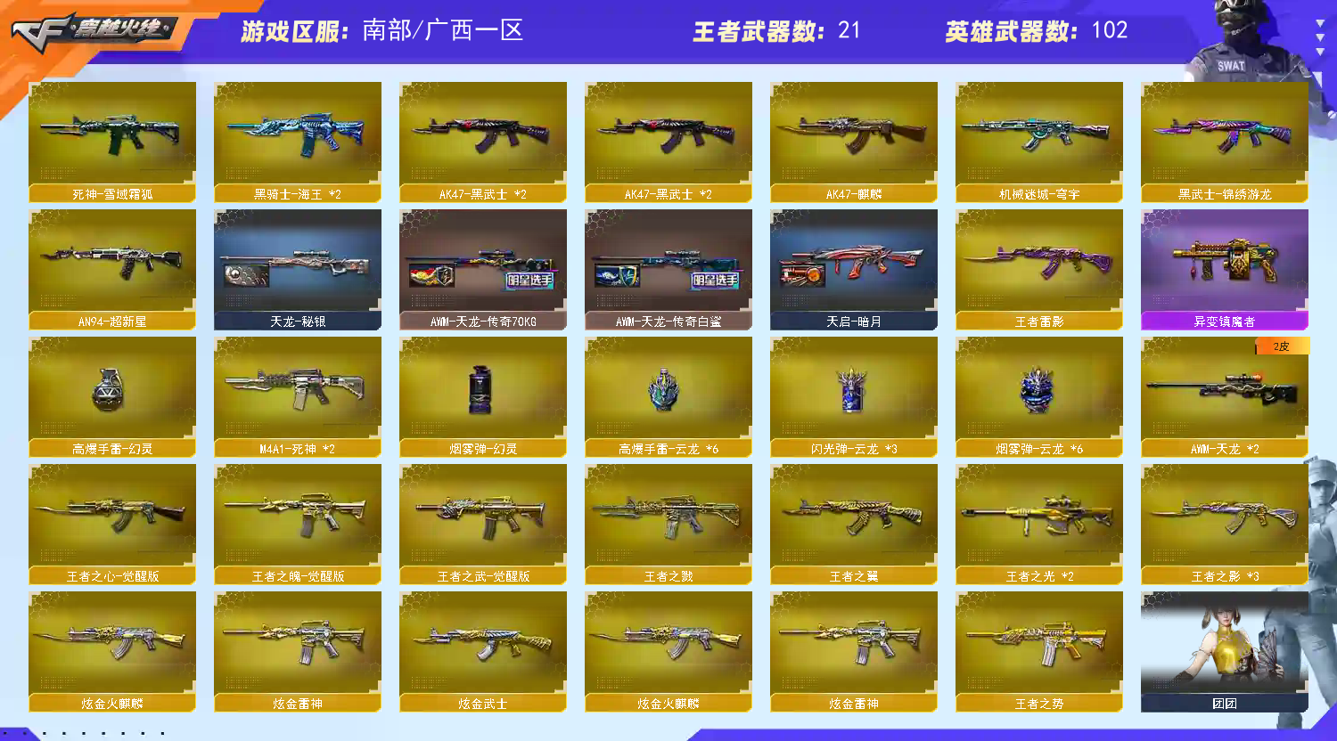 热门武器:M200-幻神;八面玲珑;G36C-幻影;法码斯-天戎;Scar Light-白虎;加特林-炼狱;异变镇魔者;异变清夫道;王者星神;6烈5盘;炽芒蝶刃;迷你生化手雷 传说级:传说幽冥;传说影煞;传说暗裔;传说辉光 王者武器:QBZ-03-王者蔷薇-觉醒版;炼狱-悦蓝-觉醒版;王者之光;王者之势;王者之影;王者之心;王者之怒;王者之戮;王者之武;王者之翼;王者之锋-觉醒版;王者之魄-觉醒版;王者星神-觉醒版;王者玉峰;王者雷影; 英雄武器:AK47火麒麟;AK47黑武士;AN94-超新星;AWM-天龙;AWM裁决;Barrett-毁灭;M4AI-死神;M4A1玫瑰精灵;M4A1-雷神;M4A1-黑骑士;M4A1-黑龙;QBZ03-云龙;QBZ03-金色蔷薇;M200-幻神;八面玲珑;Scar Light-白虎;加特林-炼狱;四防关小羽;四防华;四防鹰;COP357-云龙;沙鹰修罗;沙鹰-天神; 道具:金蛇戒;银蛇戒;烟雾保护头盔;闪光护目镜;防弹衣;防弹头盔;手雷包;C4工具钳;防化服;夺命之镰;变异宝贝;灵魂忍者;妖姬;疯狂宝贝;迷雾幽灵;生化弹夹;步枪弹夹;冲锋枪弹夹;手枪弹夹;狙击枪弹夹;机枪弹夹;散弹枪弹夹;;传说幽冥,炽芒蝶刃,传说影煞,RPK-盘龙,QBZ03-金色蔷薇,G36C-幻影,M200-幻神,