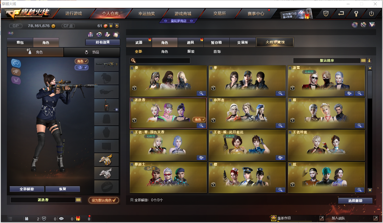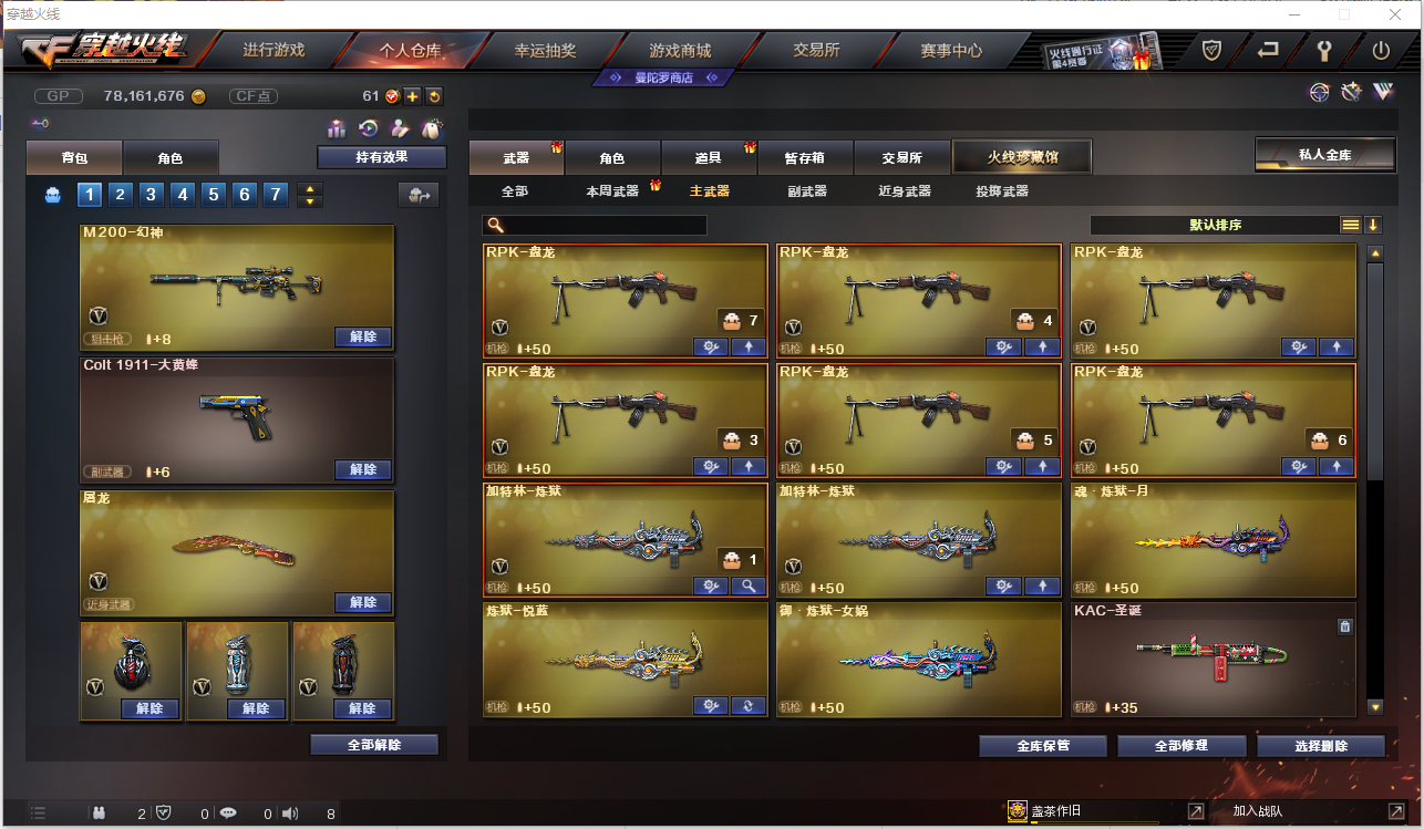 【角色】葵、零、凌霄、迷迭香、审判者、瞳、王者-零-国色天香、王者-瞳-闭月羞花、王者玲珑、修道士、樱、炫、魅影、 【主武器】M200-幻神、Scar Linght-白虎、QBZ03-金色蔷薇、AK47-火麒麟、M4A1-黑龙、M4A1-雷神、M4A1-黑骑士、AK47-无影、AK12-天启、AN94-超新星、M4A1-武圣、AK47-机械迷城、AK47-黑鲨、M4A1-龙血、M4A1-青龙、HK417-朱雀、M4A1-夜魔、M4A1-猎神、9A-91-烈火、黑武士-CF网剧冠军武器套装、火麒麟-绝迹、炫金超新星、炫金黑龙、炫金雷神、炫金骑士、AWM-天龙、AWM-裁决、Barrett-毁灭、Barrett-极光、Barrett-金色蔷薇、炫金毁灭、六盘 六烈、加特林-炼狱、炼狱-悦蓝、AA-12-雷霆、王者炎心、王者之城、王者之心、王者之魄、王者之势、王者之武、王者幻神、王者之怒 【副武器】王者之魂*3、王者之灵、沙鹰-修罗*4、沙鹰-天神*2、Glock18-武圣、COP-堕天神、破空枪刃-夜魔、沙鹰-幻兽、天神-CF网剧冠军武器套装、修罗-摸金校尉、 【近身武器】王者之锋、王者之啸、屠龙、龙啸、擎天、麒麟刺、马来剑-夜魔、女皇利刃-幻兽、擎天-CF网剧冠军武器套装、 【投掷武器】高爆手雷-夜魔*7、高爆手雷-幻兽、闪光弹-夜魔*7、闪光弹-幻兽、烟雾弹-夜魔*7、烟雾弹-幻兽 【音效】AK47-火麒麟音效卡、Barrett-毁灭音效卡、Barrett-极光音效卡、M4A1-黑龙音效卡、M4A1-黑骑士音效卡、M4A1-雷神音效卡 【皮肤】毁灭-风暴、天启-暗月、修罗-能量核心、天龙-能量核心、雷神-能量核心、天启-暗月、黑骑士-暗月、天龙-秘银、无影-能量核心、极光-能量核心、修罗-能量核心、黑龙-暗月、雷神-能量核心、修罗-星空、雷神-星空灰、毁灭耀金皮肤、黑骑士-地狱火、天龙-CF STAR、火麒麟-CF STAR、修罗-CF STAR、无影-霓裳皮肤、雷神-虎将;RPK-盘龙,QBZ03-金色蔷薇,M200-幻神,Scar Light-白虎,