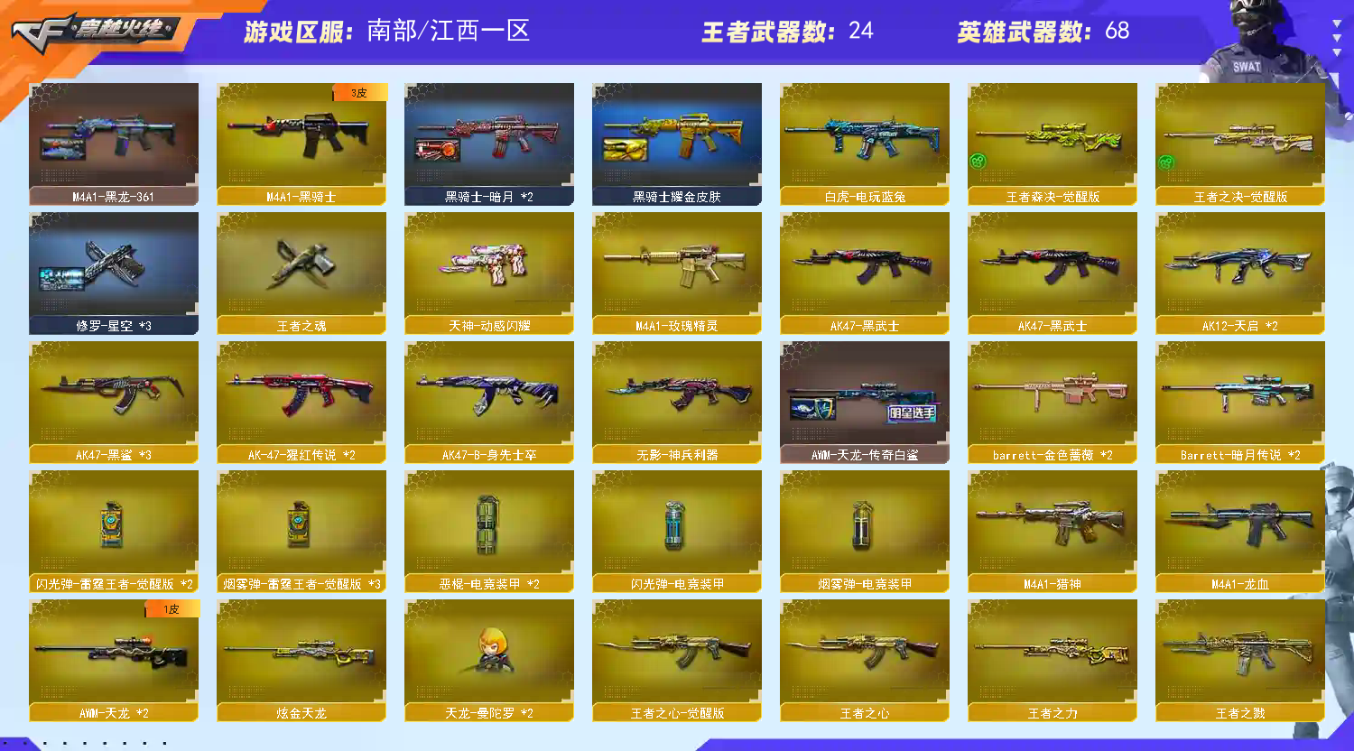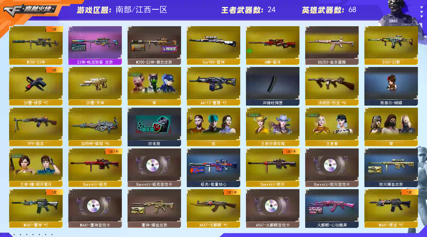 此号公安以报备,禁止使用外挂;隼,王者沙漠玫瑰,RPK-盘龙,QBZ03-金色蔷薇,G36C-幻影,M200-幻神,Kar98K-星神,