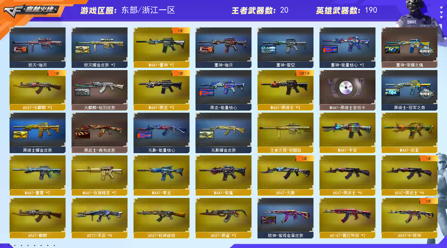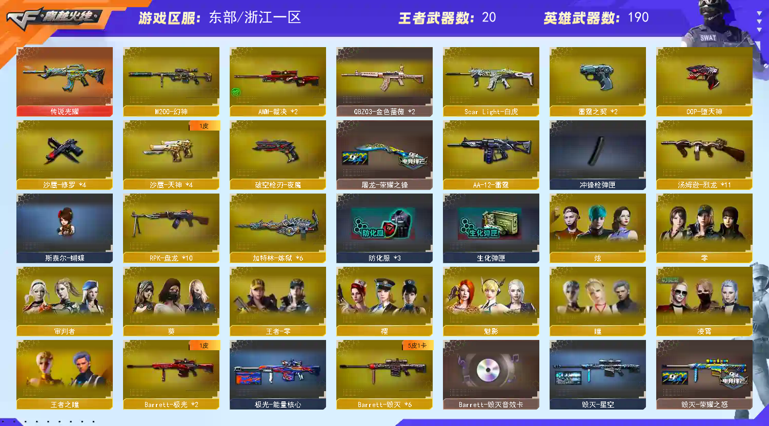 东部天花板号 190V可排🔥传说光耀+幻神+朱雀+白虎+斯泰尔蝴蝶🔥全夜魔雷霆+白鲨+小人枪🔥AG冠军荣耀皮【浙江一区登录】【炫金稀有顶1V介意者勿租】【恶意投诉、撤单不想玩了租错号了等非帐号问题1律拉黑】【此号已备案请勿以身试法】 【重要套装】夜魔套装/雷霆套装 【重要角色】_葵/_瞳/_凌霄/魅影/审判者/_樱/_零/_炫/王者零-传说之路/王者之瞳/雅典娜/王者-零/铁骑荣耀/铁骑-乘风破浪/灵狐者-黄金海岸 【传说武器】传说光耀 【英雄武器】_M200-幻神/Barrett-毁灭(6)/Barrett-极光(2)/Barrett-朱雀/barrett-金色蔷薇(3)/Barrett-暗月传说/雷霆之怒/王者之怒-觉醒版/王者之光-觉醒版/AWM-天龙(2)/AWM-裁决(2)/王者之力-觉醒版/M4A1-青龙/M4A1-雷神(2)/M4A1-死神(2)/M4A1-黑龙(3)/M4A1-龙血(3)/M4A1-千变/M4A1-黑骑士(3)/M4A1-武圣/M4A1-夜魔/M4A1-雷霆(2)/M4A1-猎神(2)/M4A1-玫瑰精灵(2)/王者之魄-觉醒版/HK417-朱雀/Scar Light-白虎/AK12-天启(4)/AK47-火麒麟(3)/AK47-无影/AK47-麒麟/AK47-黑鲨(3)/AK47-黑武士(4)/AK-47-猩红传说(2)/AK47-机械迷城/AK47-B-战士/AK47-B-战神/AN94-超新星(3)/QBZ03-金色蔷薇(2)/9A91-烈火/RPK-盘龙(10)/汤姆逊-烈龙(11)/AA-12-雷霆/加特林-炼狱(6)/COP-堕天神/雷霆之契(2)/沙鹰-天神(4)/沙鹰-修罗(4)/Glock18-武圣/破空枪刃-夜魔/麒麟刺(5)/麒麟刺-堕天神/王者之刺-觉醒版/龙啸(3)/王者之啸-觉醒版/擎天(3)/王者之击-觉醒版/屠龙(8)/雷霆之锋/马来剑-夜魔/斩神刀-雷暴/高爆手雷-雷暴(3)/高爆手雷-雷霆(7)/高爆手雷-夜魔(7)/高爆手雷-堕天神/烟雾弹-雷暴(3)/烟雾弹-雷霆(7)/烟雾弹-夜魔(7)/烟雾弹-堕天神/闪光弹-雷暴(3)/闪光弹-雷霆(7)/闪光弹-夜魔(7)/闪光弹-堕天神 【王者武器】王者炎心/王者之魄(2)/天启-悦智/超新星-悦享/王者之心/烈龙-悦心/王者之锋(2) 【小人枪】火麒麟-灵狐/Cat-刀锋/M4A1-刀锋/巴雷特-零-水下丽影/斯泰尔-蝴蝶/M37-葵/COP-旗袍/COP-白鲨/迷你深渊冰龙/冰火魔兽/迷你牛牛/闪光弹-小乔 【其他重要武器】炫金雷神/炫金超新星(3)/炫金毁灭/炫金天龙/炫金修罗/武圣-赤魂/火麒麟-暗月(3)/黑武士-能量核心(2)/M4A1-十二生肖·龙-雷神/M4A1-仙界-黑骑士/G3A3-SS-枪王排位(2)/AK47-十年火线(2)/QBZ03-烛龙/AK47-破空冰刃(3)/M4A1-破空冰刃/AK47-轮回/M4A1-十年火线/9A-91翡翠/M14EBR-赤血龙魂/HK417-赤血龙魂/M4A1-电音(2)/M4A1-青龙./AK47-青龙/AK47-樱花/9A91-2017万圣节/凤凰之魄/AK47-肯德基/9A91-蓝色骑士(2)/金色小号/M4A1-战龙(2)/AK47-B-十周年(2)/M4A1-秘银赤龙(6)/M4A1-樱/M4A1-樱花/AK-12-CFS2017纪念版(2)/AK12-幽灵/AK47-SS-9周年/雷神-赛博朋克/AK12-枪王排位(3)/M4A1-狂欢-CFS/AK47-狂欢-CFS(2)/M14EBR-情人节2020/黄金AK-47(2)/M4A1-紫狱(3)/AK47-SS-枪王排位(2)/AK47-死亡之翼/AK47-齐天大圣/M4A1-XS-耀龙/9A91-赤血龙魂(7)/AK47-万圣节2018/HK417-红龙/AK47-绚樱/HK417-赤龙/M4A1-PINK/AK47-圣诞节[2019]/M200-情人节2019(2)/AWM-蓝水晶(2)/AWM-十周年/AWM-恶棍-枪王排位(2)/M200-涂鸦/AWM-2018圣诞/M200-万圣节/AWM-A/M200-圣诞/AWM-圣诞/98K-蓝色骑士/凤凰之力(2)/破天九龙/AWM-Pink/AWM-涂鸦/M82A1-封神/98K-烛龙/M200-枪王排位/破天狂龙/AWM-深海猎手/雷蛇AWM/M200-万圣节2018(2)/M200-赤血龙魂(8)/AWM-A枪王排位II/黄金AWM/AWM-枪娘/MG4-蓝色骑士/KAC-赤烛/斯泰尔-巧克力/EVO III-赤血龙魂(2)/征服者-毁灭之王 [Lv Max]/SPAS-12-雷电核心/阐释者III(3)/沙鹰-青龙/愤怒公牛左轮-枪王排位(3)/凤凰之灵(2)/Cop357-赤龙/修罗-摸金校尉/Anaconda-炽焰核心/幻影Anaconda-枪王排位/Anaconda-雷电核心/新USP-枪王排位奖励(5)/幻影沙鹰-枪王排位/沙鹰-枪王排位(4)/沙鹰-万圣节2018(2)/COP 357--绚樱/丛林匕首-枪王排位/啸天/军用铁锹-赤龙/尼泊尔军刀-9周年/收割者-枪王排位(2)/幻影扳手-枪王排位/鹰爪-枪王排位/丛林匕首-卧龙(4)/蝴蝶刀-枪王排位/军用铁锹-飞龙在天/闪光弹-枪王排位(3)/胜利奖杯手雷-枪王排位(2) 【重要武器皮肤】极光-能量核心/巴雷特-毁灭-CFPL冠军/黑骑士-冠军之势/毁灭-星空/毁灭-荣耀之怒/毁灭耀金皮肤/毁灭-暗月/天龙-CFSTAR/天龙-秘银/天龙-能量核心/M4A1-雷神-白鲨皮肤/雷神-荣耀之魄/雷神-暗月/雷神-能量核心/雷神-星空/黑骑士耀金皮肤/黑武士-典韦皮肤/黑龙-暗月/黑龙-能量核心/M4A1-千变-孔明皮肤/火麒麟-CFSTAR/火麒麟-AG/火麒麟-轻羽皮肤/无影-能量核心/无影耀金皮肤/战神-流金岁月皮肤/战神-紫绶金章皮肤/战神-粉色甜心皮肤/修罗耀金皮肤/修罗-CFSTAR/天神-暗月/屠龙-荣耀之锋 【重要光效】炼狱-悦蓝金色光效/王者之光金色光效/王者之力金色光效/王者之啸金色光效/王者之幻金色光效/王者之影金色光效/王者之心金色光效/王者之锋金色光效/王者之魄金色光效/AK47-黑武士蓝色光效/AN94-超新星蓝色光效/AWM-天龙蓝色光效/M4A1-死神蓝色光效/RPK-盘龙蓝色光效/加特林-炼狱蓝色光效/屠龙蓝色光效/巴雷特-毁灭蓝色光效/沙鹰-修罗蓝色光效/麒麟刺蓝色光效/Barrett-极光红绿光效/M4A1-玫瑰精灵红绿光效/M4A1-雷神红绿光效/RPK-盘龙红绿色光效/M4A1-雷神紫色光效 【重要音效卡】M4A1-黑骑士音效卡/毁灭音效卡 【重要戒指】8周年戒1/龙眼(死神)/龙眼(鹰)/金蛇戒/银蛇戒/16赛季纪念戒指-枪王耀金/17赛季纪念戒指-耀金/18赛季纪念戒指-耀金/20赛季纪念戒指-耀金/21赛季纪念戒指-耀铜(食指)/21赛季纪念戒指-耀银(拇指)/22赛季纪念戒指-耀铜(食指)/22赛季纪念戒指-耀银(拇指)/23赛季纪念戒指-耀银(拇指)/24赛季纪念戒指-耀银(拇指);RPK-盘龙,QBZ03-金色蔷薇,M200-幻