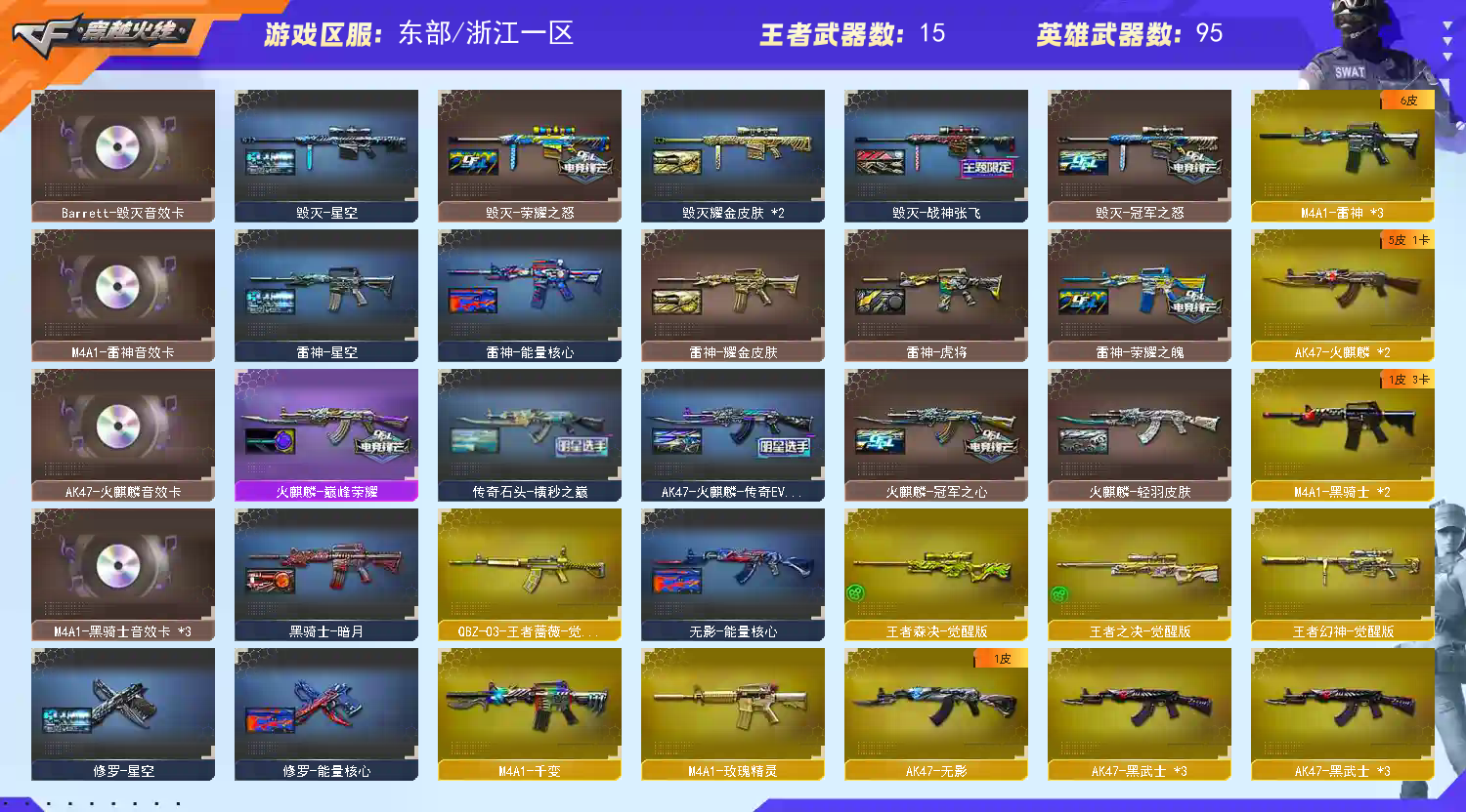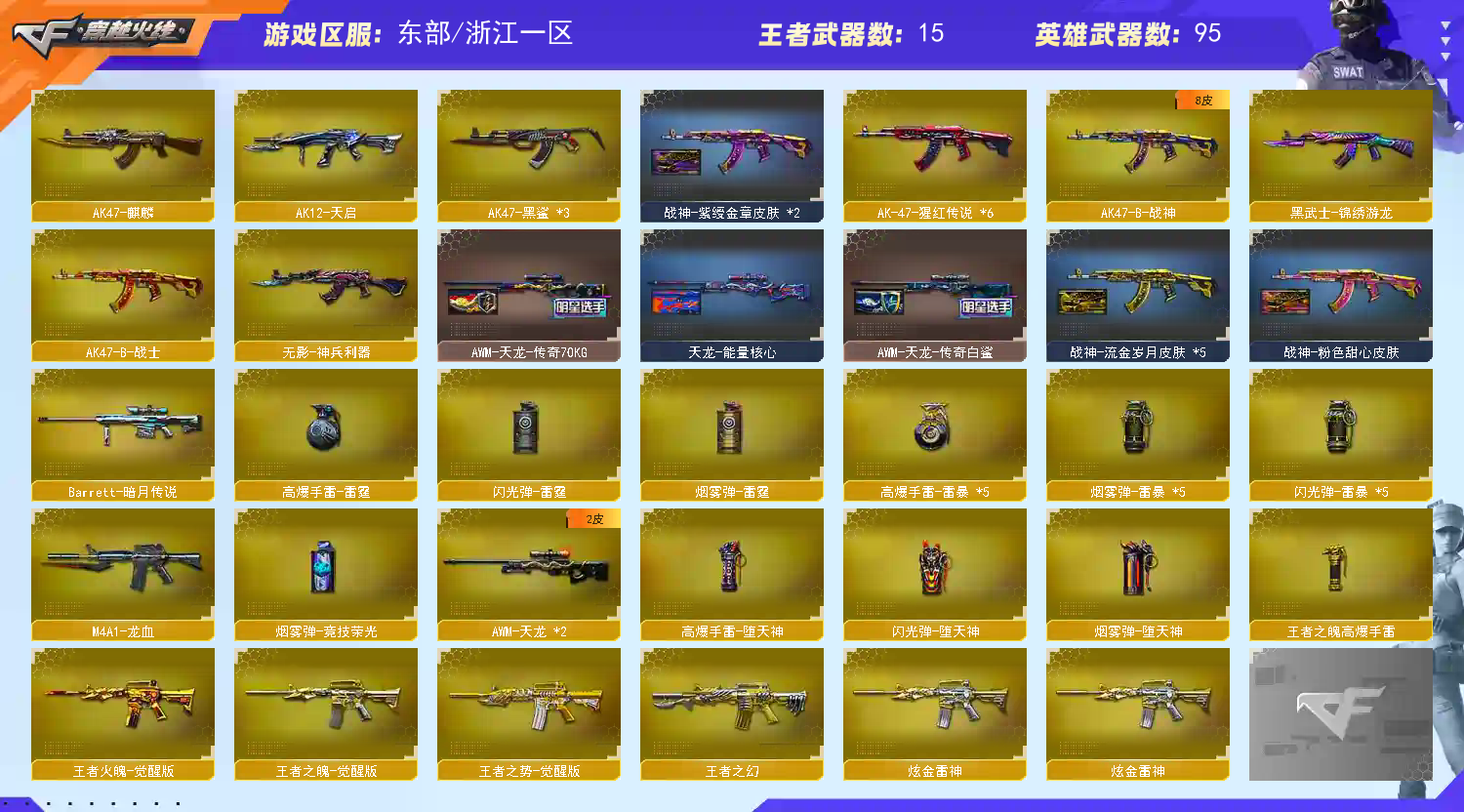 【重要角色】蛇隐宗/_迷迭香/电竞教官-云悠悠/_零/蛇姬/王者-瞳-闭月羞花/王者春/王者之瞳/职业选手/_炽天使/樱-缤纷夏日/铁骑-乘风破浪/兰-海滩派对 【传说武器】 【英雄武器】_M200-幻神/王者幻神-觉醒版/Barrett-毁灭(5)/Barrett-极光/Barrett-暗月传说/Kar98K-星神/AWM-天龙(2)/AWM-裁决/王者森决-觉醒版/王者之力-觉醒版/王者之决-觉醒版/M4A1-雷神(3)/M4A1-黑龙/M4A1-龙血/M4A1-千变(2)/M4A1-黑骑士(2)/M4A1-玫瑰精灵/王者之魄-觉醒版/王者之势-觉醒版/_Scar Light-白虎/AK12-天启/AK47-火麒麟(2)/AK47-无影/无影-神兵利器/AK47-麒麟/AK47-黑鲨(3)/AK47-黑武士(3)/AK-47-猩红传说(7)/AK47-B-战士/AK47-B-战神/QBZ03-金色蔷薇(2)/王者之心-觉醒版/QBZ-03-王者蔷薇-觉醒版/9A91-烈火(2)/汤姆逊-烈龙/加特林-炼狱(2)/炼狱-悦蓝-觉醒版/沙鹰-修罗(6)/USP-雷暴/麒麟刺-堕天神/龙啸(2)/荣耀世冠-龙啸/王者之啸-觉醒版/擎天(3)/屠龙(6)/雷霆之锋/斩神刀-雷暴(2)/炽芒蝶刃/高爆手雷-雷暴(5)/高爆手雷-雷霆/高爆手雷-堕天神/烟雾弹-雷暴(5)/烟雾弹-雷霆/烟雾弹-堕天神/烟雾弹-竞技荣光/闪光弹-雷暴(5)/闪光弹-雷霆/闪光弹-堕天神/超新星-热带奇洋/黑武士-锦绣游龙/王者火魄-觉醒版/柯尔特-无冕之王/龙啸-热带奇洋/手雷-热带奇洋 【王者武器】王者之幻/王者之戮/超新星-悦享/王者之灵/王者之魄高爆手雷 【小人枪】HK417-朱雀-蛇隐宗/Scar Light-马枪/AWM-灵狐-15周年嘉年华/毁灭-孙三炮/斯泰尔-蝴蝶/迷你深渊冰龙/闪光弹-小乔/迷你生化手雷 【其他重要武器】炫金雷神/M4A1-十二生肖·龙-雷神(2)/M4A1-英雄-能量核心/AK47枪王排位II/9A91-赤血龙魂(9)/AK47-万圣节2018/AK47-破空冰刃/AK47-烛龙/M4A1-破空冰刃(2)/AK47-圣诞节[2019]/凤凰之魄/9A91-2017万圣节/M4A1-十年火线/M4A1-青龙./黄金AK-47(2)/AK47-SS-枪王排位/M4A1-Guitar 炫彩/AK47-轮回/XM8-炫彩/M4A1-紫狱(2)/M14EBR-炎龙/M14EBR-赤血龙魂/M4A1-秘银赤龙(2)/雷神-赛博朋克/AK47-枪娘/AK47-绚樱(2)/M4A1-SS-枪王排位/火麒麟-桃园结义/M200-赤血龙魂(5)/AWM-A枪王排位II/雷蛇AWM/AWM-Pink(2)/M200-万圣节2018(2)/M200-圣诞/AWM-深海猎手/Barrett-翔龙/M200-情人节2019/AWM-枪娘/AWM-7周年/M200-萌杀/Barrett-炎龙/AWM-万圣节刀锋/巴雷特-情人节2020/M200-大黄蜂/Barrett-怒火大圣/98K-蓝色骑士/AWM-A-圣诞2021/巨龙咆哮Ⅲ/KAC-赤烛/KAC-小动物/EVO III-赤血龙魂(11)/斯泰尔-巧克力/Steyr TMP-CFS2020纪念版/神圣爆裂者/神圣爆裂者-末日/SPAS-12-雷电核心/Spas-12-幻能朋克/阐释者III/新USP-枪王排位奖励(4)/沙鹰-万圣节2018(2)/沙鹰-青龙/沙鹰-枪王排位(3)/沙鹰-雷蛇/愤怒公牛左轮-枪王排位(2)/MAC-10-幻能朋克/沙漠之鹰-炎龙/Anaconda-雷电核心/COP 357--绚樱(2)/幻影沙鹰-枪王排位(2)/新USP-怒火大圣/COP-金蝉子-枪王排位/修罗-摸金校尉/金刚伞-电玩红兔/军用铁锹-赤龙/啸天/收割者-枪王排位/丛林匕首-枪王排位/蝴蝶刀-枪王排位/尼泊尔-炎龙/斩神刀-御龙/丛林匕首-卧龙(4)/虹光丛林匕首-枪王排位/闪光弹-枪王排位(4)/胜利奖杯烟雾弹-枪王排位(2)/手雷-能量核心 【重要武器皮肤】幻神-欧欧 皮肤/M200-幻神-黄忠皮肤/幻神-降龙/幻神-CFS2022/星神-璀璨皮肤/巴雷特-毁灭-CFPL冠军/毁灭-冠军之怒/毁灭-战神张飞/毁灭-星空/毁灭-荣耀之怒/毁灭耀金皮肤/极光-能量核心/AWM-天龙-传奇70KG/AWM-天龙-传奇白鲨/天龙-CFSTAR/天龙-能量核心/AK47-火麒麟-传奇EVEN/火麒麟-CFSTAR/火麒麟-AG/火麒麟-轻羽皮肤/火麒麟-冠军之心/传奇石头-横秒之巅/无影-能量核心/AK47-B-常胜将军-曹操/M4A1-千变-孔明皮肤/雷神-源计划2.0专属 皮肤/雷神-荣耀之魄/雷神-虎将/雷神-耀金皮肤/雷神-能量核心/雷神-星空/黑骑士-暗月/黑龙-能量核心/M4A1-黑龙-361/战神-流金岁月皮肤/战神-紫绶金章皮肤/战神-粉色甜心皮肤/修罗-星空/修罗-CFSTAR/修罗-能量核心/屠龙-巅峰荣耀 皮肤/屠龙-荣耀之锋 【重要光效】Barrett-毁灭金色光效/王者之幻金色光效/AK47-黑武士蓝色光效/AWM-天龙蓝色光效/沙鹰-修罗蓝色光效/AK47-火麒麟蓝粉色光效/AK47-黑武士蓝粉色光效/M4A1-雷神蓝粉色光效/Barrett-极光红绿光效/M4A1-武圣红绿光效/M4A1-死神红绿色光效/M4A1-玫瑰精灵红绿光效/RPK-盘龙红绿色光效/汤姆逊-烈龙红绿色光效/M4A1-死神紫色光效/M4A1-黑骑士绿色光效 【重要音效卡】Barrett-极光音效卡/M200-幻神音效卡/M4A1-黑骑士音效卡/M4A1-雷神音效卡/Barrett-毁灭音效卡/AK47-火麒麟音效卡/QBZ03-金色蔷薇-古蛇迷踪音效卡 【重要戒指】15周年限定戒指/龙眼(死神)/龙眼(鹰)/16赛季纪念戒指-枪王耀金/17赛季纪念戒指-耀金/18赛季纪念戒指-耀金/21赛季纪念戒指-耀铜(食指)/22赛季纪念戒指-耀铜(食指)/23赛季纪念戒指-耀铜(食指)/23赛季纪念戒指-耀银(拇指)/24赛季纪念戒指-耀银(食指) /24赛季纪念戒指-耀银(拇指)/25赛季纪念戒指-耀铜(拇指) 【拥有重要玩偶】黄金幸运猪猪玩偶/金色幸运鼠玩偶;USP-雷暴,柯尔特-无冕之王,炽芒蝶刃,电竞教官-云悠悠,QBZ03-金色蔷薇,M200-幻神,Scar Light-白虎,