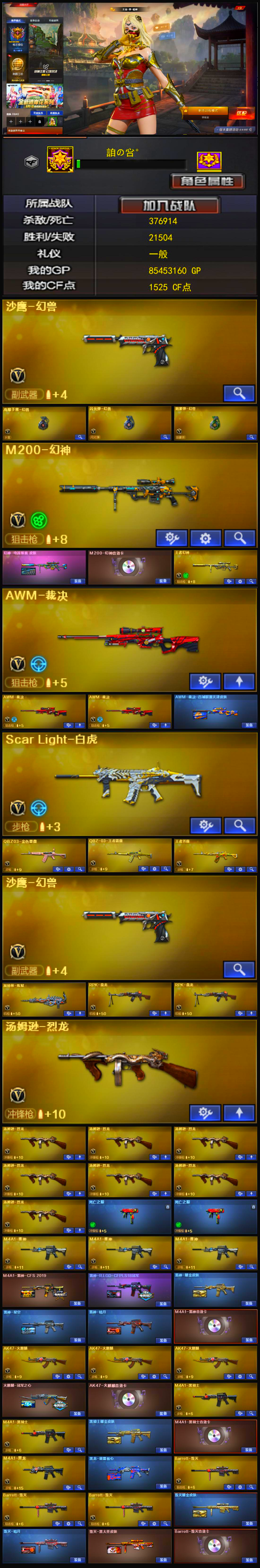 可排位/M200-幻神+音效卡+电流骇客/绝版幻兽套+8烈白虎QBZ蔷薇+满副爆破生化;RPK-盘龙,QBZ03-金色蔷薇,M200-幻神,Scar Light-白虎,