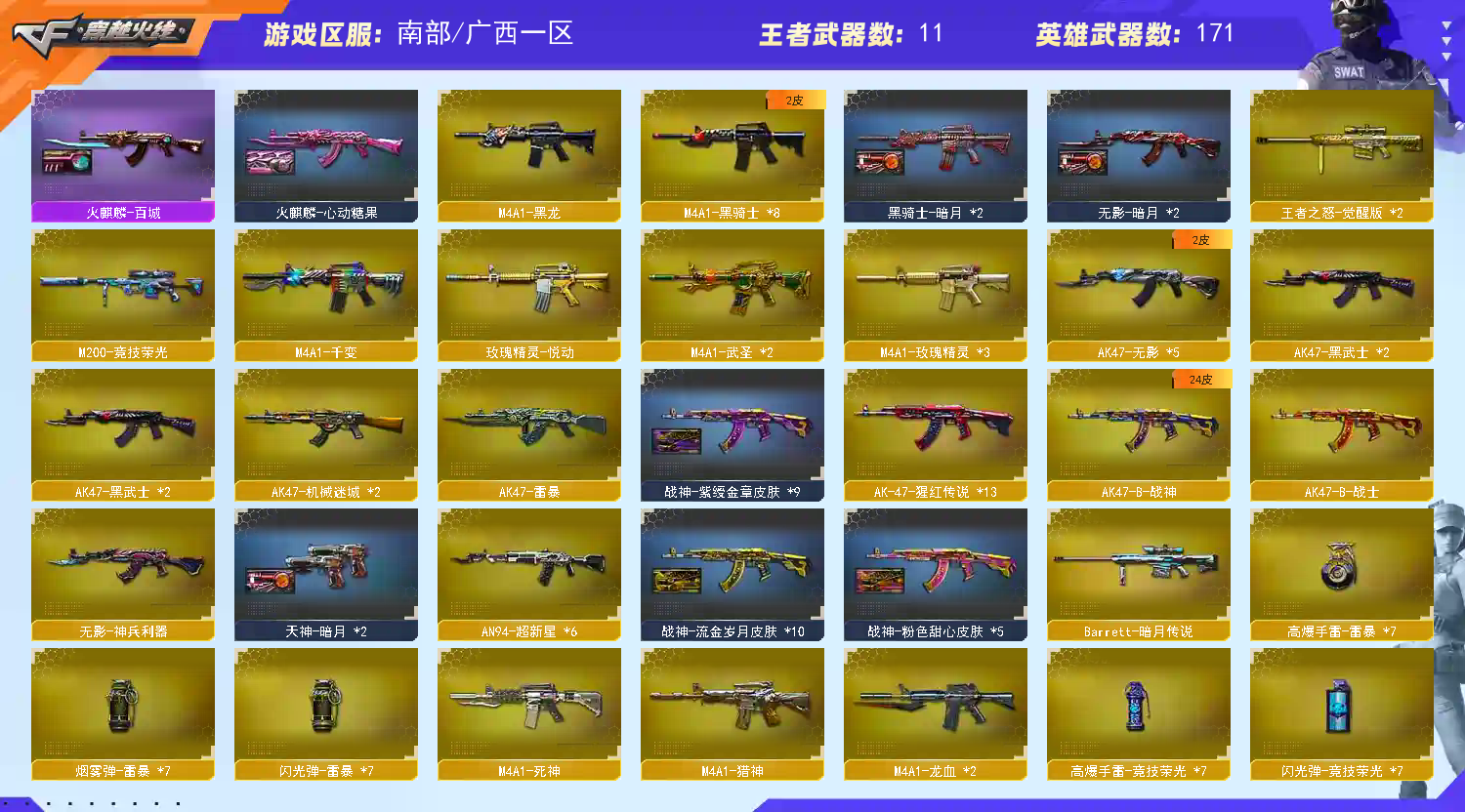 【遇到信用分不足时去请旧版大厅进入普通频道,请勿开科技和功能鼠标,感谢你么么哒】 【步枪系列】M4A1-雷神/黑龙/黑骑士*8/千变/死神/武圣/龙血/玫瑰精灵/猎神/海王/能量核心/AK47-火麒麟/麒麟/无影/黑武士/机械迷城/雷暴/战士/战神/常胜将军/摸金校尉/能量核心/龙太子/冰龙粉碎者/超新星/QBZ03-金色蔷薇/ 【狙击枪】M200-幻神竞技荣光/ AWM-天龙/裁决*/Barrett-毁灭/极光/暗月传说 【副武器】 沙鹰-天神*3 /沙鹰-修罗*5/COP-雷霆王者/USP-雷暴*3/COP-堕天神/柯尔特-竞技荣光/破空枪刃-夜魔/闸释者III/COP-旗袍/MAC-涂鸦 【近身武器】麒麟刺 / 龙啸/ 屠龙 /擎天/马来剑-夜魔/擎天竞技荣光/斩神刀-雷暴/手斧-镜15/猫猫手套/金刚伞/黄金迷你深渊冰龙/唐刀 【投掷武器】雷暴套装*7/竞技荣光套装*8/夜魔套装*3/迷你生化手雷 【炫金王者】王者之心觉醒/王者之魄觉醒/王者之势觉醒/王者之怒觉醒/王者之峰觉醒 【生化挑战】 RPK-盘龙*6/加特林炼狱/汤姆逊-烈龙*6 /斯泰尔-枪娘暗刃/AA12-雷霆/激光毁灭者III/神圣爆裂者III/末日裁决/ 六烈六盘 / 六盘六烈/ 6烈6盘 /6盘6烈 /生化号/爆破号/可排位 【稀有角色】电竞教官-云悠悠【自定义4防】王者-春【爆破4防】春/葵/樱【佣兵觉醒 无需换弹7秒/生化觉醒 狂暴化】捕食者之眼/生化背包变更 【通用道具】双1-7背包 / 步枪弹匣 / 冲锋枪弹匣 / 机枪弹匣 / 散弹枪弹夹 / 手枪弹夹 / 挑战弹夹 / 金蛇戒 / 魔龙戒 / 圣龙戒 / 银蛇戒 / 锋芒环 / 防弹头盔 / 烟雾保护头盔 / 防弹衣 / C4工具钳 / 手雷包 / 闪光护目镜/超级护目镜/超级背包/透明头盔/透明护目镜/ 超级对讲机 /新彩色昵称/C4.红龙/CFs击杀图标/语音特效-生化 【生化专用】生化弹夹/防化服/幽灵之刃/减少停顿道具(不退包)/灵魂忍者1/绿巨人/变异宝贝/伪装幽灵/ 迷你生化手雷 / 肩膀佩戴超级对讲机(榴弹3/22) 【皮肤音效玩偶】【火麒麟轻羽/雷神/CFSTAR/百城】【黑龙暗月】【雷神机甲刑天】【黑骑士暗月】【无影暗月】【天龙传奇70kg】【毁灭暗月/黑大圣】【极光能量核心】【修罗暗月】 玩偶悦动 【4大战区】南部战区;USP-雷暴,电竞教官-云悠悠,RPK-盘龙,QBZ03-金色蔷薇,