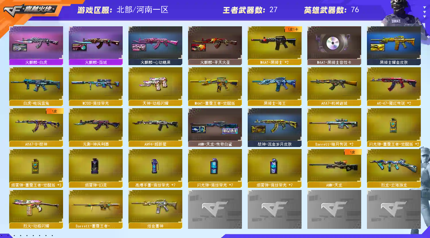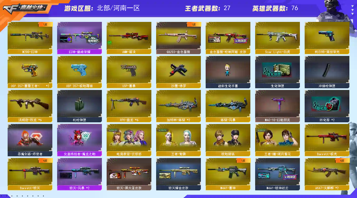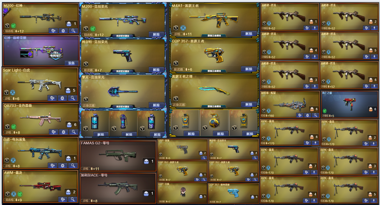 生化爆破双全装 幻神 白虎 qbz usp雷暴 cop白鲨 金色蔷薇空小人枪 裁决雪莉杨 9a91烈火 竞技荣光套 雷霆王者套 7套竞技荣光雷 7套雷霆王者雷 qbz枪娘阿敏皮肤 毁灭耀金皮肤 雷神赵云皮肤 火麒麟ag皮肤 黑骑士耀金皮肤 猫猫手套 佣兵觉醒属性 6烈死亡之眼 6盘炼狱不换弹!!;USP-雷暴,电竞教官-云悠悠,RPK-盘龙,QBZ03-金色蔷薇,M200-幻神,Scar Light-白虎,