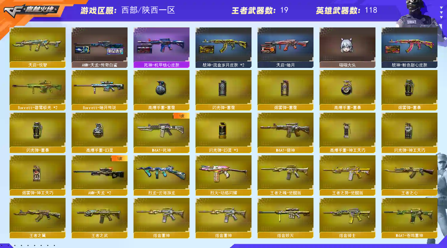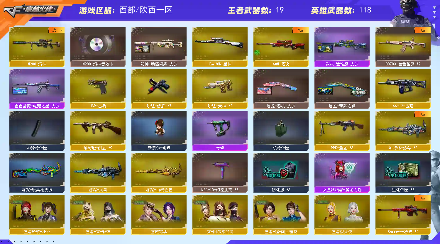☞温馨提示:该号财产已备案,实名租号,切勿以身试法!⓵严🈲【使用或浏览外挂等第三方软件】,毁号违法必究!⓶严🈲【恶意撤单/排位离线】!如有违🈲,平台永久拉黑/追究相应的法律责任!!!亲们,请自重自爱!素质租号!良心游戏!账号其它及具体道具请以游戏内为凖!期限道具请勿挂怀!多谢赏光!记得収藏和好评哟~ 可排位-西部战区(电信/陕西一区),全网最低特价爆破、生化、挑战极品三全装 ☀全⓮背包☀✅雷暴❶套(USP-雷暴、斩神刀-雷暴、高爆手 雷-雷暴、烟 雾 弹-雷暴、闪 光 弹-雷暴)✙✅雷霆❶套(巨龙咆哮III、尼泊尔-雷霆、高爆手 雷-雷霆、烟 雾 弹-雷霆、闪 光 弹-雷霆)✅王者炽天使、王者玲珑-小乔(所有生化模式“朂强四属性”功能型角色)、王者-葵-貂蝉(所有生化模式“朂强四属性”功能型角色)、女战神、王者-零-传说之路(双全模式“三防属性”功能型角色)、职业选手(绝迹语音包、白鲨语音包)、修道士、西部牛仔-网巴专属、空(所有生化模式“朂强三属性”功能型角色)、灵狐者-黄金海岸(双全模式“三防属性”功能型角色)、初恋灵狐、灵狐者-七夕宝贝、灵狐者-X、潘多拉-甜心教官、圣诞潘多拉-X、潘多拉-X、暗夜-X、铁骑荣耀、樱-战斗天使、龙儿-小淘气、妩媚妖姬、救世复仇✅⑰王者(王者玲珑-小乔、王者-葵-貂蝉、王者-零-传说之路;王者之怒、王者之武、王者之翼、觉醒版王者之魂、觉醒版王者之击、觉醒版王者之啸;玫瑰精灵-悦动、天启-悦智、超新星-悦享)⑤炫金(炫金毁灭、炫金骑士、炫金修罗);Kar98K-星神、M200-幻神、Barrett-朱雀;HK417-朱雀、白虎、9A91-烈火、M4 A1-龙血、AK 47-黑鲨、AA-12-雷霆、AWM-裁决;火麒麟-雷神、暗月火麒麟、AK 47-B-战神、AK 47-B-战士、AK 47-猩红传说;斯太尔-蝴蝶/死 亡之眼✙⓺烈龙⓺盘龙✙炼狱-风暴/加特林-炼狱✅雷神音效卡、黑骑士音效卡、火麒麟音效卡、毁灭音效卡、幻神音效卡;✅㊿皮肤❄雷神-宠儿-2019MVP、雷神-荣耀之魄、雷神-耀金、雷神-星空、雷神-宇航兔兔、雷神-烈虎、雷神-机甲刑天、雷神-暗月、雷神-能量核心;黑骑士-冠军之势、黑骑士-CFS2021、黑骑士-耀金、黑骑士-宇航蓝兔、黑骑士-白马银枪、黑骑士-摸金校尉、黑骑士-暗月;毁灭-BEAN-2020MVP、毁灭-冠军之怒、毁灭-荣耀之怒、毁灭-耀金、毁灭-星空、毁灭-风暴、毁灭-黑大圣、毁灭-青帝、毁灭-神秘黑洞;火麒麟-冠军之心、火麒麟-轻羽、火麒麟-传奇EVEN、火麒麟-AG战队、火麒麟-CFSTAR、火麒麟-百城、火麒麟-平天大圣、火麒麟-雷神;黑龙-361;AK 47-黑武士-361;千变-孔明;天龙-传奇70KG、天龙-传奇白鲨、天龙-CFSTAR;烈龙-星空;炼狱-玩具枪、战神-紫绶金章、战神-流金岁月、战神-粉色甜心、老兵传说;修罗-星空、修罗-CFSTAR、修罗-能量核心;天神-宇航兔兔、天神-暗月;屠龙-荣耀之锋;龙啸-冠军之啸✅⓴玩偶❄哪吒玩偶、敖丙玩偶、王者刀锋玩偶、秘银刀锋玩偶、孙悟空玩偶、审判者玩偶、铁骑玩偶、黄金幸运猪猪玩偶、深渊红龙玩偶、异形终结者玩偶···;USP-雷暴,RPK-盘龙,QBZ03-金色蔷薇,M200-幻神,Kar98K-星神,