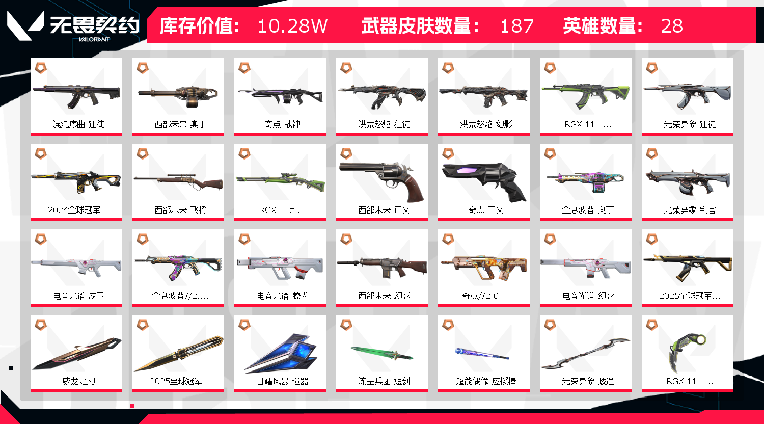 【拥有套装】光荣异象套装(光荣异象-狂徒,光荣异象-冥驹,光荣异象-判官,光荣异象-标配,光荣异象-歧途)电音光谱套装(电音光谱-幻影,电音光谱-獠犬,电音光谱-戍卫,电音光谱-标配,谐波音谱)西部未来套装(西部未来-幻影,西部未来-奥丁,西部未来-飞将,西部未来-正义,未来开拓者)洪荒怒焰套装(洪荒怒焰-幻影,洪荒怒焰-狂徒,洪荒怒焰-骇灵,洪荒怒焰-短炮,洪荒双斩)奇点2.0套装(奇点//2.0-狂徒,奇点//2.0-鬼魅,奇点//2.0-蝴蝶刀)2025全球冠军赛套装(2025全球冠军赛-狂徒,2025全球冠军赛-蝴蝶刀 )2024全球冠军赛套装(2024全球冠军赛-幻影,2024全球冠军赛-战刀)耀鳞威龙套装(耀鳞威龙-狂徒,耀鳞威龙-鬼魅,威龙之刃)离子武器套装(离子武器-幻影,离子武器-冥驹,离子武器-雄鹿,离子武器-正义,离子武器-能量剑)