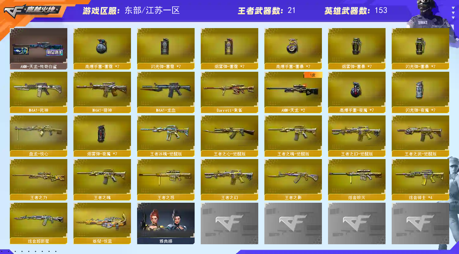 166V极品全能号幻神白虎G36雷霆套夜魔套六盘六烈炼狱加蝴蝶王幻春关小雨;USP-雷暴,柯尔特-荣耀世冠白鲨2023,RPK-盘龙,QBZ03-金色蔷薇,G36C-幻影,M200-幻神,Scar Light-白虎,