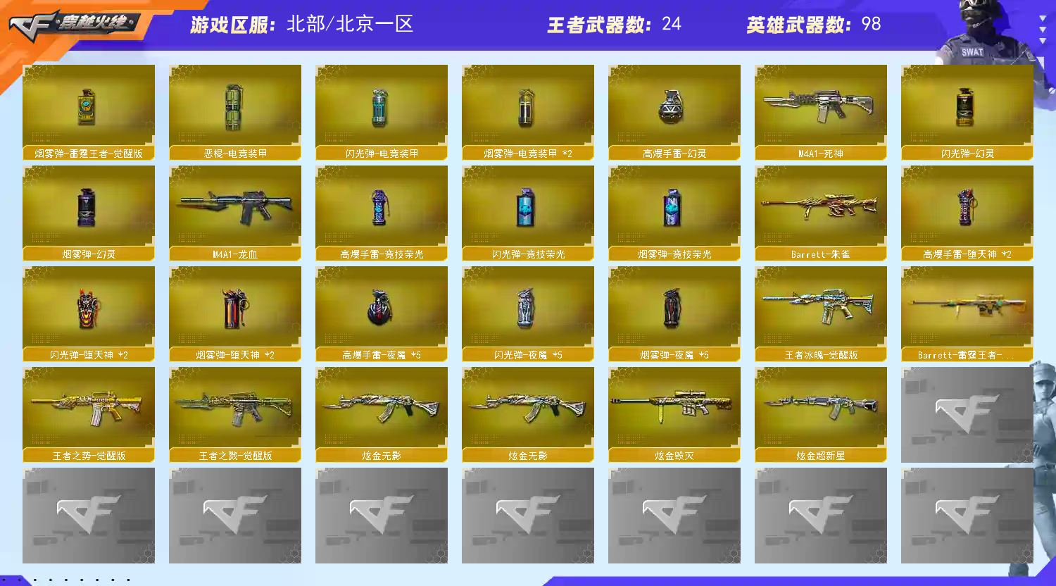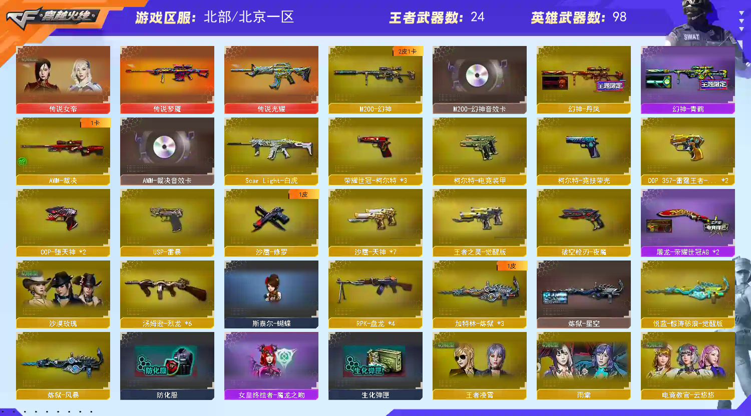 生化爆破全装 到时无租不挤号 禁止使用外挂 禁止坐挂车 一经发现 法律维权;USP-雷暴,荣耀世冠-柯尔特,沙漠玫瑰,传说女帝,电竞教官-云悠悠,RPK-盘龙,M200-幻神,