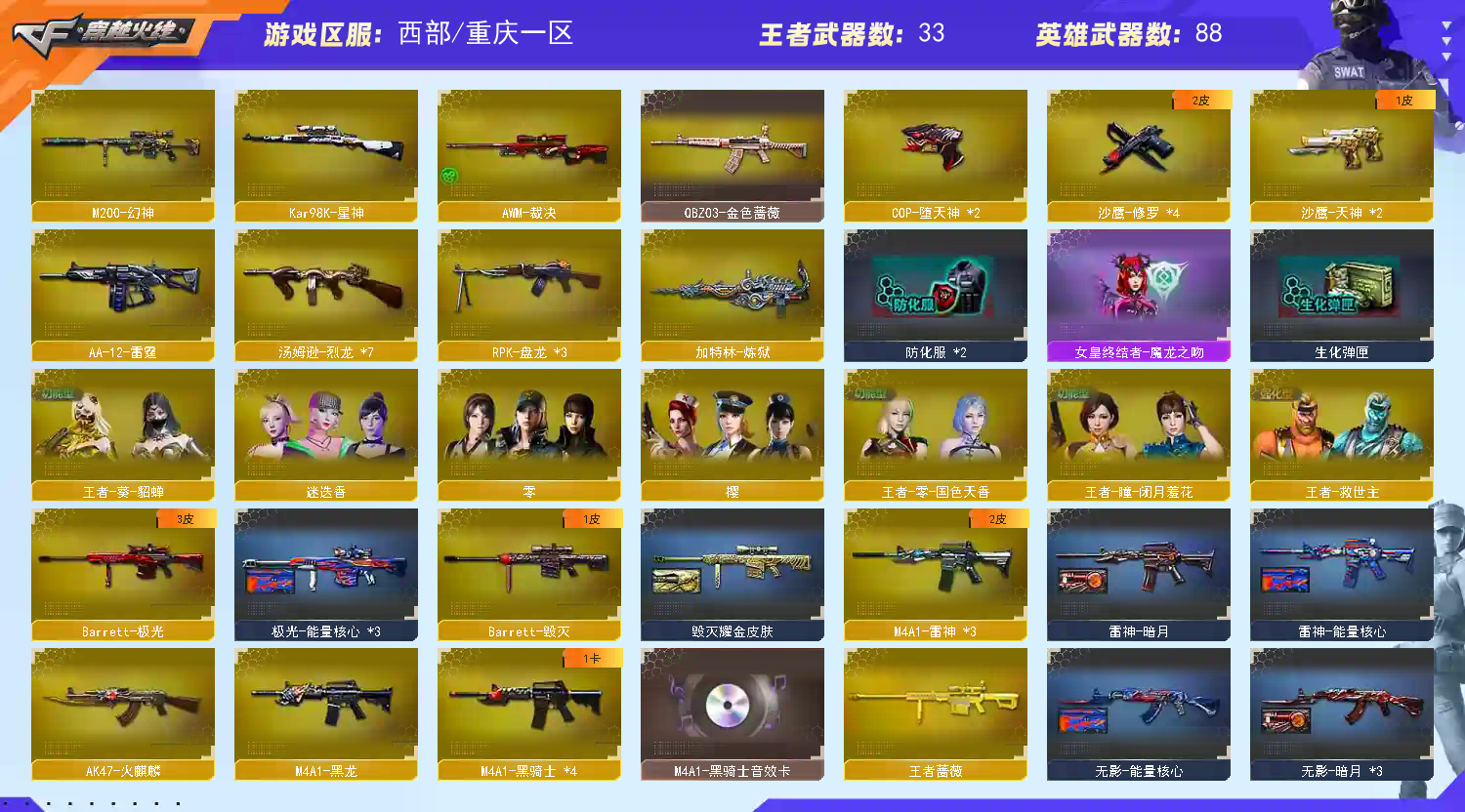 爆破生化全装|M200幻神|6烈龙死亡之眼|王者之光之武之击之力之魂|炫金黑龙|火麒麟雷神天龙激光无影黑武士|天神修罗 西部战区合区大区(四川一区、四川二区、重庆一区、陕西一区、云南一区)登录的时候选择重庆一区。 【 CQ24】:允许排位 【昵 称】:sepsp007 【角 色】:少将等级、零、樱、堕天使、邓紫棋、救世复仇、救世主、王力宏、活力灵狐、夜玫瑰、深海之兰、飞狐、烟雾保护头盔、闪光护目镜、双蛇戒指、8周年戒指 【主 武】:王者之势、王者之鲨、王者之光、王者之武、炫金黑龙、玫瑰精灵悦动、火麒麟、雷神X3(能量核心、暗月)、烈火、无影(能量核心)、黑武士、超新星、武圣、玫瑰精灵、天龙(秘银)、极光(能量核心)、炼狱、火麒麟暗月、黑武士暗月X3、天蝎座、处女座、金牛座、苍雷、白羊座、射手座、苍雷、乱世、征服者、死亡之眼、斯泰尔巧克力、激光毁灭者3级 【副 武】:武圣手枪、天神X2(暗月)、修罗X4(能量核心)、COP旗袍、胜利之火、凤凰之火 【近 身】:王者之击、擎天、屠龙X2、龙啸、麒麟刺、暗杀之拳、破天斩魔剑、金砖、断离、清刚 【投 掷】:闪光弹、烟雾弹、手榴弹、高爆手雷雷蛇、胜利之光、凤舞云烟 【道 具】:7个背包、炫彩背包、AC(防弹头盔-防弹衣)、手雷包、C4工具钳、狙击枪弹夹、手枪弹夹、步枪弹夹、变异宝贝;RPK-盘龙,QBZ03-金色蔷薇,M200-幻神,Kar98K-星神,