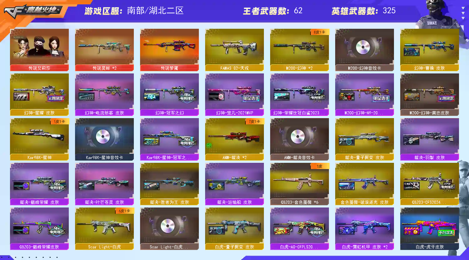 >>>>>>毁号,涉及毁坏虚拟财产罪及计算机安全罪,请文明游戏素质游戏,让我们共建美好租号平台>>>>>> 本游戏账号:英雄武器259个; 王者武器59个。 装备不多,但是主武器、副武器、近身武器够用 拥有完美游戏体验。重要的是,特殊装备有:AK47-火麒麟、传说梦魇、传说灵眸、麒麟刺、HK417-朱雀、M200-幻神、加特林-炼狱、M4A1-玫瑰精灵、黑骑士-海王、王者之幻、炫金毁灭、王者之翼、炫金雷神、炫金黑龙、王者之怒、炫金天龙、王者之力、王者之光、炼狱-悦蓝、王者之势、王者之魄、炫金火麒麟、王者之魄-觉醒版、炫金骑士、王者之心、玫瑰精灵-悦动、王者之城、王者霜心、王者之锋-觉醒版、王者之怒-觉醒版、王者之光-觉醒版、王者雷怒、火麒麟-灵狐、火麒麟-暗月、魅影、职业选手、王者沙漠玫瑰、堕天使、王者-零、王者之瞳、王者王力宏、王者之魄金色光效、王者之啸金色光效、王者之心金色光效、生化弹匣、加特林-炼狱音效卡、等,随意畅选。 注意事项: A.游戏过程中请不要恶意挂机或者不文明发言 B.恶意挂机、顶号等行为将被拉黑无法再次下单 C.进入游戏后中途请勿退出登陆,否则无法再次上号;柯尔特-无冕之王,荣耀世冠-柯尔特,柯尔特-荣耀世冠白鲨2023,柯尔特-冠军之特,炽芒蝶刃,Knife-冠军之刃,隼,