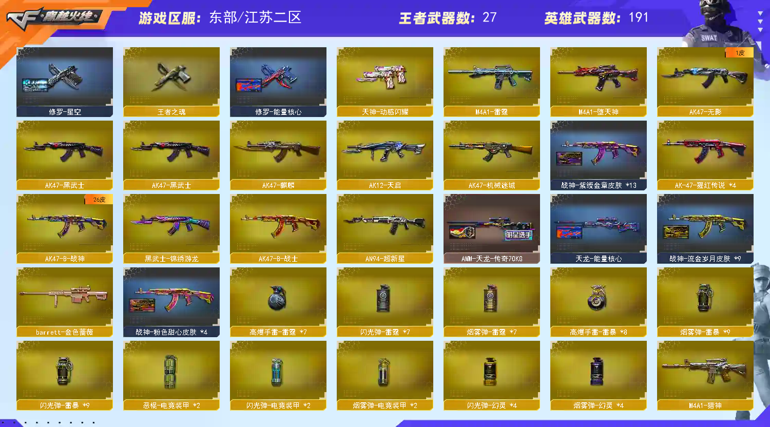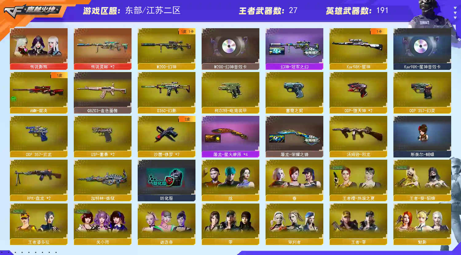 东部号 190V🔥传说影煞/灵眸/幻影/幻神三件套+冠军/星神三件套/蝶刃冠军之特🔥传奇/虎将皮四防【江苏二区登录】【炫金稀有顶1V介意者勿租】【恶意投诉、撤单不想玩了租错号了等非帐号问题1律拉黑】【此号已备案请勿以身试法】【开挂必究账号价值超高】详细武器请看下方 【重要套装】堕天神套装/云龙套装/四防角色 【重要角色】传说影煞/_零/_春/_炫/魅影/_迷迭香/审判者/关小雨/王者-瞳-闭月羞花/王者樱-热浪之夏/王者-葵-貂蝉/王者炽天使/王者潘多拉/王者影豹/王者-零/堕落女神/王者零-传说之路/乔伊教练/新海豹突击队/灵动武士/灵狐者-职业经理/卡塔琳娜/樱-缤纷夏日/铁骑-乘风破浪/空/零-水下丽影/灵狐者-黄金海岸/兰-海滩派对/新灵狐者/云海玲珑 【传说武器】传说灵眸(2) 【英雄武器】_M200-幻神/Barrett-毁灭(5)/Barrett-极光(2)/Barrett-朱雀/barrett-金色蔷薇/雷霆之怒/王者之怒-觉醒版/Kar98K-星神/AWM-天龙/AWM-裁决/M4A1-堕天神/M4A1-雷神(5)/M4A1-黑龙(2)/M4A1-黑骑士(2)/M4A1-雷霆/M4A1-猎神/王者之魄-觉醒版/王者之武-觉醒版/王者之势-觉醒版/王者冰魄-觉醒版/AK12-天启/AK47-火麒麟(2)/AK47-无影/AK47-麒麟/AK47-黑武士/AK-47-猩红传说(4)/AK47-机械迷城/AK47-B-战士/AK47-B-战神/AN94-超新星/QBZ03-云龙/QBZ03-金色蔷薇/王者之影-觉醒版/烈火-动感闪耀/9A91-烈火(2)/RPK-盘龙(2)/汤姆逊-烈龙/加特林-炼狱/COP-堕天神(2)/COP 357-云龙/COP 357-幻灵/雷霆之契/天神-动感闪耀/沙鹰-修罗(7)/柯尔特-电竞装甲/USP-雷暴(2)/云龙扇/麒麟刺-堕天神(2)/龙啸/龙啸-堕天神/擎天/王者之击-觉醒版/屠龙-动感闪耀/屠龙(5)/雷霆之锋/王者之锋-觉醒版/斩神刀-雷暴(2)/炽芒蝶刃/手雷-动感闪耀/高爆手雷-云龙(6)/高爆手雷-雷暴(8)/高爆手雷-雷霆(7)/高爆手雷-堕天神(6)/烟雾弹-云龙(6)/烟雾弹-幻灵(4)/烟雾弹-雷暴(9)/烟雾弹-雷霆(7)/烟雾弹-堕天神(6)/烟雾弹-电竞装甲(2)/恶棍-电竞装甲(2)/闪光弹-云龙(8)/闪光弹-幻灵(4)/闪光弹-雷暴(9)/闪光弹-雷霆(7)/闪光弹-堕天神(6)/闪光弹-电竞装甲(2)/黑武士-锦绣游龙/超新星-热带奇洋/G36C-幻影/王者芳薇-觉醒版/烈龙-云海游龙/擎天-云海游龙/龙啸-热带奇洋/手雷-云海游龙/手雷-热带奇洋 【王者武器】王者之心/王者之幻/王者之魄/王者之力/王者之怒(2)/烈龙-悦心/王者之魂/王者之啸 【小人枪】C.A.T/牛牛-AK47/AWM-灵狐-15周年嘉年华/巴雷特-零-水下丽影/天龙-曼陀罗/MK5-炽火炎龙/斯泰尔-蝴蝶/M37-葵/COP-旗袍/降世魔童/夺魂/迷你深渊冰龙(4)/迷你宝贝/迷你白狐/魔能飞环-曼陀罗/闪光弹-小乔/灵狐娃娃手雷 【其他重要武器】炫金雷神/炫金超新星/炫金黑龙/炫金骑士/炫金天龙/炫金修罗/AK47-冰龙粉碎者/激光毁灭者III/M4A1-破空冰刃/联想锋行黄金AK(2)/M4A1-十年火线/9A-91翡翠/HK417-赤血龙魂(3)/M14EBR-赤血龙魂/AK47-轮回/9A91-2017万圣节(2)/AK-12-CFS2017纪念版(2)/56式步枪-梨花/AK47-烛龙/M4A1-肯德基/M4A1C-死亡之翼/9A91-赤血龙魂(2)/M4A1-情人节2019(2)/AK47-十年火线/AK47-齐天大圣/金色小号/M4A1-秘银赤龙(2)/M4A1-SS-枪王排位(2)/Scar-Light-赤血龙魂(5)/AK47-狂欢-CFS/M4A1-紫狱(2)/AK-103-红色悦动/AK47-枪娘(2)/M4A1-狂欢-CFS/M14EBR-情人节2020/M4CQBR-AP-孔明/M4A1-水枪-机甲核心/火麒麟-桃园结义/G3A3-SS-枪王排位/神罚/M200-赤血龙魂(8)/M200-万圣节(2)/Barrett-炎龙/FN弩炮-CFS2017纪念版/AWM-恶棍-枪王排位/AWM-十周年/M200-情人节2019/AWM-蓝水晶/AWM-涂鸦(2)/98K-蓝色骑士/M200-朋克/AWM-小故障/AWM-万圣节2019/巴雷特-情人节2020/KAC-圣炎切割者III/末日裁决者/巨龙咆哮Ⅲ/M240B-卡通/雷蛇冲锋枪/EVO III-赤血龙魂/神圣爆裂者(2)/神圣爆裂者-末日/试炼破坏者III/SPAS-12-雷电核心/阐释者III/沙鹰-青龙/沙鹰-雷蛇/凤凰之灵/沙鹰-枪王排位(3)/新USP-枪王排位奖励(4)/Anaconda-麟龙/COP-青帝/Anaconda-雷电核心/Anaconda-炽焰核心/COP 357--绚樱/Anaconda-万圣节2019/柯尔特-百城/愤怒公牛左轮-枪王排位/COP 357-平天大圣/军用铁锹-飞龙在天/啸天/丛林匕首-枪王排位(2)/鹰爪-枪王排位/军用铁锹-赤龙(2)/Knife-冠军之刃/丛林匕首-卧龙(4)/蝴蝶刀-枪王排位/烟雾弹-机甲核心/闪光弹-枪王排位(2)/胜利奖杯烟雾弹-枪王排位 【重要武器皮肤】幻神-冠军之幻/毁灭-星空/毁灭-荣耀之怒/毁灭耀金皮肤/毁灭-墨兰皮肤/毁灭-云海游龙皮肤/极光-能量核心/AWM-天龙-传奇70KG/天龙-能量核心/火麒麟-CFSTAR/火麒麟-华夏之心/火麒麟-平天大圣/火麒麟-心动糖果/火麒麟-轻羽皮肤/无影耀金皮肤/雷神-荣耀之魄/雷神-虎将/雷神-暗月/雷神-能量核心/黑骑士耀金皮肤/黑龙-暗月/战神-流金岁月皮肤/战神-紫绶金章皮肤/战神-粉色甜心皮肤/修罗-星空/修罗-能量核心/屠龙-荣耀之锋/屠龙-星火燎原 【重要光效】Barrett-极光金色光效/M4A1-雷神金色光效/王者之啸金色光效/王者之幻金色光效/王者之影金色光效/王者之怒金色光效/王者之武金色光效/王者之锋金色光效/王者之魄金色光效/AN94-超新星蓝色光效/AWM-天龙蓝色光效/巴雷特-毁灭蓝色光效/沙鹰-修罗蓝色光效/AK47-火麒麟蓝粉色光效/M4A1-黑骑士蓝粉色光效/沙鹰-修罗蓝粉色光效/加特林-炼狱蓝粉色光效/擎天蓝粉色光效/M200-幻神紫橙光效/AK12-天启紫橙光效/AK47-无影紫橙光效/AN94-超新星紫橙光效/Barrett-毁灭紫橙光效/Kar98K-星神紫橙光效/M4A1-雷神紫橙光效/加特林-炼狱紫橙光效/屠龙紫橙光效/AK47-黑武士绿色光效/王者之势绿色光效 【重要音效卡】Barrett-极光音效卡/Kar98K-星神