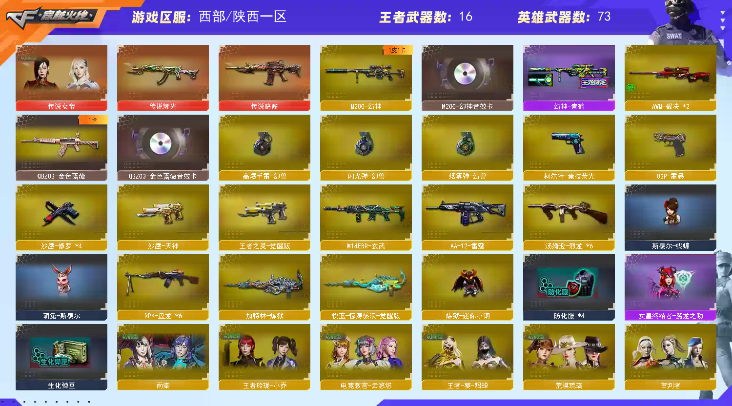 禁排位 信誉分不足时请在新版大厅匹配游戏! 【步枪系列】传说暗裔/传说辉光/M14EBR玄武/M4A1青龙/AK47火麒麟/AK47无影/黑武士/M4A1-雷神/黑骑士/死神/龙血/HK417朱雀/-白虎/十二生肖/能量核心AK47-/AN94超新星/黑鲨/白虎电玩蓝兔/ 【狙击枪】/竞技荣光/M200幻神带皮肤青鹤皮肤加音效/朱雀 AWM-天龙/裁决/毁灭*2/Kar 98K-星神王者星神/王者森决/ 【辅助枪 / RPK-盘龙*6/加特林炼狱*2迷你炼狱小刚。/悦篮/汤姆逊-烈龙*7AA12-雷霆/神圣爆裂者III//迷你生化手雷/死亡之眼/ 斯太尔蝴蝶 /斯泰尔萌兔/ 六烈六盘 / 六盘六烈 / 6烈6盘 / 6盘6烈 /生化号 / 爆破号 / 可排位 【炫金王者】王者之魄/御-炼狱-女娲 【角色】传说女帝/电竞教官云悠悠/荒漠流离/雨棠/王者葵貂蝉/王者玲珑小乔/王者葵惊若翩鸿/王者涂鸦/春/樱/暗夜X/北极狐X灵狐者黄金海岸/零水下丽影/妲己/孙悟空【佣兵觉醒 无需换弹7秒/生化觉醒 狂暴化】捕食者之眼 【副武器】科尔特竞技荣光/ 沙鹰修罗*9//沙鹰天神*3/USP雷暴/MAC-涂鸦/沙鹰幻兽/COP旗袍 【近身武器】黄金猫猫手套白鲨/兔宝宝/能扛,能打滑板鞋/金刚闪电玩红兔/王者玉风/麒麟刺*/ 屠龙 *6/擎天/斩神刀,雷暴/龙啸/黄金生化钩/猫猫手套/轻型军用手斧-镜 【投掷武器】迷你生化手雷/高爆手雷-雷暴+7 【通用道具】双1-7背包 / 手枪弹匣 / 金蛇戒 / 狙击枪弹夹 / 魔龙戒 / 散弹枪弹夹 / 圣龙戒 / 挑战弹夹 / 银蛇戒 / 防弹头盔 / 烟雾保护头盔 / 防弹衣 / C4工具钳 / 手雷包 / 步枪弹匣 / 冲锋枪弹匣 / 机枪弹匣 / 闪光护目镜/超级护目镜/超级背包/透明头盔/透明护目镜/ 超级对讲机 /新彩色昵称/C4.红龙 【生化专用道具】生化弹夹/防化服/幽灵之刃/减少停顿道具(不退包)/灵魂忍者/绿巨人/变异宝贝/ 迷你生化手雷 / 肩膀佩戴超级对讲机(榴弹3/22) 【皮肤音效玩偶 毁灭耀金皮肤/火麒麟ag战队皮肤 雷神虎将皮肤/毁灭耀金皮肤火麒麟百城。/毁灭青帝/雷神宇航兔皮肤 极光音效卡/毁灭音效卡/幻神音效卡/金色蔷薇音效卡/黑骑士音效卡/火麒麟音效卡 终结者玩偶/地狱终结者玩偶/深渊金龙玩偶/金色幸运猪玩偶/蓝色艾比玩偶/黄金幸运猪玩偶/王胖子玩偶 热门搜索,幻神皮肤 沙漠玫瑰 6盘6列 女帝 【西部战区;USP-雷暴,传说女帝,电竞教官-云悠悠,RPK-盘龙,QBZ03-金色蔷薇,M200-幻神,传说暗裔,