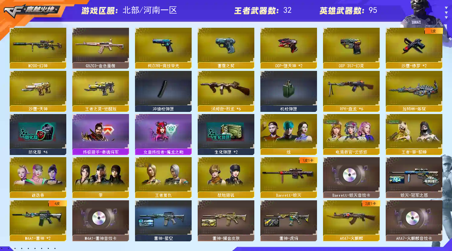 首页 > 租号大厅 > 穿越火线 > 网通区/河南一区 > M200竞技荣光套★6盘6烈★幻神朱雀毁灭AG冠军★火麒麟EVEN★雷神耀金★4音效★王者貂蝉