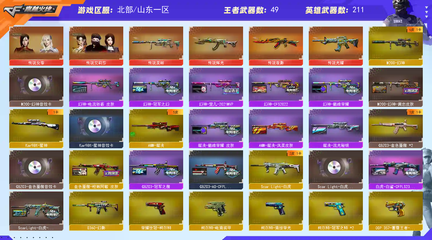 首页 > 租号大厅 > 穿越火线 > 网通区/山东一区 > 女帝6传说98幻神音-灵眸风神❤6色幻神宠儿巅峰冠幻CFS骇客黄忠❤️幻影冠军微特刃x2❤️生化满配