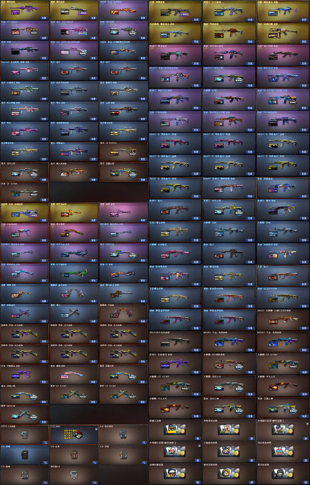 爆破生化双全号,爆破角色鹰,生化角色传说影煞 幻神电竞之星、传奇欧欧、宠儿、冠军之幻、CFS2022、动感闪耀6个皮肤带音效卡光效 星神AG、冠军之星、破竹3个皮肤带音效卡光效 无冕之王、冠军之特、荣耀世冠柯尔特、竞技荣光柯尔特、USP雷暴、王者雷霆cop、云龙cop、玄豹,冠军之刃 荣耀世冠全套、竞技荣光全套、冠军全套、云龙全套 炼狱泡泡象、MAC-10-千针棘鲨、MAC-10-龙宝、斯太尔-蝴蝶、异变清道夫-蛇影双骄、炽芒蝶刃-破浪逐光皮肤、6盘龙、6烈龙 幻影破浪逐光皮肤、白虎百战金芒、霓虹机甲、虎啸皮肤带音效卡光效、玄武、Vsk金蚀 极光能量核心皮带音效卡光效 火麒麟传奇EVEN石头-横秒之巅皮肤光效;USP-雷暴,柯尔特-无冕之王,荣耀世冠-柯尔特,柯尔特-冠军之特,炽芒蝶刃,Knife-冠军之刃,传说影煞,
