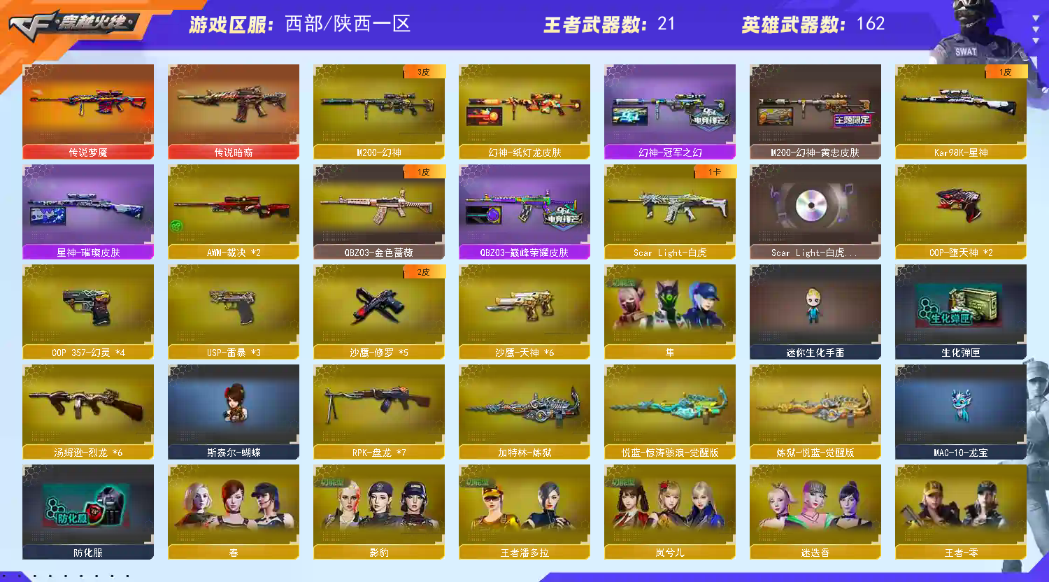 200v梦魇幻神3皮6盘6烈6黑骑3雷暴6cop,挑战满攻全能号;USP-雷暴,隼,RPK-盘龙,QBZ03-金色蔷薇,M200-幻神,Scar Light-白虎,Kar98K-星神,