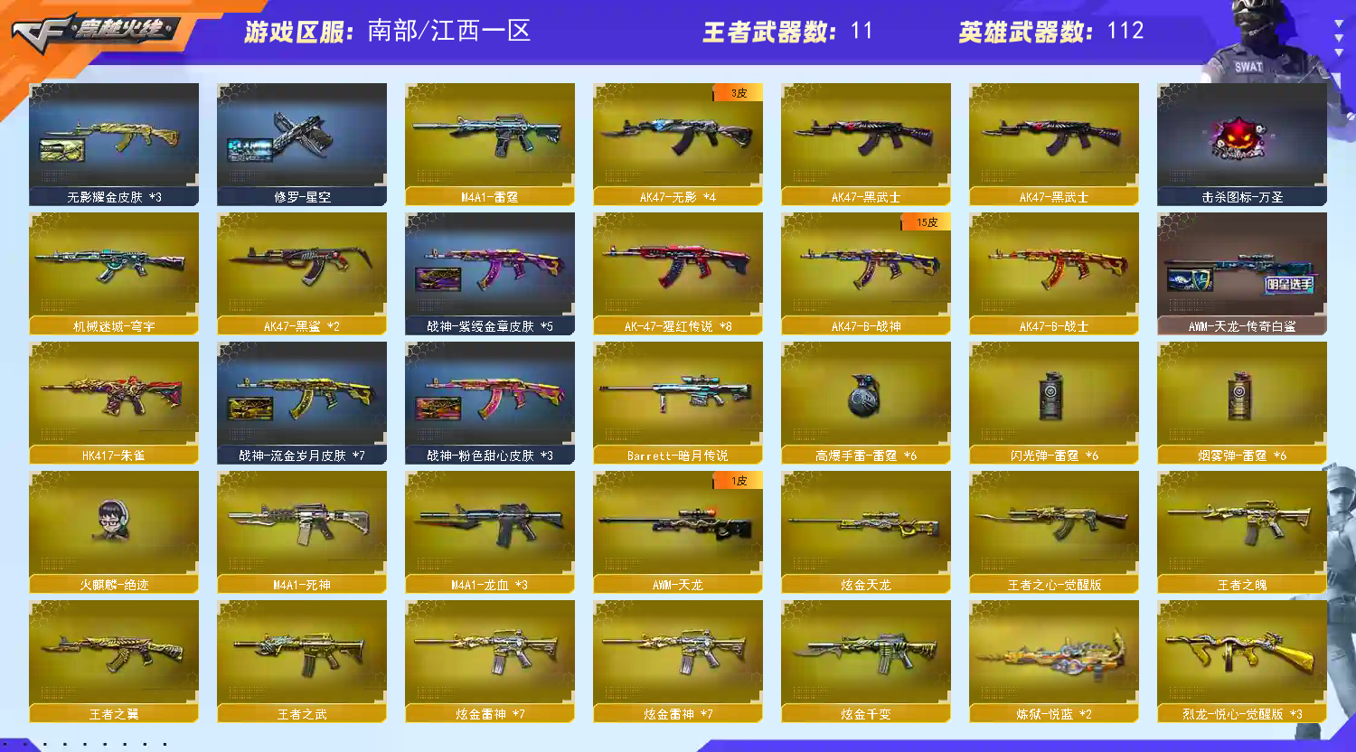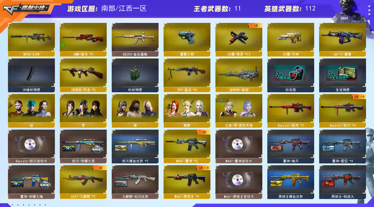 南部高端 111V可排🔥幻神+朱雀🔥荣耀冠军CFS白鲨轻羽皮🔥四防国色天香+全雷霆+绝迹+蔷薇+六盘六烈【江西一区登录】【炫金稀有顶1V介意者勿租】【恶意投诉、撤单不想玩了租错号了等非帐号问题1律拉黑】【此号已备案请勿以身试法】 【重要套装】雷霆套装/四防角色 【重要角色】_炫/_零/_葵/魅影/王者-零-国色天香/_炽天使/铁骑荣耀/铁骑-乘风破浪/兰-海滩派对 【英雄武器】_M200-幻神/Barrett-毁灭(4)/Barrett-极光(2)/Barrett-暗月传说/AWM-天龙/AWM-裁决(3)/M4A1-雷神(3)/M4A1-死神/M4A1-龙血(3)/M4A1-黑骑士(5)/M4A1-雷霆/HK417-朱雀/AK47-火麒麟(2)/AK47-无影(4)/AK47-黑鲨(2)/AK47-黑武士/AK-47-猩红传说(8)/AK47-B-战士/AK47-B-战神/QBZ03-金色蔷薇/王者之心-觉醒版/9A91-烈火(3)/RPK-盘龙(6)/汤姆逊-烈龙(5)/烈龙-悦心-觉醒版(3)/AA-12-雷霆/加特林-炼狱/雷霆之契/沙鹰-天神/沙鹰-修罗(12)/麒麟刺(2)/龙啸(8)/擎天/王者之击-觉醒版/屠龙(5)/雷霆之锋/高爆手雷-雷霆(6)/烟雾弹-雷霆(6)/闪光弹-雷霆(6) 【王者武器】王者之魄/王者之翼/王者之武/炼狱-悦蓝(2) 【小人枪】火麒麟-绝迹/闪光弹-小乔 【其他重要武器】炫金千变/炫金雷神(7)/炫金天龙/M4A1-仙界-黑骑士/激光毁灭者I/HK417-红龙/AK-103-红色悦动/M4A1-秘银赤龙(4)/M14EBR-赤血龙魂(5)/M4A1-破空冰刃(2)/黄金AK-47(2)/AK12-枪王排位/M4A1-Guitar 炫彩/AK-103-火线13周年/海浪AK47-浏览器/AK47-SS-9周年/AK47-破空冰刃/M4A1-SS-枪王排位/火麒麟-桃园结义/HK417-赤血龙魂/AK47-SS-枪王排位/98K-烛龙/M200-圣诞/M200-枪王排位/AWM-卡通/暗金M200/巨龙咆哮Ⅲ/斯泰尔-CFS2017纪念版/EVOⅢ-黑金传说/EVO III-赤血龙魂(3)/Anaconda-雷电核心(2)/沙鹰-枪王排位(3)/COP-金蝉子-枪王排位/Cop357-赤龙(2)/新USP-怒火大圣/新USP-枪王排位奖励(2)/愤怒公牛左轮-枪王排位/USP-黑大圣/COP 357-青龙/COP 357--绚樱(2)/军用铁锹-飞龙在天/虹光丛林匕首-枪王排位/斩魔刀-怒火大圣/蝴蝶刀-枪王排位/鹰爪-枪王排位/丛林匕首-卧龙(4)/闪光弹-枪王排位/手雷-能量核心/胜利奖杯烟雾弹-枪王排位 【重要武器皮肤】毁灭-荣耀之怒/毁灭耀金皮肤/AWM-天龙-传奇白鲨/雷神-荣耀之魄/雷神-暗月/雷神-星空/黑骑士-地狱火/黑骑士耀金皮肤/M4A1-千变-孔明皮肤/火麒麟-CFSTAR/火麒麟-轻羽皮肤/无影耀金皮肤/战神-流金岁月皮肤/战神-紫绶金章皮肤/战神-粉色甜心皮肤/修罗-星空/修罗耀金皮肤/修罗-CFSTAR 【重要光效】王者之心金色光效/AK47-黑武士蓝色光效/巴雷特-毁灭蓝色光效/沙鹰-修罗蓝色光效/龙啸蓝粉色光效/M4A1-雷神紫橙光效/M4A1-黑骑士紫橙光效/擎天紫橙光效/沙鹰-修罗紫橙光效 【重要音效卡】M4A1-黑骑士音效卡/火麒麟音效卡/毁灭音效卡/雷神音效卡 【重要戒指】龙眼(死神)/龙眼(鹰)/16赛季纪念戒指-枪王耀银/17赛季纪念戒指-耀金/18赛季纪念戒指-耀金/20赛季纪念戒指-耀金/21赛季纪念戒指-耀银(拇指)/22赛季纪念戒指-耀银(拇指)/23赛季纪念戒指-耀银(拇指)/24赛季纪念戒指-耀铜(食指)/24赛季纪念戒指-耀银(拇指);RPK-盘龙,QBZ03-金色蔷薇,M200-幻神,