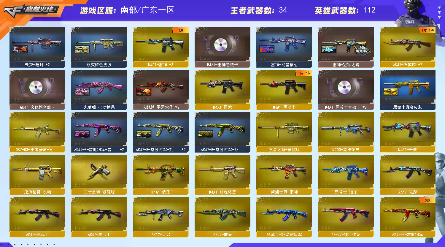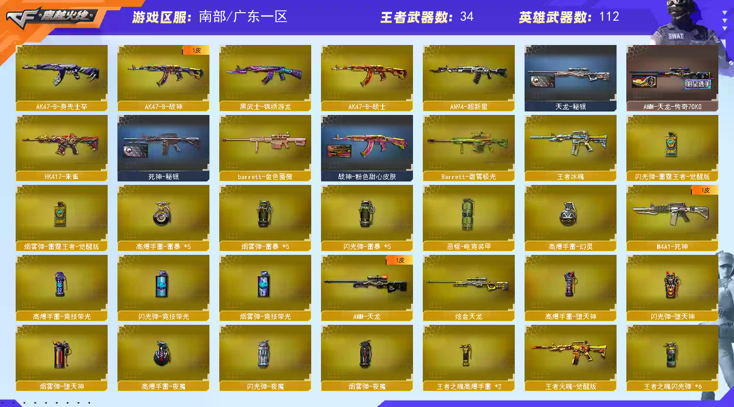 生化全装 六盘六烈、斯太尔蝴蝶、异变清道夫、毒蜂、黑轮吞噬者、防化服、生化弹夹、夺命利斧 爆破全装 M200-幻神、竞技荣光套、USP雷暴 【昵称】JFK031 【角色】电竞教官云悠悠,葵,零,迷迭香,王者-葵-貂蝉,王者-瞳-闭月羞花,王者玲珑-小乔,暗夜-X,芳心审判者,潘多拉-X,王者零-传说之路,甜心偶像,职业选手(70KG语音包) 【主武】传说圣灵,M4A1-千变,AK47-火麒麟,M4A1-黑龙,M4A1-雷神,M4A1-黑骑士,AK47-无影,M4A1-死神,AK47-黑武士,AK12-天启,AN94-超新星,M4A1-武圣,AK47-雷暴,HK417-朱雀,M4A1-玫瑰精灵,黑武士-网剧套装,荣耀世冠-雷神,雷神-葫芦兄弟,AWM-天龙,Barrett-毁灭,Barrett-极光,AWM-裁决,M200-幻神,M200-竞技荣光,Barrett-金色蔷薇,六盘龙,七烈龙,加特林炼狱,AA-12-雷霆,黑龙吞噬者,毒蜂,异变清道夫,斯泰尔蝴蝶,炫金黑龙, 【王者武器】王者之城,王者之心,王者之影,QBZ03-王者蔷薇,王者冰魄,王者火魄,王者之幻,王者之魄,王者之武,王者之光,王者之怒,王者之魂,王者之锋,王者之击, 【副武】沙鹰-修罗,沙鹰-天神,GLOCK18-武圣,COP-雷霆,USP-雷暴,柯尔特-竞技荣光,天神-网剧套装,COP-旗袍 【近身】屠龙,龙啸,擎天,麒麟刺,斩神刀-雷暴,麒麟刺-堕天神,马来剑-夜魔,擎天-竞技荣光,唐刀-神工天巧,王者之锋,王者之击, 【投掷】雷暴手雷套,堕天神手雷套,夜魔手雷套,竞技荣光手雷套,雷霆王者手雷套,王者之魄手雷套 【挑战】火狱乱世-超越MAX,冰龙粉碎者,激光毁灭者,神圣爆裂者, 【音效】70KG语音包,AWM裁决音效卡,M4A1-黑骑士音效卡,M200-幻神幻神音效卡,M4A1-雷神音效卡,AK47-火麒麟音效卡,Barrett-毁灭音效卡, 【道具】永久防弹衣,永久工具钳,永久手雷包,永久防弹头,永久夺命之镰,永久变异宝贝,永久生化弹夹,永久防化服,夺命利斧,步枪弹夹,狙击枪弹夹 【皮肤】毁灭-暗月,死神-秘银,极光-能量核心,毁灭-耀金,天龙-CFSTAR,火麒麟-CFSTAR,炼狱-星空,修罗-CFSTAR,雷神-冠军之魄,黑骑士-耀金,AWM-天龙-70KG,屠龙-荣耀世冠AG, 【更新时间】 【南部战区】广东一区、广东二区、广东三区、广东四区、广西一区、江西一区、南方大区、湖南一区、湖南二区、湖北一区、湖北二区、广东电信一区、广东电信二区、广东电信三区、广东电信四区、广西电信一区、江西电信一区、南方电信大区、湖南电信一区、湖南电信二区、湖北电信一区、湖北电信二区(CF相同战区进入相同频道可以一起玩);USP-雷暴,电竞教官-云悠悠,RPK-盘龙,M200-幻神,