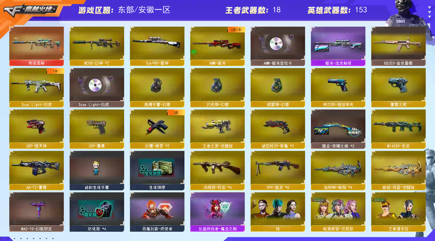 禁止开挂 不要用宏啊 各位老板 不然第三方检测 容易封号 各位老板玩的开心 老板们我就搞点水钱不挣钱的 不要坑我了 各位大哥高抬贵手;USP-雷暴,电竞教官-云悠悠,RPK-盘龙,QBZ03-金色蔷薇,M200-幻神,Scar Light-白虎,传说灵眸,