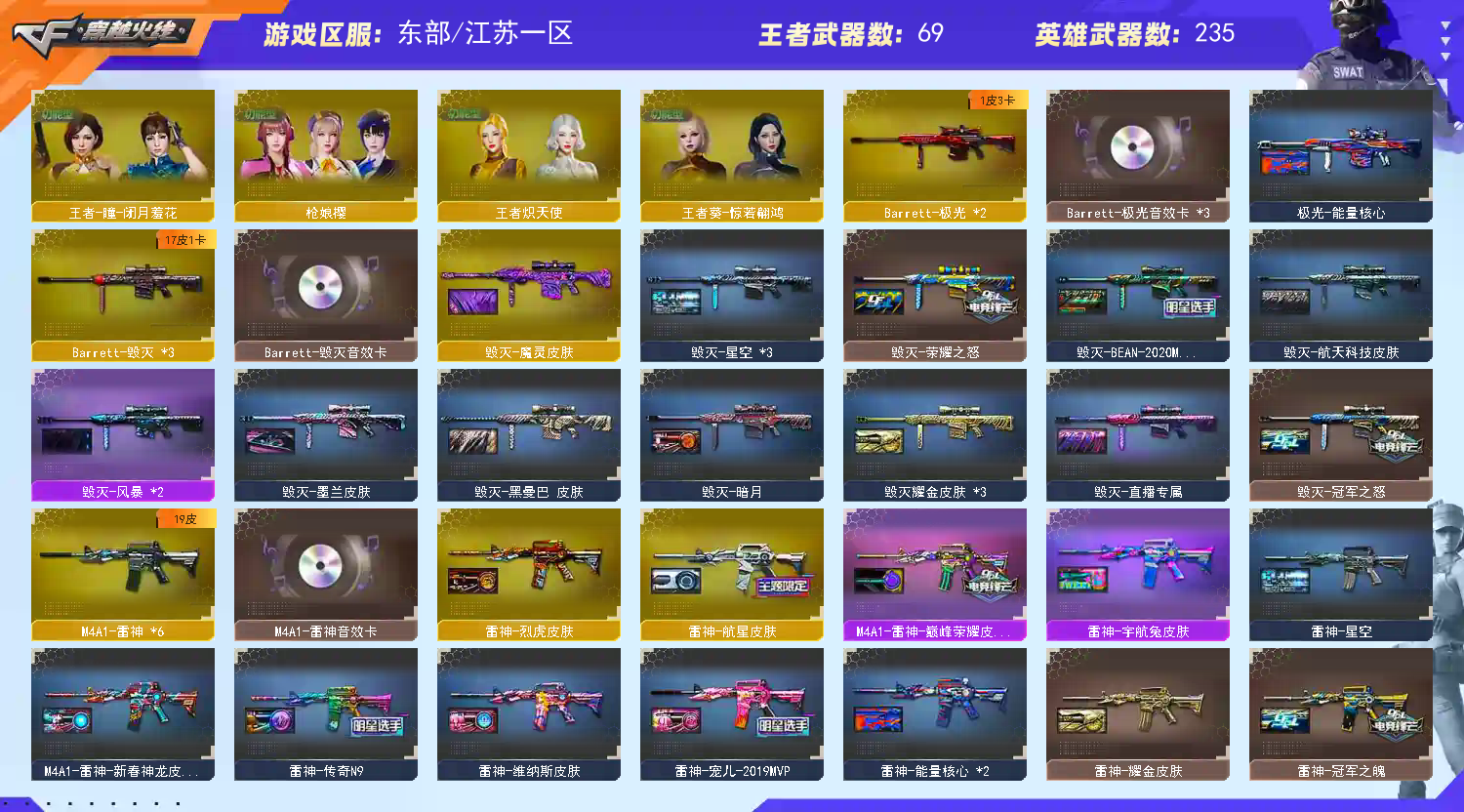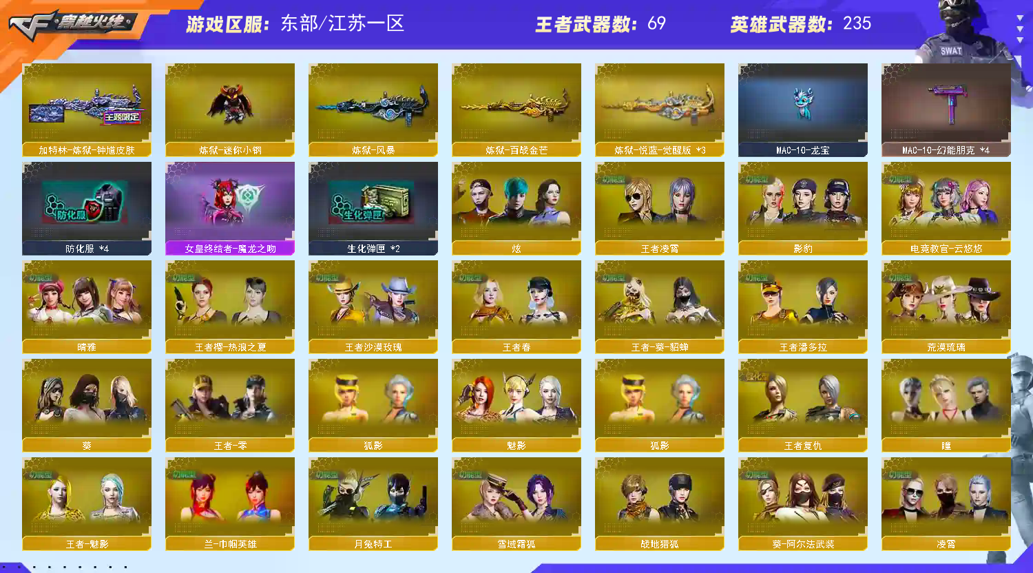 传说灵眸,影刹,艾丽莎,女帝,六烈六盘炼狱小刚,斯太尔蝴蝶,暗刃mac龙宝,m4a1小神龙,幻神三件套,星神三件套,所有武器均带皮带音效卡,双面神,生化满配,爆破满配,挑战满配,幻神皮肤拉满,幻神星火小队签字臻藏版,满配音效卡,青龙,玄武,朱雀,白虎四神兽枪。;USP-雷暴,荣耀世冠-柯尔特,柯尔特-荣耀世冠白鲨2023,柯尔特-冠军之特,炽芒蝶刃,Knife-冠军之刃,传说影煞,