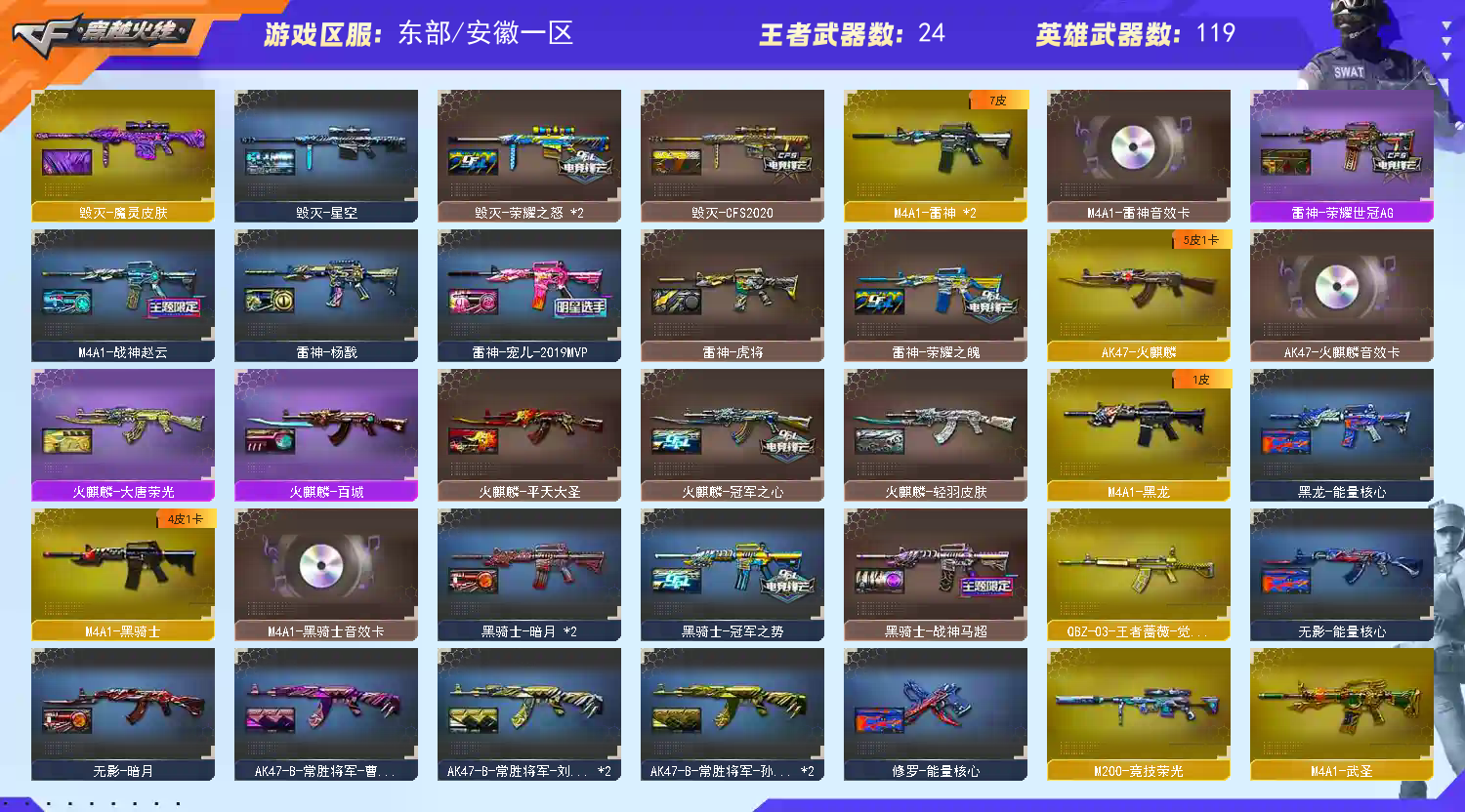首页 > 租号大厅 > 穿越火线 > 电信区/安徽一区 > 120v爆破幻神+2017+2022+音效卡、白虎、星神、荣耀套,冠军之特套、竞技荣光套,雷暴套
