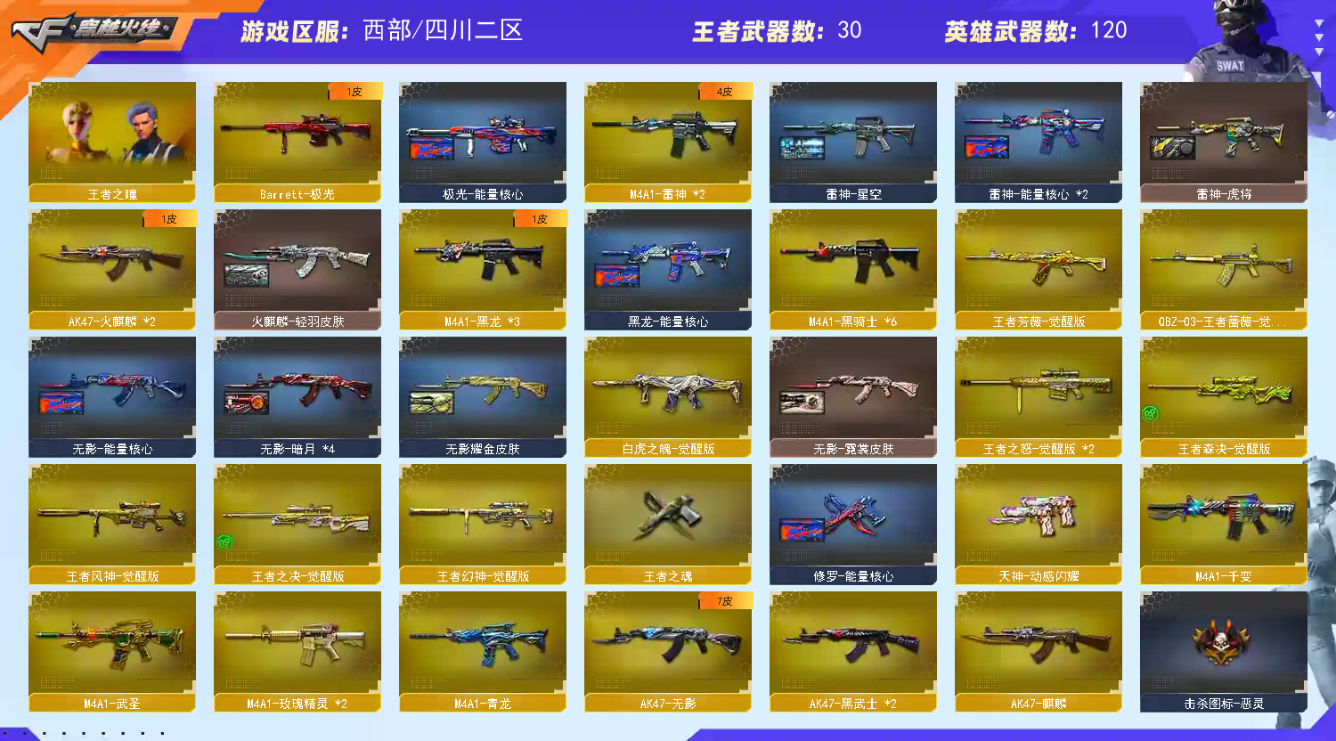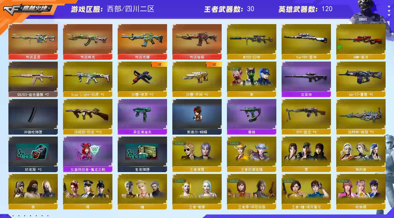160v王者幻神幻神王者风神6盘6烈6黑骑,全能号;隼,王者沙漠玫瑰,RPK-盘龙,QBZ03-金色蔷薇,M200-幻神,Scar Light-白虎,Kar98K-星神,