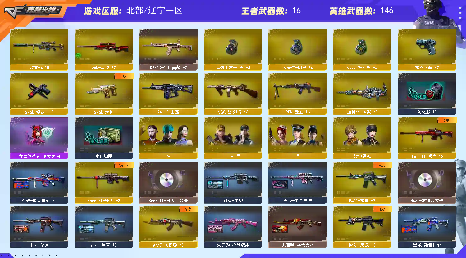 【北部战区】(吉林一区 黑龙江区 辽宁一二三区 合区)(河北一区 山西一区 北京一二三四区 合区)(山东一区 山东二区 河南二区 北方大区 合区)河南一区 147V幻神M200/6烈龙死亡之眼/6盘龙炼狱/幻兽套/雷霆套/朱雀/qbz03金色蔷薇/3音效卡/生化爆破全装 毁灭/雷神/黑骑士音效卡;RPK-盘龙,QBZ03-金色蔷薇,M200-幻神,