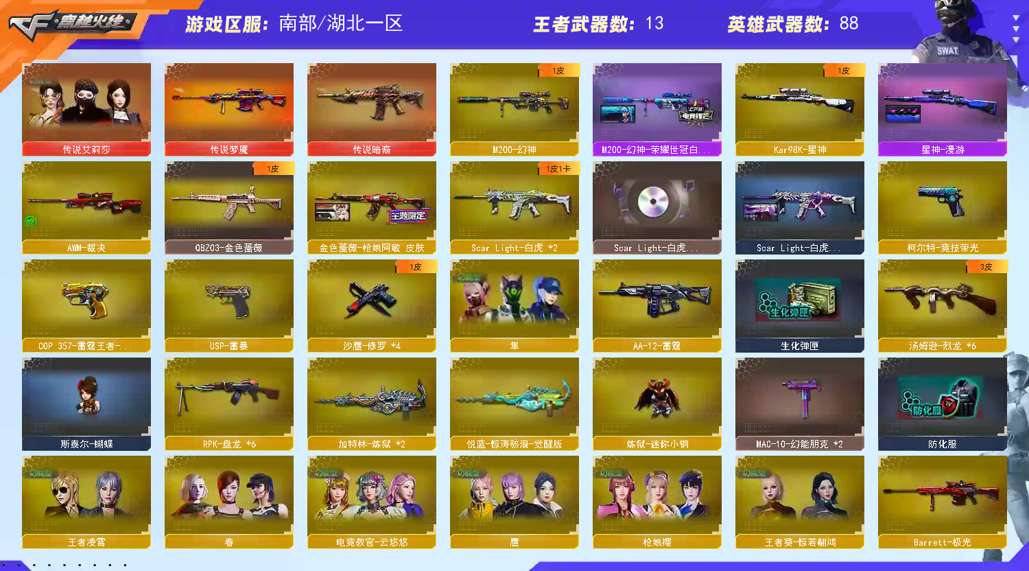 白鲨猫猫手套,竞技荣光套,雷暴套,传说艾莉莎,传说梦魇,传说暗裔,6列6盘,蝴蝶,炼狱小钢,雷神,白虎,QZB金色蔷薇等稀有武器。 自己玩的号,请各位兄弟认真对待每一把游戏,千万别开挂,谢谢!!! 自己玩的号,请各位兄弟认真对待每一把游戏,千万别开挂,谢谢!!! 自己玩的号,请各位兄弟认真对待每一把游戏,千万别开挂,谢谢!!! 重要的事情说三遍!!! 如碰到异常别立即取消订单,我会立即处理问题,异地次数多了容易冻结账号,我会在两分钟之内解决问题。 如碰到异常别立即取消订单,我会立即处理问题,异地次数多了容易冻结账号,我会在两分钟之内解决问题。 如碰到异常别立即取消订单,我会立即处理问题,异地次数多了容易冻结账号,我会在两分钟之内解决问题。 重要的事情说三遍!!!;USP-雷暴,隼,电竞教官-云悠悠,传说艾莉莎,RPK-盘龙,QBZ03-金色蔷薇,M200-幻神,