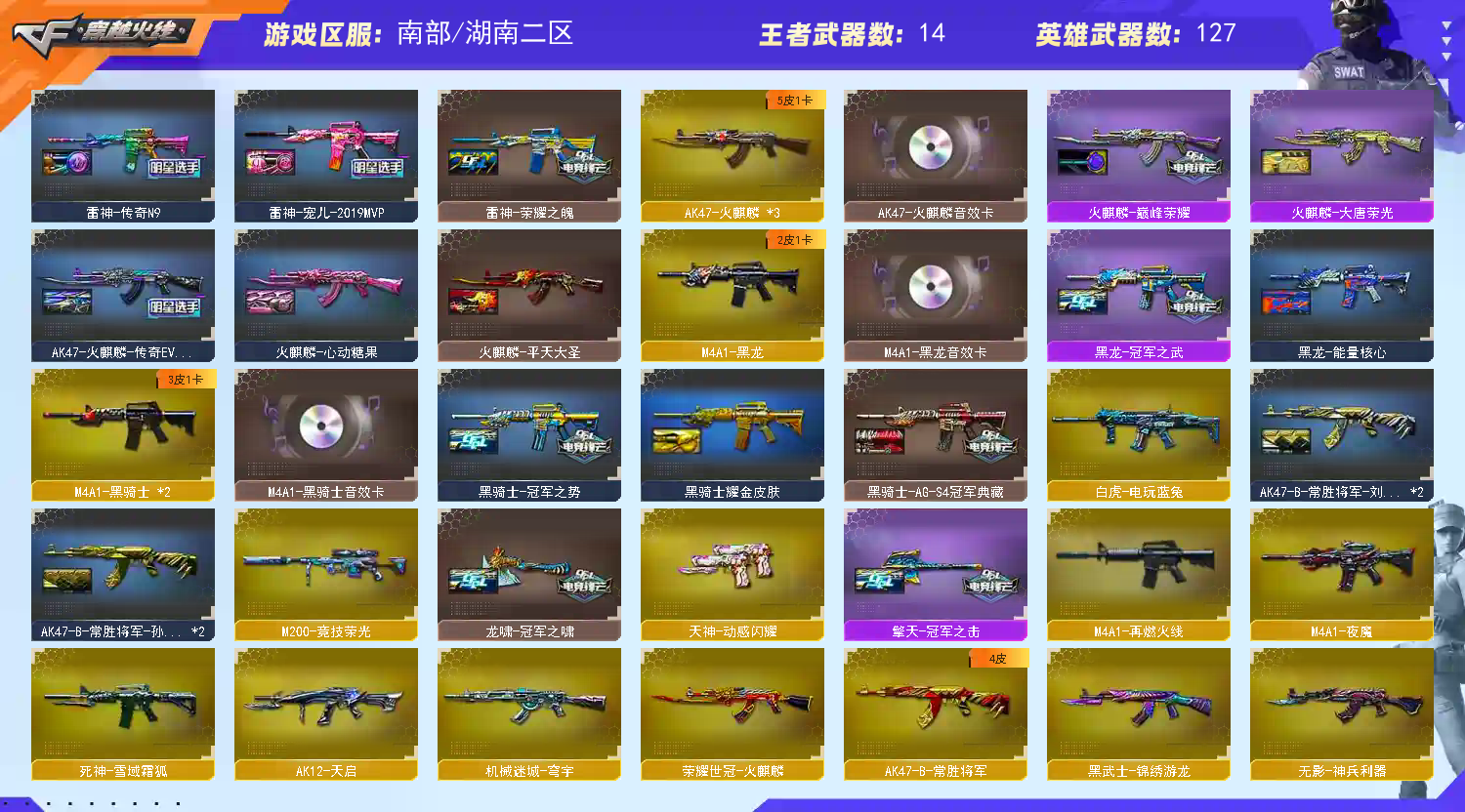 首页 > 租号大厅 > 穿越火线 > 电信区/湖南二区 > 鹰/星神/幻神5皮宠儿+音效/冠军之特之刃:荣耀三件套/白虎/QBZ/幻影/雷暴/竞技荣光/世冠之特