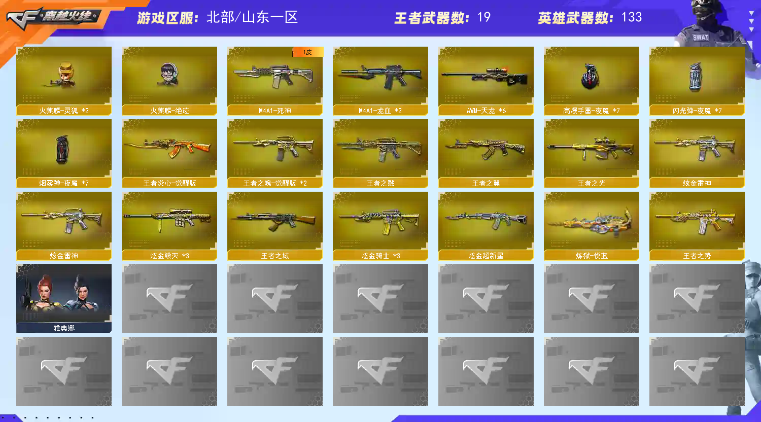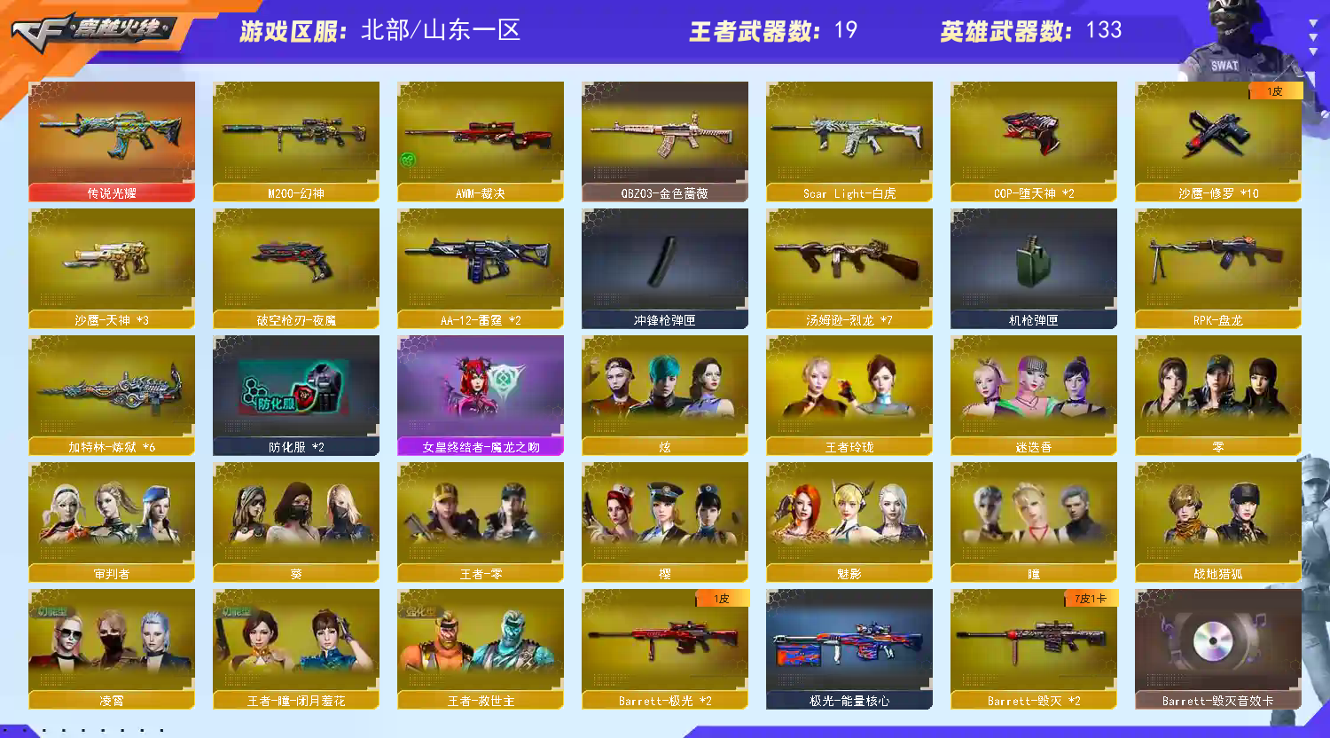 北部高端 133V可排✿传说光耀✿幻神朱雀白虎绝迹全夜魔✿王者炎心玲珑闭月羞花✿音效+冠军赛事轻羽霓裳CFS皮【山东一区登录】【炫金稀有顶1V介意者勿租】【恶意投诉、撤单不想玩了租错号了等非帐号问题1律拉黑】【此号已备案请勿以身试法】 【重要套装】网剧冠军套装/夜魔套装/堕天神套 【重要角色】_凌霄/_迷迭香/魅影/审判者/_瞳/_樱/_零/_炫/_葵/王者-瞳-闭月羞花/王者玲珑/王者-救世主/王者-零/雅典娜/铁骑荣耀/灵狐者-黄金海岸/兰-海滩派对 【传说武器】传说光耀 【英雄武器】_M200-幻神/Barrett-毁灭(2)/Barrett-极光(2)/AWM-天龙(6)/AWM-裁决/M4A1-雷神(2)/M4A1-死神/M4A1-黑龙(9)/M4A1-龙血(2)/M4A1-千变(3)/M4A1-黑骑士(4)/M4A1-武圣/M4A1-夜魔/M4A1-玫瑰精灵(3)/王者之魄-觉醒版(2)/HK417-朱雀/Scar Light-白虎/AK12-天启(2)/AK47-火麒麟(2)/王者炎心-觉醒版/AK47-无影(3)/AK47-黑鲨(3)/AK47-黑武士/黑武士-CF网剧冠军(2)/AK47-机械迷城/AN94-超新星/QBZ03-金色蔷薇/9A91-烈火(10)/RPK-盘龙/汤姆逊-烈龙(7)/AA-12-雷霆(2)/加特林-炼狱(6)/COP-堕天神(2)/沙鹰-天神(3)/天神-CF网剧冠军(2)/沙鹰-修罗(10)/Glock18-武圣/破空枪刃-夜魔/麒麟刺(3)/龙啸/王者之啸-觉醒版/擎天/擎天-CF网剧冠军(2)/屠龙(2)/马来剑-夜魔/高爆手雷-夜魔(7)/烟雾弹-夜魔(7)/闪光弹-夜魔(7) 【王者武器】王者之戮/王者之势/王者之翼/王者之城/王者之光/王者幻神/炼狱-悦蓝/王者之灵(2)/王者之啸 【小人枪】M4A1-雷神-精英刀锋/火麒麟-绝迹/火麒麟-灵狐(2)/C.A.T/M37-葵/降世魔童/迷你深渊冰龙 【其他重要武器】炫金骑士(3)/炫金超新星/炫金雷神/炫金毁灭(3)/炫金天神/M4A1-十二生肖·龙-雷神/激光毁灭者III/AK47-十二生肖-蛇(2)/9A91-赤血龙魂(8)/金色小号/AK47-SS-枪王排位/M14EBR-天羽/黄金AK-47/M4A1-战龙/M4A1-秘银赤龙(5)/AK-47-二次元/AK47-大帝林肯/AK47-轮回(2)/AK-12-CFS2017纪念版/雷神-赛博朋克/AK47-枪娘/AK47-绚樱/AK47-娜塔莎/AWM-黑金/AWM-万圣节刀锋/暗金AWM/AWM-S/AWM-卡通/AWM-恶棍-枪王排位/M200-赤血龙魂/AWM-恶棍/M200-大黄蜂/AWM-枪娘/98K-烛龙/MG4-蓝色骑士/EVOIII-萌杀/EVO III-赤血龙魂(3)/征服者-地狱之火 [Lv Max]/SPAS-12-雷电核心/Spas-12-黑金/新USP-枪王排位奖励(5)/COP 357--绚樱/Cop357-赤龙/Anaconda-黑金神龙/沙鹰-雷蛇/修罗-摸金校尉(2)/COP-金蝉子-枪王排位(2)/新USP-怒火大圣/愤怒公牛左轮-枪王排位(2)/沙鹰-枪王排位/沙漠之鹰-炎龙/蝴蝶刀-枪王排位/斩神刀-御龙/幻影扳手-枪王排位/猫猫手套/唐刀-九五至尊/手雷-能量核心(2)/闪光弹-枪王排位(2)/胜利奖杯手雷-枪王排位 【重要武器皮肤】极光-能量核心/雷神-冠军之魄/黑骑士-冠军之势/毁灭-CFS2020/毁灭-星空/毁灭耀金皮肤/天龙-CFSTAR/雷神-星空/黑龙-暗月/黑龙-能量核心/火麒麟-CFSTAR/火麒麟-轻羽皮肤/无影-霓裳皮肤/无影耀金皮肤/死神-秘银/修罗耀金皮肤/修罗-CFSTAR/修罗-能量核心 【重要光效】Barrett-极光金色光效/M4A1-黑龙金色光效/AWM-天龙蓝色光效/沙鹰-修罗蓝色光效/王者之势紫色光效/M4A1-黑骑士绿色光效 【重要音效卡】M4A1-黑骑士音效卡/M4A1-黑龙音效卡/雷神音效卡/毁灭音效卡/火麒麟音效卡 【重要戒指】龙眼(死神)/龙眼(鹰)/16赛季纪念戒指-枪王耀金/17赛季纪念戒指-耀金/20赛季纪念戒指-耀金/21赛季纪念戒指-耀银(拇指)/22赛季纪念戒指-耀铜(食指)/22赛季纪念戒指-耀银(拇指)/23赛季纪念戒指-耀银(拇指)/24赛季纪念戒指-耀铜(食指)/24赛季纪念戒指-耀银(拇指);RPK-盘龙,QBZ03-金色蔷薇,M200-幻神,Scar Light-白虎,