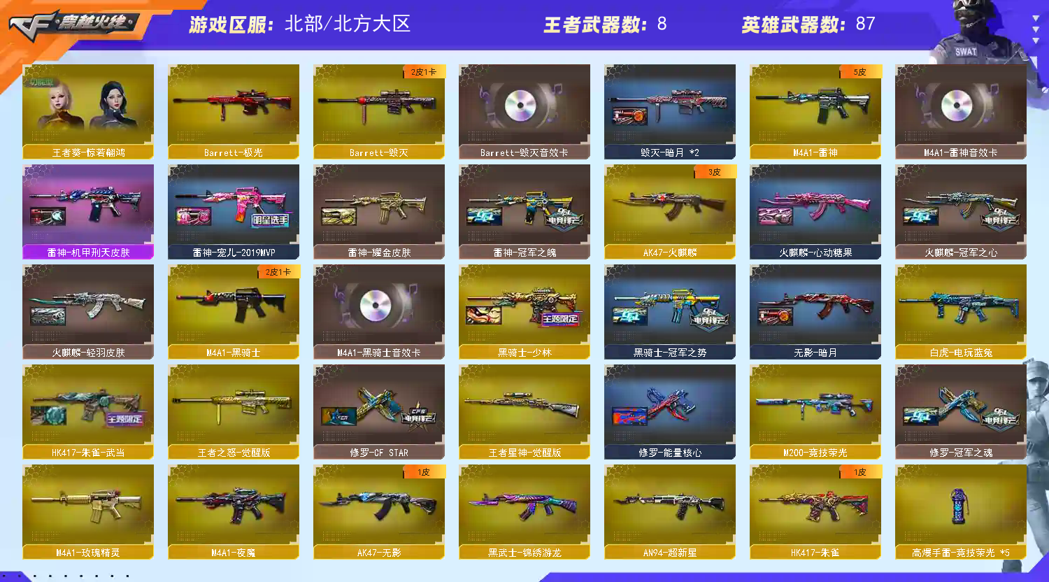 M-幻神降龙皮冠军之微冠军之特之刃序列号王者星神竞技整套3传说白虎带卡6烈6盘斯太尔蝴蝶北部;USP-雷暴,柯尔特-冠军之特,Knife-冠军之刃,电竞教官-云悠悠,RPK-盘龙,QBZ03-金色蔷薇,M200-幻神,