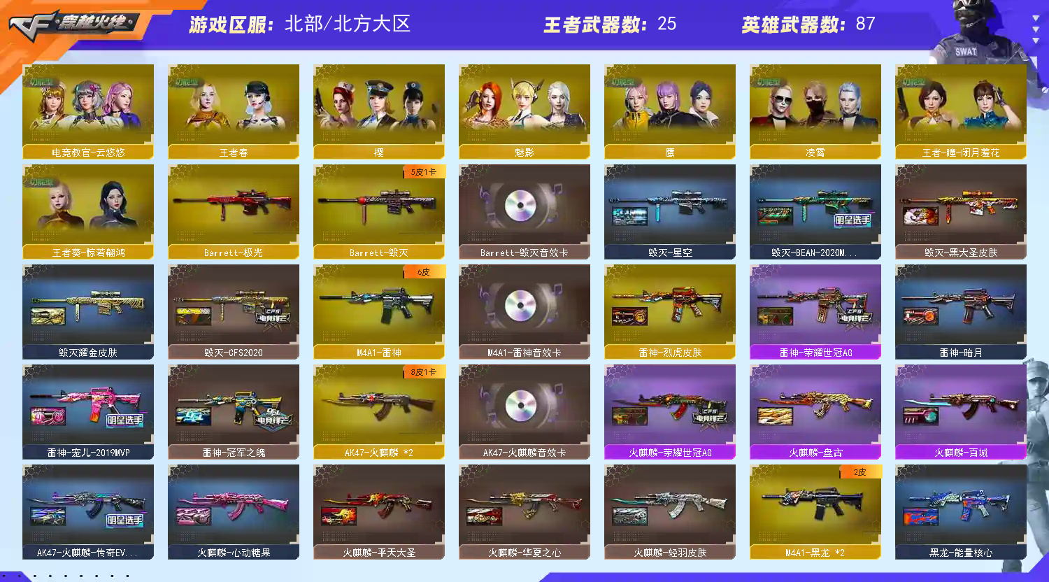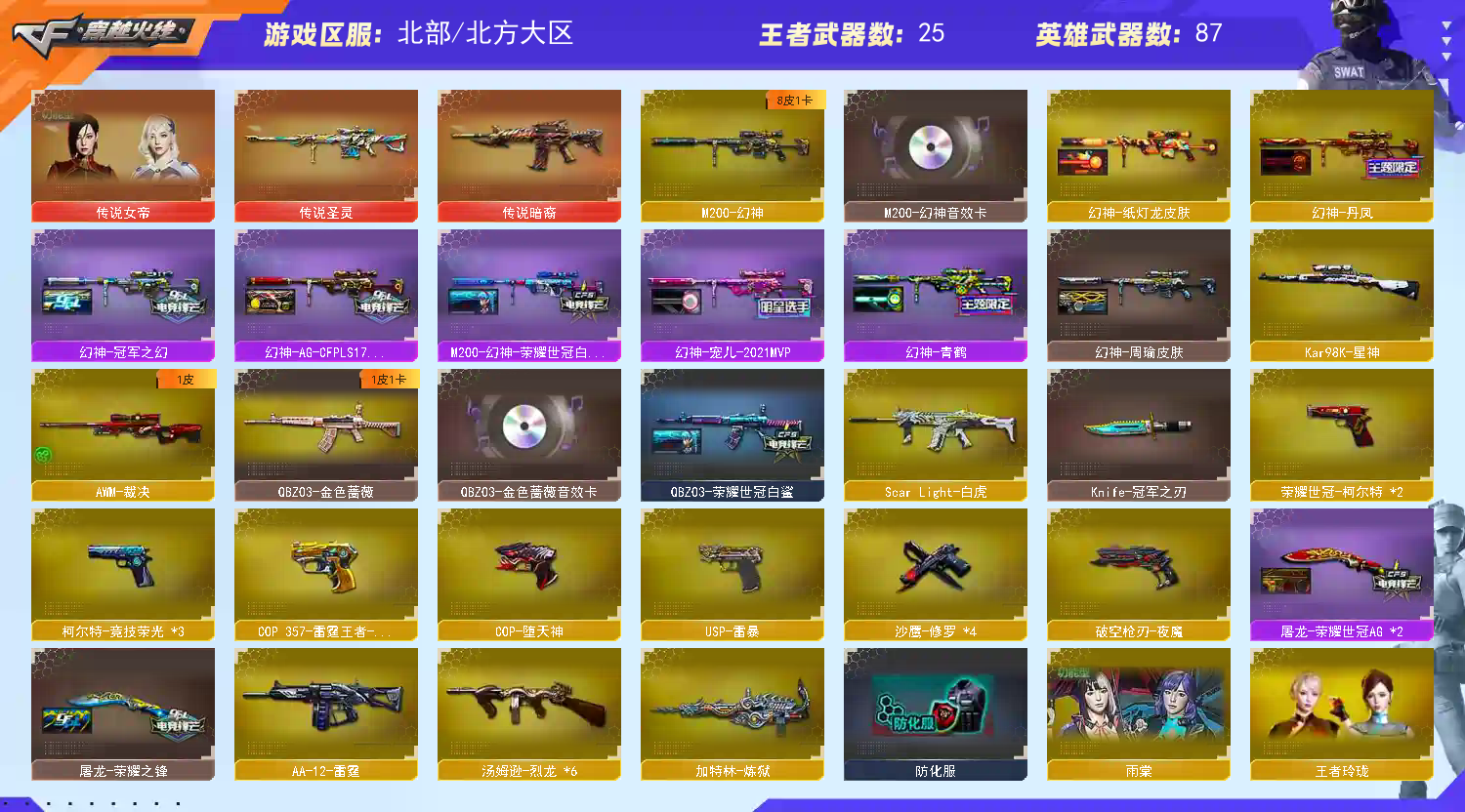 幻神皮肤不少,欢迎收藏体验;USP-雷暴,荣耀世冠-柯尔特,Knife-冠军之刃,传说女帝,电竞教官-云悠悠,QBZ03-金色蔷薇,M200-幻神,