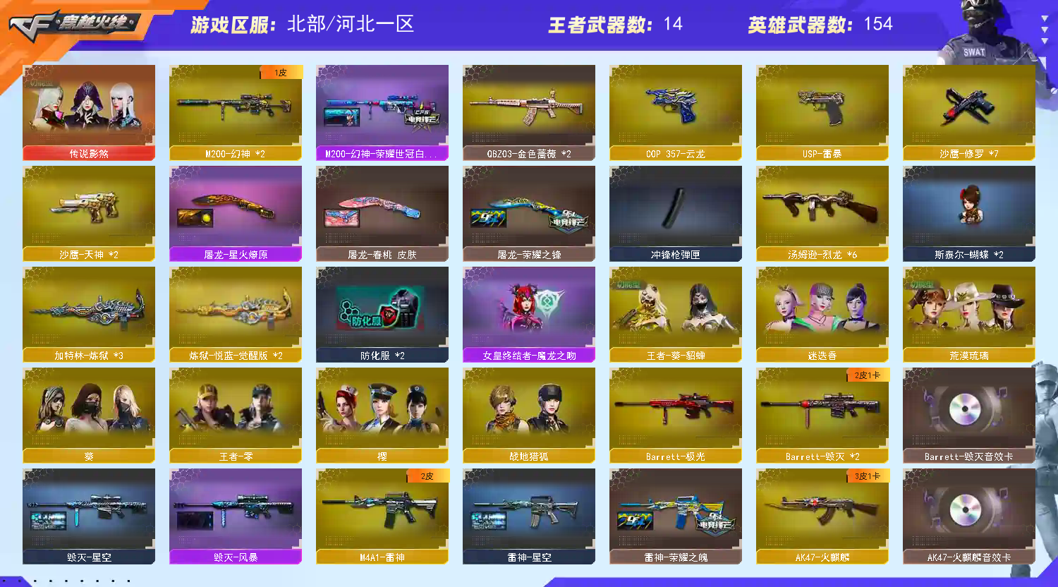 北部号 154V🔥传说影煞/双环神+荣耀/王者风神🔥网剧冠军套🔥巅峰/传奇/战队/星火/春桃皮四防【河北一区登录】【炫金稀有顶1V介意者勿租】【恶意投诉、撤单不想玩了租错号了等非帐号问题1律拉黑】【此号已备案请勿以身试法】【开挂必究账号价值超高】详细武器请看下方 【重要套装】网剧冠军套装/四防角色 【重要角色】传说影煞/_葵/荒漠琉璃/_迷迭香/_樱/王者-葵-貂蝉/王者零-传说之路/王者-零/灵狐者-职业经理/空/零-水下丽影/云海玲珑 【英雄武器】_M200-幻神(2)/Barrett-毁灭(2)/Barrett-极光/Barrett-朱雀/Barrett-暗月传说/王者之光-觉醒版/AWM-天龙/M4A1-雷神/M4A1-黑龙(2)/M4A1-千变/M4A1-黑骑士/M4A1-猎神/M4A1-玫瑰精灵(2)/王者之势-觉醒版/HK417-朱雀/AK12-天启/AK47-火麒麟/AK47-无影(3)/无影-神兵利器/AK47-黑鲨(2)/AK47-黑武士/黑武士-CF网剧冠军/AK-47-猩红传说(34)/AK47-机械迷城/AK47-B-战士/AK47-B-战神/AN94-超新星(3)/QBZ03-金色蔷薇(2)/9A91-烈火/汤姆逊-烈龙(6)/加特林-炼狱(3)/炼狱-悦蓝-觉醒版(2)/COP 357-云龙/沙鹰-天神(2)/天神-CF网剧冠军/沙鹰-修罗(7)/USP-雷暴/麒麟刺/麒麟刺-堕天神(2)/龙啸-堕天神/擎天(6)/擎天-CF网剧冠军/屠龙(2)/雷霆之锋(2)/斩神刀-雷暴/高爆手雷-雷暴(4)/高爆手雷-雷霆(6)/高爆手雷-堕天神(4)/烟雾弹-云龙/烟雾弹-雷暴(4)/烟雾弹-雷霆(6)/烟雾弹-堕天神(4)/闪光弹-雷暴(4)/闪光弹-雷霆(6)/闪光弹-堕天神(4)/黑武士-锦绣游龙/王者风神-觉醒版/烈龙-云海游龙/擎天-云海游龙/手雷-云海游龙 【王者武器】王者之武/王者之魄/王者之翼/王者之怒(3) 【小人枪】火麒麟-灵狐/C.A.T/巴雷特-零-水下丽影/斯泰尔-蝴蝶(2)/COP-白鲨(2)/夺魂/迷你深渊冰龙/魔能飞环-曼陀罗/迷你裂空之翼/迷你生化手雷/闪光弹-小乔 【其他重要武器】炫金黑龙/炫金毁灭/炫金天龙(2)/M4A1-仙界-黑骑士/黑武士-能量核心/火麒麟-能量核心/冰龙粉碎者-白马银枪/激光毁灭者III/金色小号/火麒麟-桃园结义/M4A1-PINK(2)/AK47-SS-枪王排位/M4A1-S-能量核心(2)/AK47-丹龙/M4A1-秘银赤龙/AK47-盛典-CFS 2022/AK47-死亡之翼/M4A1-战龙/黄金AK-47/M4A1-圣诞2021/AK103-神秘黑洞/M200-情人节2019(2)/AWM-涂鸦(2)/M200-圣诞/AWM-万圣节2019(2)/M200-落樱/M200-大黄蜂/AWM-恶棍-枪王排位/AWM-盛典-CFS 2022/M200-朋克/黄金AWM(2)/AWM-7周年/M200-青花瓷/AWM-Pink/M200-赤血龙魂/暗金M200/AWM-万圣节刀锋/M200-神秘黑洞/AWM-深海猎手/末日裁决者/巨龙咆哮Ⅲ/EVO III-赤血龙魂/EVOIII-萌杀/EVO3A1-火线13周年/MK5-枪王排位/EVOⅢ-黑金传说/斯泰尔-巧克力/神圣爆裂者(2)/征服者-毁灭之王 [Lv Max]/神圣爆裂者-末日/SPAS-12-雷电核心/Spas-12-黑金/修罗-年鹏/Anaconda-黑金神龙/沙鹰-雷蛇/沙鹰-枪王排位(3)/COP-金蝉子-枪王排位(2)/COP357-十二生肖·羊/新USP-枪王排位奖励(6)/COP-青帝/幻影沙鹰-枪王排位/COP 357--绚樱/COP 357-万圣节2020/愤怒公牛左轮-枪王排位(2)/啸天/丛林匕首-卧龙(3)/鹰爪-枪王排位(2)/军用铁锹-飞龙在天/丛林匕首-枪王排位/虹光丛林匕首-枪王排位(2)/军用铁锹-赤龙/黄金猫猫手套-白鲨/虹光鹰爪-枪王排位/尼泊尔军刀-战龙/收割者-枪王排位/红色诅咒娃娃手雷/胜利奖杯烟雾弹-枪王排位(2)/胜利奖杯闪光弹-枪王排位/胜利奖杯手雷-枪王排位/闪光弹-枪王排位(4) 【重要武器皮肤】M200-幻神-荣耀世冠白鲨/毁灭-星空/毁灭-风暴/AWM-天龙-传奇70KG/天龙-能量核心/火麒麟-CFSTAR/火麒麟-AG/火麒麟-巅峰荣耀/火麒麟-平天大圣/火麒麟-冠军之心/无影-能量核心/无影耀金皮肤/AK47-黑武士-361/雷神-荣耀之魄/雷神-星空/黑龙-能量核心/M4A1-黑龙-361/战神-流金岁月皮肤/战神-紫绶金章皮肤/战神-粉色甜心皮肤/烈龙-星空/修罗-CFSTAR/屠龙-春桃 皮肤/屠龙-荣耀之锋/屠龙-星火燎原/擎天-秘银 【重要光效】AK47-黑武士金色光效/Barrett-毁灭金色光效/沙鹰-修罗金色光效/炼狱-悦蓝金色光效/王者之光金色光效/王者之怒金色光效/王者之武金色光效/王者之魄金色光效/屠龙蓝色光效/沙鹰-修罗蓝色光效/M200-幻神紫橙光效/王者之势紫色光效 【重要音效卡】M4A1-黑骑士音效卡/Barrett-毁灭音效卡/AK47-火麒麟音效卡 【重要戒指】8周年戒2/龙眼(死神)/龙眼(鹰)/16赛季纪念戒指-枪王耀金/17赛季纪念戒指-耀银/18赛季纪念戒指-耀金/20赛季纪念戒指-耀金/21赛季纪念戒指-耀铜(食指)/21赛季纪念戒指-耀银(拇指)/22赛季纪念戒指-耀铜(食指)/23赛季纪念戒指-耀银(拇指)/24赛季纪念戒指-耀银(拇指)/25赛季纪念戒指-耀铜(食指)/25赛季纪念戒指-耀铜(拇指) 【拥有重要玩偶】;USP-雷暴,传说影煞,QBZ03-金色蔷薇,M200-幻神,