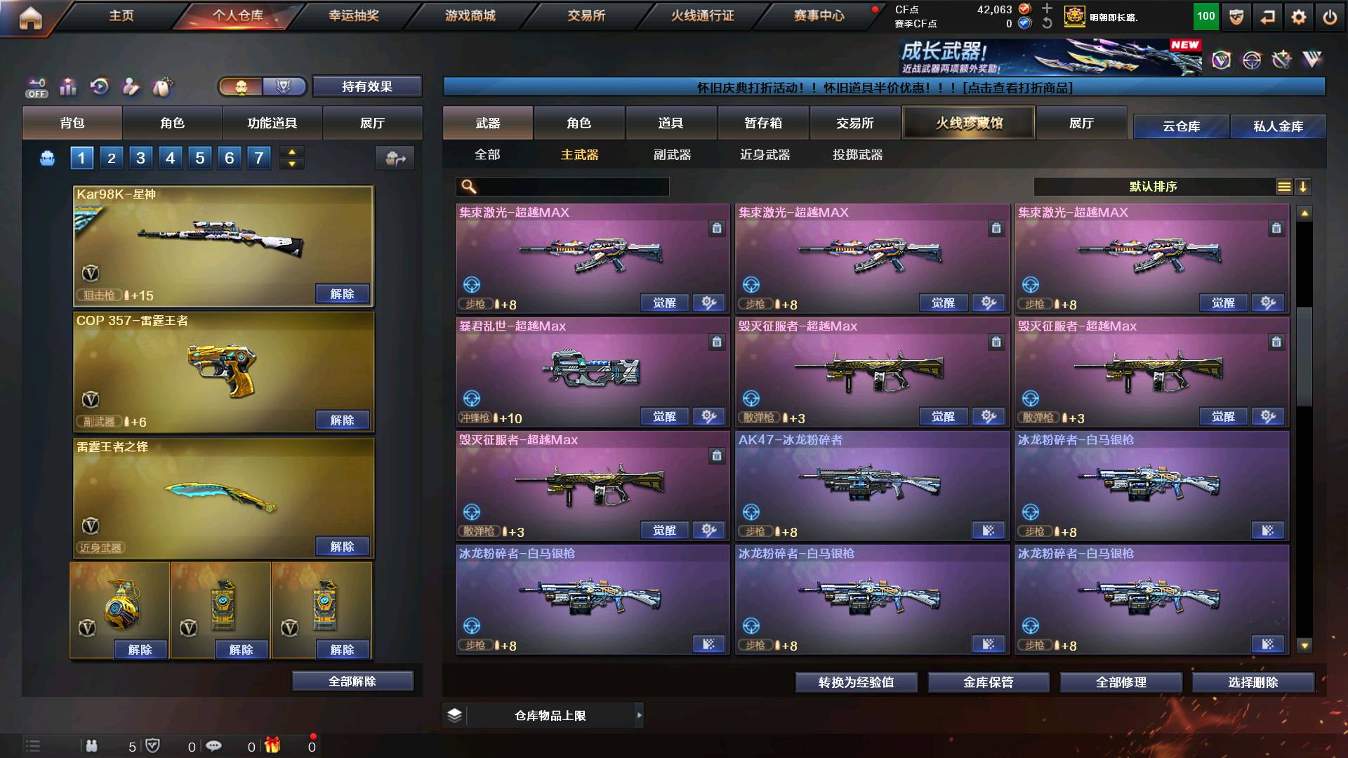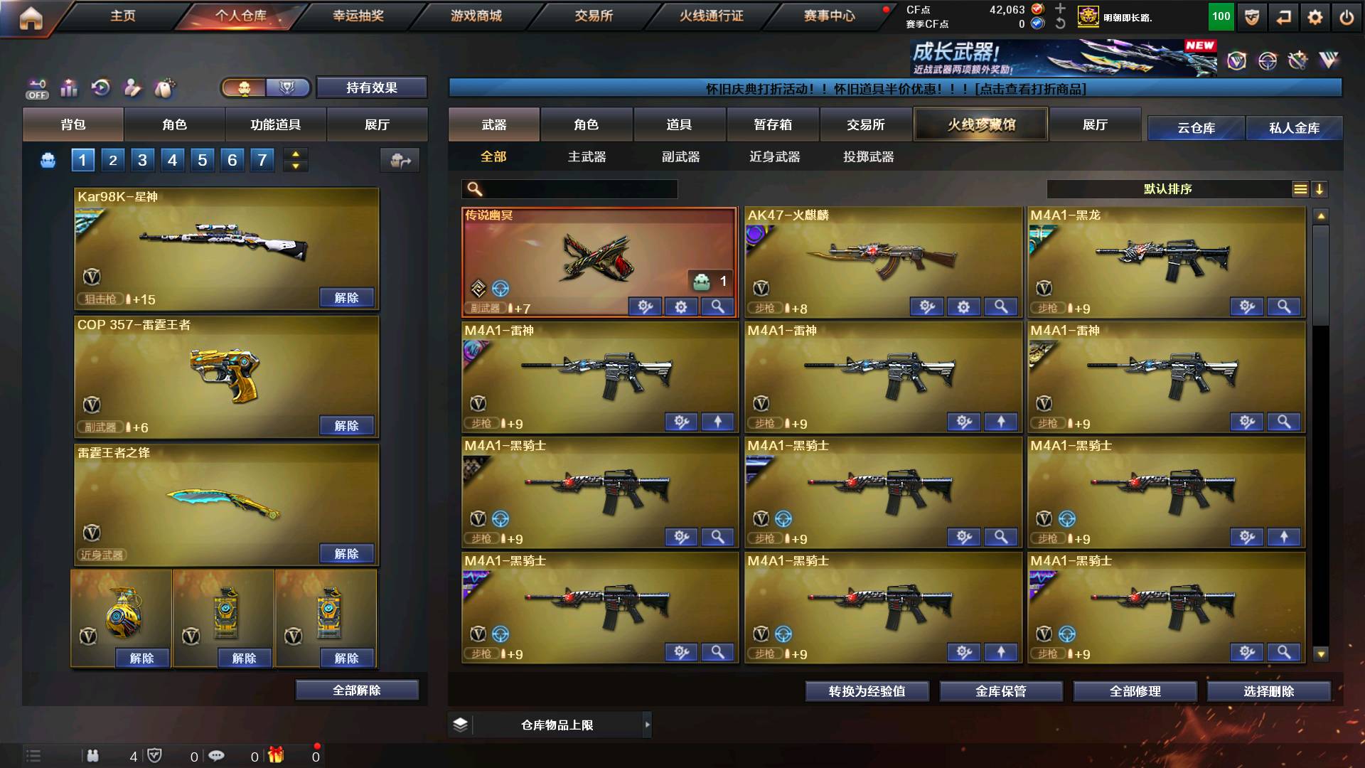 传说幽冥|王者风神|星神|竞技荣光套装|荣耀世冠套装|雷霆王者套|七套手雷|四防隼|白鲨黄金猫猫手套|交易所稀有近战武器|王者蔷薇|王者雷霆|王者凤吟|金蚀|天罚|六白虎|玄武|毁灭+音效卡|雷神N9+耀金皮|荣耀世冠火麒麟龙啸|超新星|黑骑士王者雷霆之锋||七王者雷霆手雷套|王者炫|华|六烈龙蝴蝶生化满配|时空猎手皮肤女皇皮肤|七致命一击|七暴击玩偶|七无尽玩偶|无尽满配符文|探险模式九阶段高刷新属性|吸血戒指|连杀戒指|暴君乱世3+3|2集术超越激光3+3|征服者3+3|;荣耀世冠-柯尔特,传说幽冥,隼,QBZ03-金色蔷薇,Scar Light-白虎,Kar98K-星神,