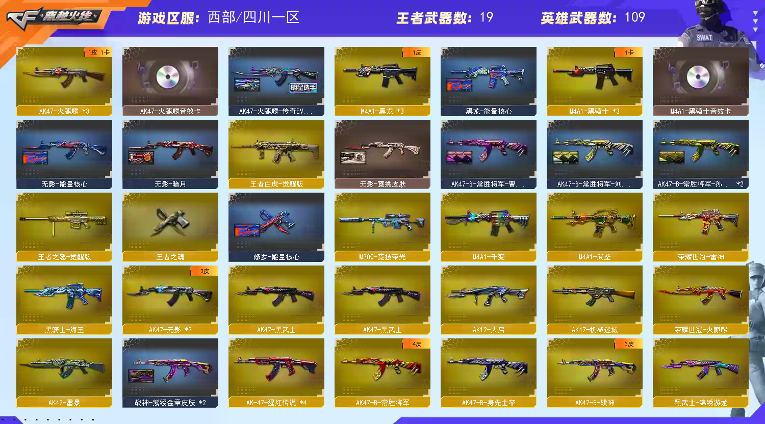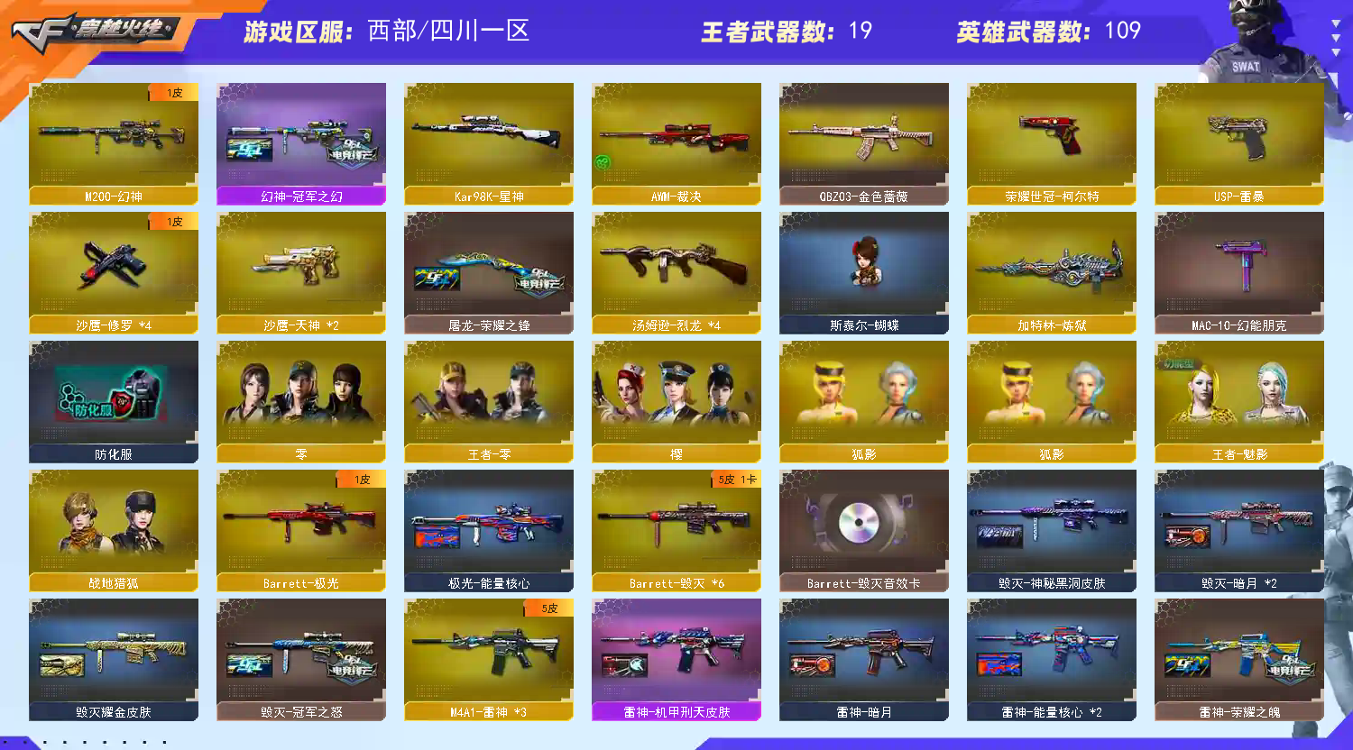 幻神+冠军之幻皮肤/98K星神/M200竞技荣光/王者白虎/荣耀世冠套装(火麒麟+雷神+柯尔特+龙啸)/千变/火麒麟/黑龙/雷神/黑骑士/无影/死神/黑武士/天启/超新星/机械迷城/qbz03金色蔷薇/天龙/毁灭/极光/裁决/4烈龙+斯泰尔蝴蝶/炼狱/等等 王者火魄/王者之光/王者之魄/王者之势/王者之力/王者之怒/王者之啸/王者之魂/王者之锋/王者之击/炫金超新星/炫金骑士/炫金千变/炫金天龙/炫金黑龙/炫金毁灭/等等 王者魅影(四防属性)/灵狐者职业经理(四防属性)/零/樱/灵狐者-黄金海岸/灵狐者-七夕宝贝/职业选手/XROCK战队炫彩背包/超级对讲机永久 USP雷暴/荣耀世冠-柯尔特/4修罗/2天神/COP白鲨等等 4屠龙/3龙啸/5擎天/擎天-竞技荣光/3麒麟刺/尼泊尔-雷霆/斩神刀-雷暴/荣耀世冠-龙啸/擎天-惨叫迹/蝴蝶刀等等 火麒麟音效卡/毁灭音效卡/黑骑士音效卡/N9语音包 幻神-冠军之幻/雷神-荣耀之魄/毁灭-冠军之怒/屠龙-荣耀之锋/火麒麟-传奇EVEN/火麒麟-雷神/雷神-机甲刑天/毁灭-耀金/等等;USP-雷暴,荣耀世冠-柯尔特,QBZ03-金色蔷薇,M200-幻神,Kar98K-星神,