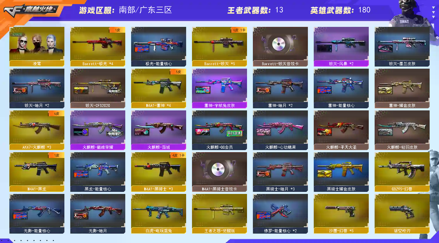 【重要套装】四防角色/电竞装甲套装/幻兽套装/夜魔套装/雷暴套装 【重要角色】炫/凌霄/晴雅/樱/_蝴蝶_/葵/王者-零/葵-赛博朋克/灵狐者-黄金海岸 【传说武器】传说夜影/传说灵眸 【英雄武器】_M200-幻神(2)/Barrett-毁灭(5)/Barrett-极光(4)/Barrett-电竞装甲/barrett-金色蔷薇/Barrett-暗月传说/王者之怒-觉醒版/王者之光-觉醒版/AWM-天龙(3)/AWM-裁决(2)/M4A1-雷神(4)/M4A1-黑龙/M4A1-千变(2)/M4A1-黑骑士(3)/黑骑士-海王(2)/M4A1-武圣(2)/M4A1-夜魔/王者冰魄-觉醒版/王者之幻-觉醒版/白虎-电玩蓝兔/QBZ95-幻兽/AK47-火麒麟(3)/AK47-无影/无影-神兵利器/AK47-雷暴/AK47-黑鲨/AK-47-猩红传说(3)/AK47-B-身先士卒/AK47-B-战士/AK47-B-战神/AN94-超新星/QBZ03-金色蔷薇/王者之鲨-觉醒版/9A91-烈火(2)/汤姆逊-烈龙(9)/加特林-炼狱/炼狱-风暴/COP-堕天神(3)/雷霆之契/沙鹰-天神(2)/沙鹰-修罗(2)/沙鹰-幻兽(5)/王者之魂-觉醒版/_破空枪刃_/破空枪刃-夜魔(2)/柯尔特-电竞装甲(2)/USP-雷暴/麒麟刺/麒麟刺-堕天神/龙啸/擎天/擎天-竞技荣光/王者之击-觉醒版/屠龙(3)/雷霆之锋/尼泊尔-电竞装甲/马来剑-夜魔/女皇利刃-幻兽/斩神刀-雷暴/高爆手雷-幻兽(5)/高爆手雷-幻灵/高爆手雷-雷暴(4)/高爆手雷-雷霆(4)/高爆手雷-夜魔(7)/高爆手雷-堕天神/高爆手雷-竞技荣光/烟雾弹-幻兽(5)/烟雾弹-雷暴(4)/烟雾弹-雷霆(4)/烟雾弹-夜魔(7)/烟雾弹-堕天神/烟雾弹-竞技荣光/烟雾弹-电竞装甲(5)/恶棍-电竞装甲(5)/闪光弹-幻兽(5)/闪光弹-雷暴(4)/闪光弹-雷霆(4)/闪光弹-夜魔(7)/闪光弹-堕天神/闪光弹-竞技荣光/闪光弹-电竞装甲(5) 【王者武器】王者霜心/王者之影/王者之力/炼狱-悦蓝/王者之击 【小人枪】火麒麟-灵狐/海滩汪汪-巴雷特/斯泰尔-蝴蝶/迷你深渊冰龙(3)/闪光弹-小乔/生化手雷-机甲核心/深渊终结者手雷(2)/灵狐娃娃手雷 【其他重要武器】炫金雷神(2)/炫金毁灭/炫金天龙/黑骑士-摸金校尉/M4A1-英雄-能量核心/火麒麟-能量核心/AK47-冰龙粉碎者/激光毁灭者III(2)/AK47-泰坦破坏者III/激光毁灭者III-白马银枪/M4A1-秘银赤龙/M4A1-狂欢-CFS/海浪AK47-浏览器/雷神-赛博朋克/9A91-蓝色骑士/M4A1-电音/M4A1-XS-翔龙/M4A1-战龙/M4A1-樱落/AK47-肯德基/M4A1-肯德基/AK12-幽灵/AK47-青龙/AK47-B-十周年/M4A1-樱(2)/AK47-万圣节2018/联想锋行黄金AK/AK47-圣诞节[2019]/AK47-绚樱/AK47-破空冰刃(2)/AK47-狂欢-CFS/AK47枪王排位II/9A91-赤血龙魂/AK47-十二生肖-蛇/火麒麟-桃园结义/AK47-十年火线/AK47-SS-枪王排位/HK417-红龙/百城AK47(2)/M4A1-XS-耀龙/黄金AK-47/M4A1-水枪-机甲核心/QBZ03-锋芒破茧/M14EBR-朋克/QBZ03-街机/AK47-QT/红龙AK47/AK47-雷蛇/M4A1-S-能量核心/M4CQBR-AP-孔明(2)/AK47-枪娘/AK-103-火线13周年/AK47-娜塔莎/AK47-大帝林肯/G3A3-SS-枪王排位/M14EBR-CFS 2020/M4A1枪王排位II/M14EBR-赤血龙魂/AK47-苍龙/凤凰之魂/AK47-死亡之翼/AK47-齐天大圣/M4A1-破空冰刃/M4A1-紫狱/百城M4A1/AK47-朋克/AN94-青花瓷/神罚/蓝色魅影(3)/98K-烛龙/M200-大黄蜂/98K-蓝色骑士/AWM-圣诞/凤凰之力/FN弩炮-CFS2017纪念版/Barrett-炎龙/M200-牡丹/破天狂龙/M200-万圣节2018/AWM-十周年/AWM-A/AWM-万圣节2019/AWM-2018圣诞/Barrett-赤龙/M200-赤血龙魂(2)/AWM-恶棍-枪王排位/AWM-万圣节刀锋/AWM-S/暗金M200/Barrett-耀龙/AWM-蓝水晶/M200-涂鸦/AWM-A枪王排位II/AWM-Pink/AWM-卡通/黄金AWM/双面神/凤凰之怒/M200-萌杀/AWM-Red/AWM-恶棍/M200-青花瓷(2)/M82A1-红龙/M200-朋克/雷蛇AWM(2)/Barrett-苍龙/AWM-CFS 2020/98K-炫彩/Barrett-孔明/M200-青帝/AWM-红色悦动/AWM-A-圣诞2021/98K-火线13周年/M200 CheyTac-大圣/M82A1-夏日/Barrett-捣乱兔兔/M200-庆典-CFS 2021/M82A1-飞龙在天/百城AWM/KAC-圣炎切割者III/巨龙咆哮Ⅲ/MG4-蓝色骑士/KAC-耀龙/M240B-卡通/KAC-小动物/斯泰尔-巧克力/EVOⅢ-黑金传说/MK5-圣诞/斯泰尔-CFS2017纪念版/Steyr TMP-CFS2020纪念版/EVOIII-萌杀/斯太尔-能量核心/P90-炫彩/SPAS-12-雷电核心/AA-12-圣龙/阐释者III/Cop357-赤龙(2)/愤怒公牛左轮-枪王排位/凤凰之灵/COP 357--绚樱/Anaconda-万圣节2019/Anaconda-炽焰核心/COP357-十二生肖·羊/COP-十二生肖-蛇/Anaconda-黑金神龙/修罗-摸金校尉/新USP-枪王排位奖励(4)/幻影沙鹰-枪王排位/COP 357-子鼠/Cop357-萌杀/迷彩沙鹰-70KG/蟒蛇-炫彩/MAC-10-幻能朋克(2)/COP357-朋克(2)/COP-机甲刑天/沙鹰-青龙/沙鹰-雷蛇/沙鹰-能量核心/COP-青帝/新USP-怒火大圣/毛瑟-庆典-CFS 2021/柯尔特-百城/COP-金蝉子-枪王排位/金刚伞-电玩红兔/猫猫手套/收割者-枪王排位/幻影扳手-枪王排位/尼泊尔军刀-9周年/唐刀-九五至尊/军用铁锹-赤龙/丛林匕首-枪王排位/丛林匕首-卧龙/幻影双斧-枪王排位/军用铁锹-飞龙在天/无畏之矛/雷神之怒-机甲核心/虹光女皇利刃-枪王排位/军用手斧-能量核心/虹光鹰爪-枪王排位/尼泊尔-庆典-CFS 2021/尼泊尔军刀-战龙/蝴蝶刀-枪王排位/虹光丛林匕首-枪王排位/闪光弹-枪王排位(2)/胜利奖杯手雷-枪王排位(2)/红色诅咒娃娃手雷/胜利奖杯闪光弹-枪王排位(2)/胜利奖杯烟雾弹-枪王排位(3)/手雷-能量核心/烟雾弹-机甲核心 【重要武器皮肤】M200-幻神-黄忠皮肤/M200-幻神-荣耀世冠白鲨/极光-能量核心/龙啸-冠军之啸/毁灭-CFS2020/毁灭-墨兰皮肤/毁灭-暗月/毁灭-风暴/巴雷特SV皮肤/天龙-秘银/天龙-能量核心/雷神-耀金皮肤/雷神-宇航兔皮肤/雷神-暗月/雷神-能量核心/黑骑士耀金皮肤/黑骑士-暗月/黑龙-暗月/黑龙-能量核心/M4A1-千变-孔明皮肤/火麒麟-AG战队皮肤/火麒麟-CFSTAR/火麒麟-回员/火麒麟-巅峰荣耀/火麒麟-平天大圣/火麒麟-心动糖果/火麒麟-百城/火麒麟-轻羽皮