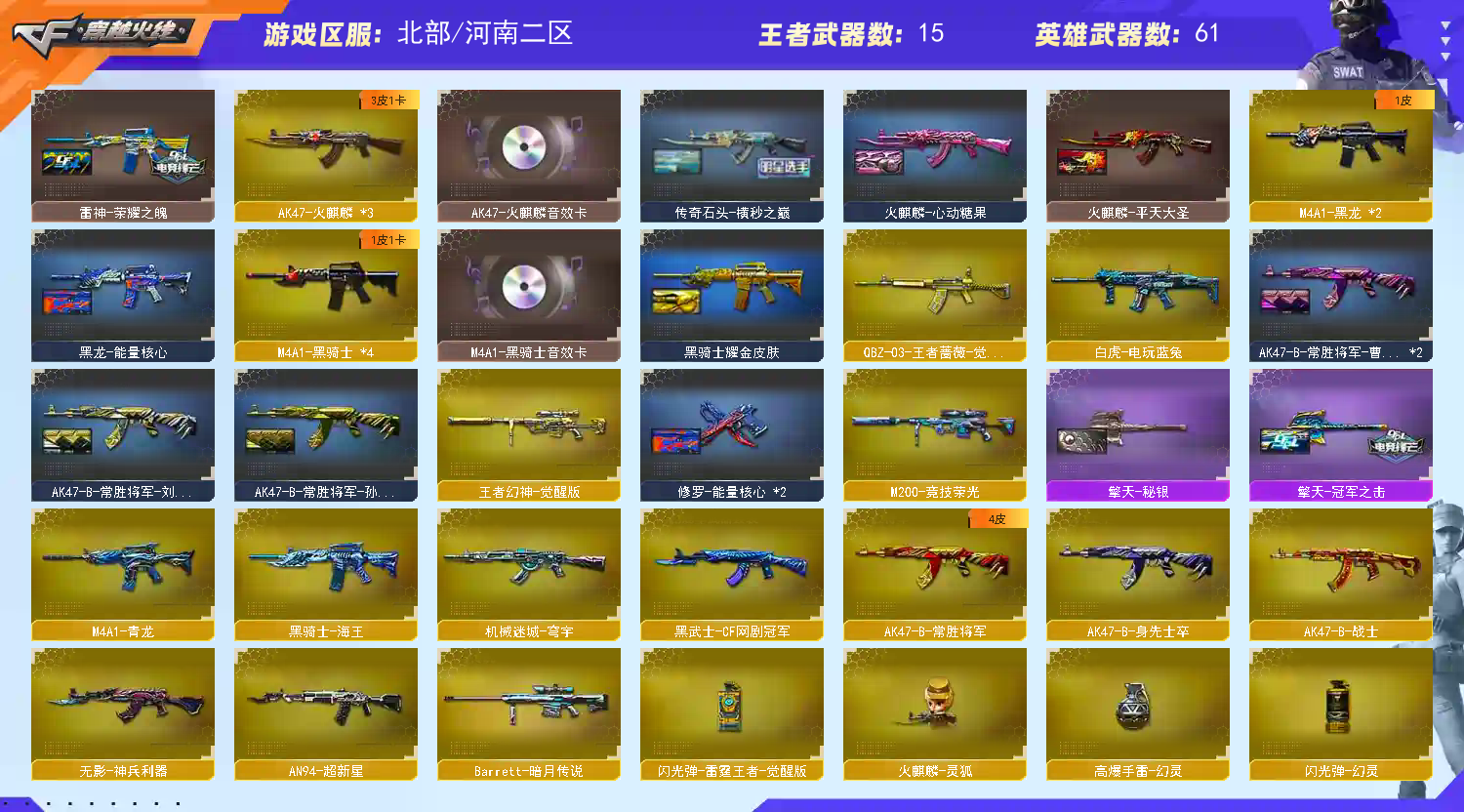 ❤️爆破质量皮肤号🏆68v❤️ ✨稀有枪械:幻神、白虎、王者冰魄、王者幻神、王者QBZ、QBZ吕布、M200竞技荣光 ✨枪械皮肤:🏆幻神(音效):周瑜 🏆火麒麟(音效):横秒之巅、平天大圣、雷神 🏆雷神(音效):荣耀、冠军 🏆毁灭(音效):SV、星空 🏆黑骑士(音效):耀金 🏆黑龙(音效):能量核心 🏆修罗:耀金、能量核心 🏆屠龙:荣耀 🏆擎天:冠军、秘银 ✨英雄级副武器:COP-王者雷霆*1、竞技荣光柯尔特*1、USP-雷暴*1、 ✨音效卡:幻神、火麒麟、雷神、QBZ、毁灭、黑骑士 ✨小人枪:火麒麟-绝技、火麒麟-灵狐、裁决-雪莉杨、斯太尔-蝴蝶、M4A1-雷神-精英刀锋 ✨年套:竞技荣光、幻灵、王者雷霆 ✨四防角色:传说女帝、电竞教官-云悠悠、王者春、王者魅影、职业经理、迷迭香、王者-瞳-闭月羞花、魅影;USP-雷暴,传说女帝,电竞教官-云悠悠,RPK-盘龙,QBZ03-金色蔷薇,M200-幻神,Scar Light-白虎,